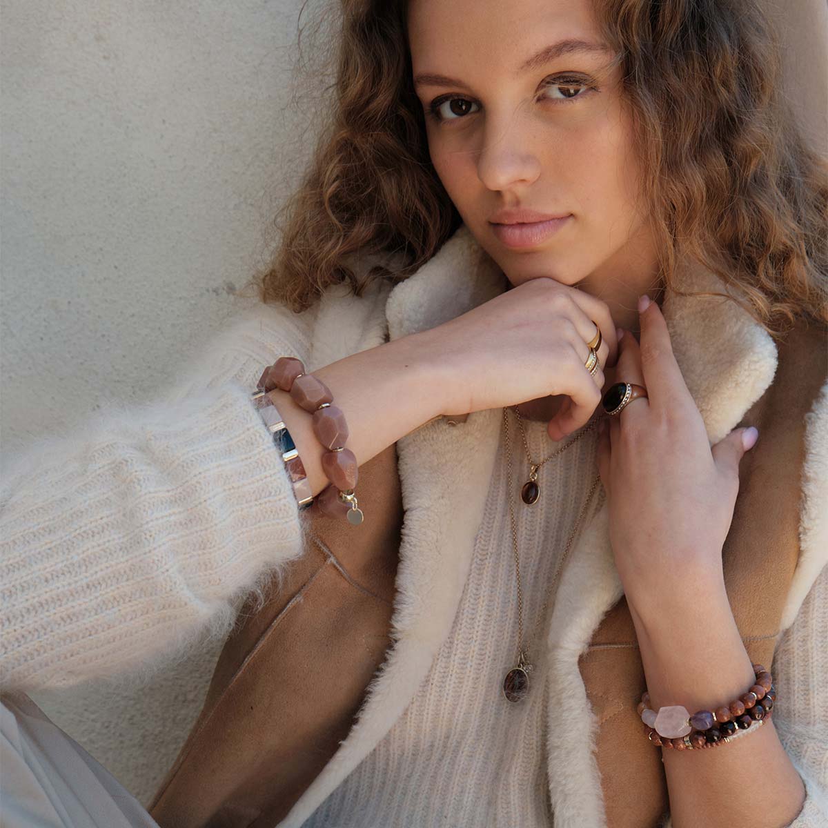 Kolleksjonen Sophistication: Smykker dekorert med håndslipt glass i dyp sofistikert farge Maroon, som betyr kanstanje og med glitrende krystalldetaljer.