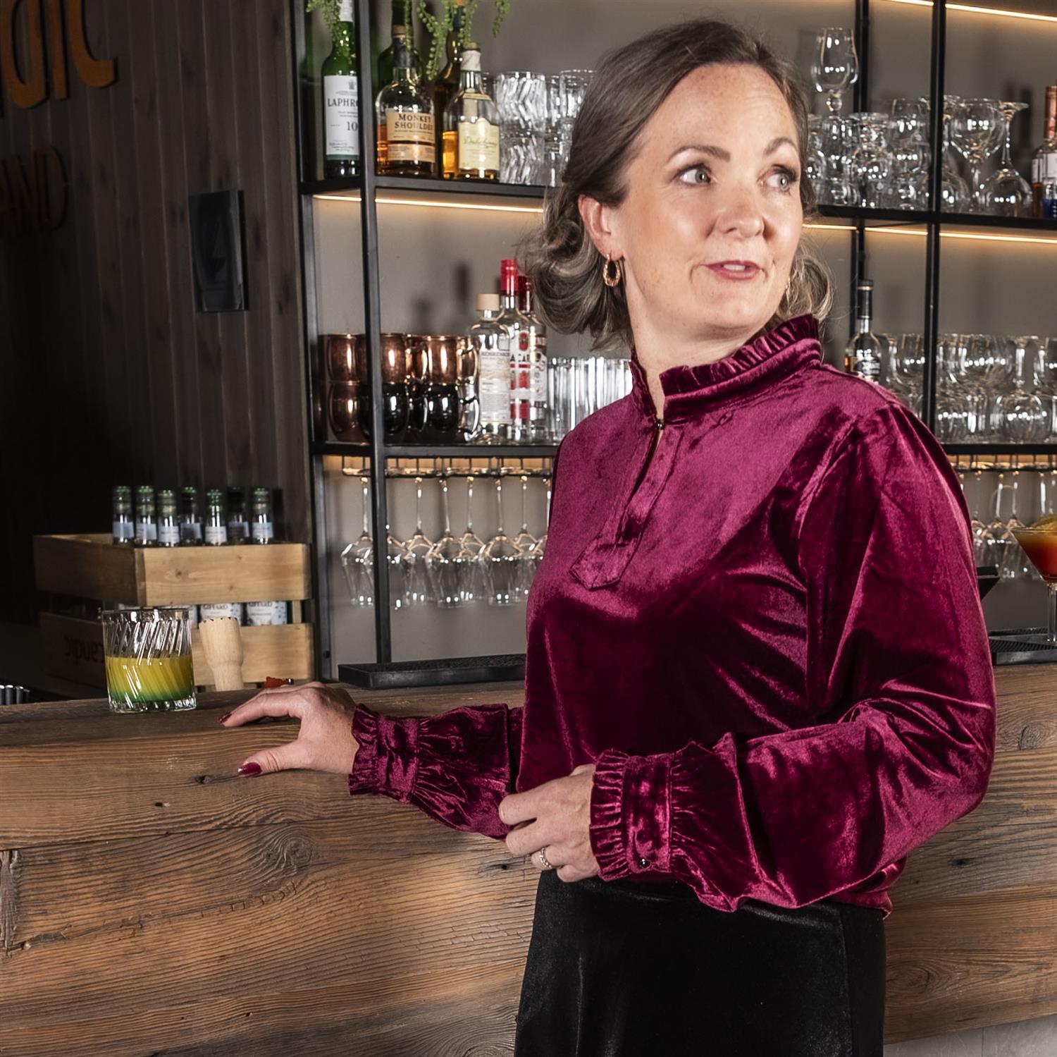 Vakker velourbluse i myk og skimrende kvalitet. Halvpolo med volang, og delikat knapp i utrigningen samt på mansjettene som gir det lille ekstra ekslusive preget.