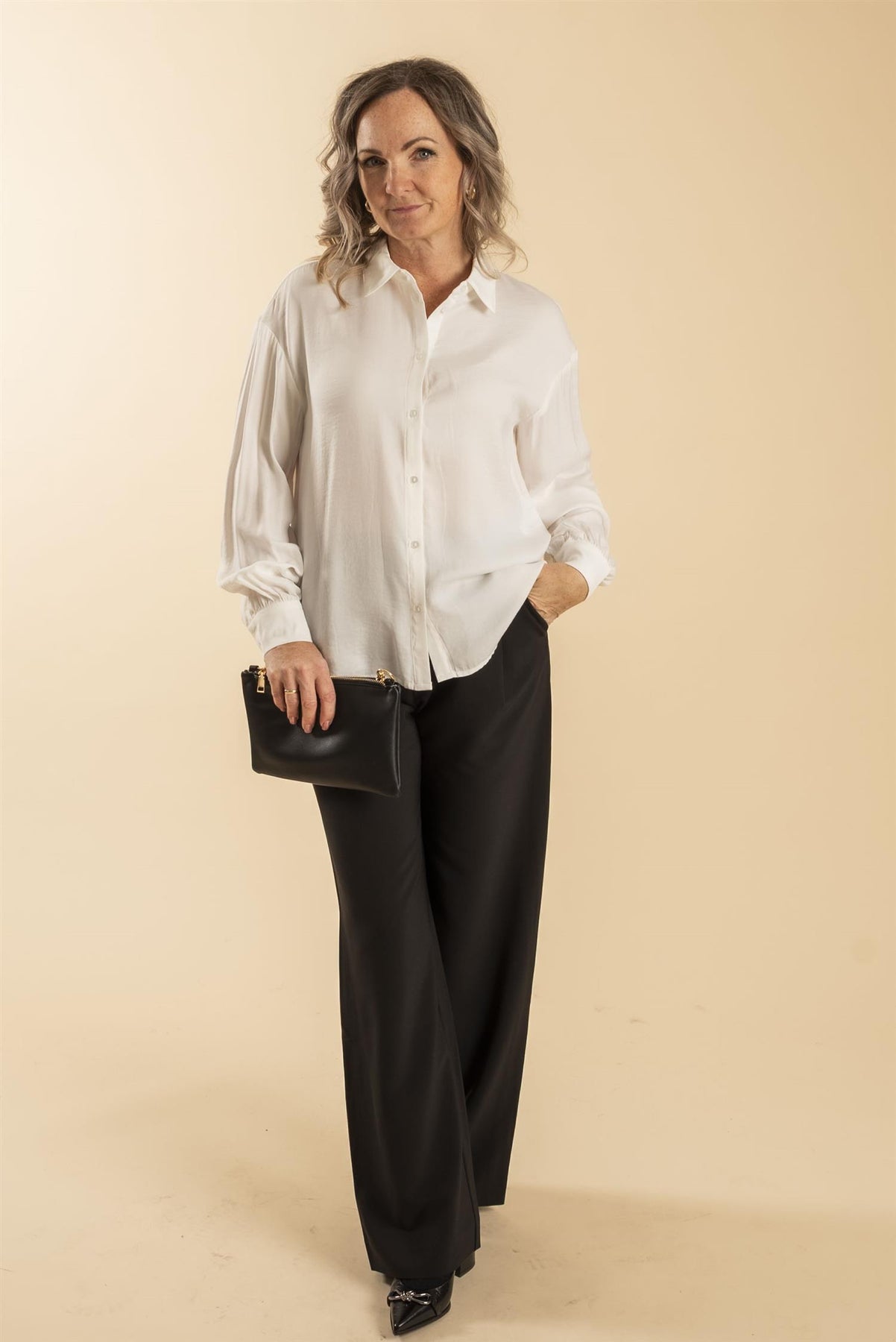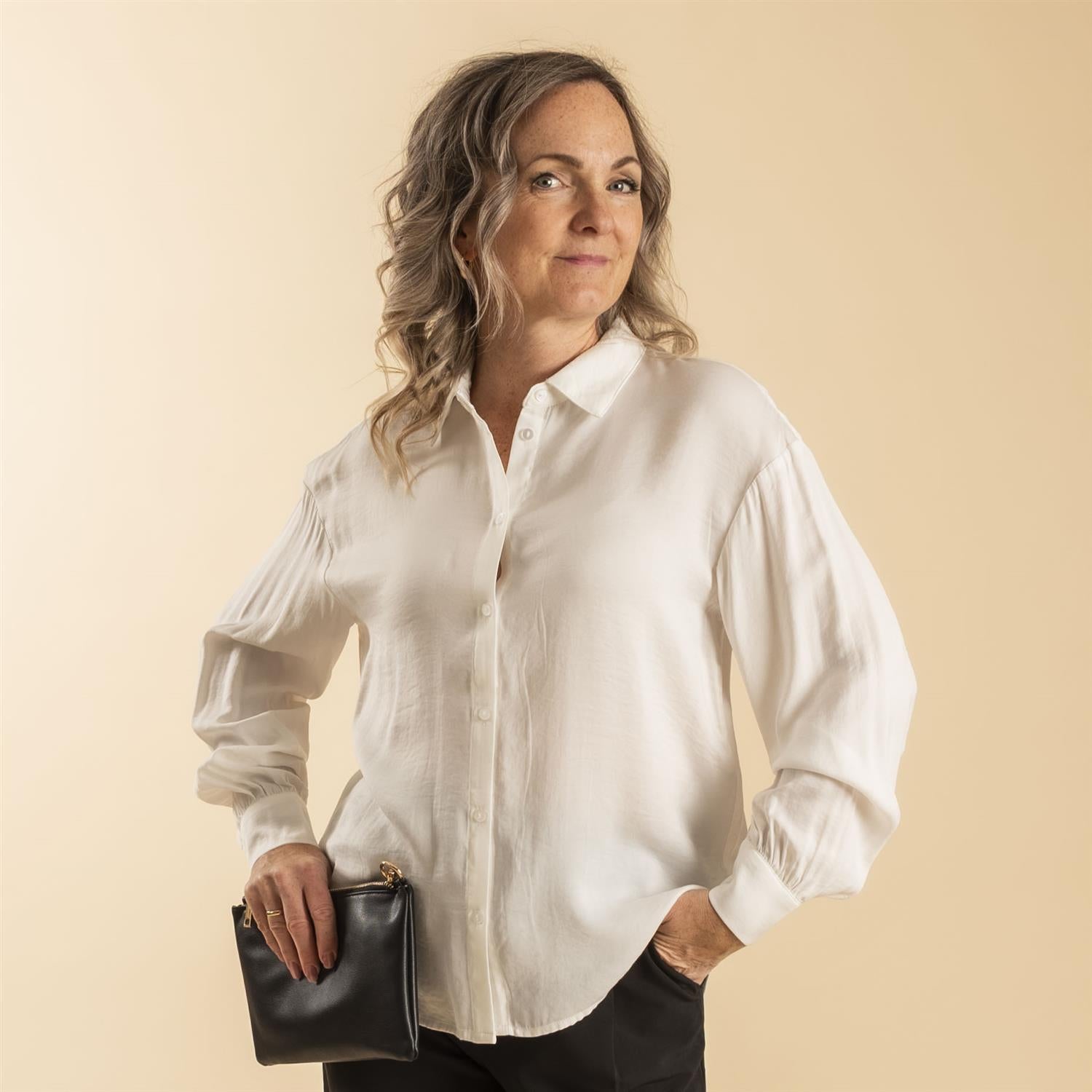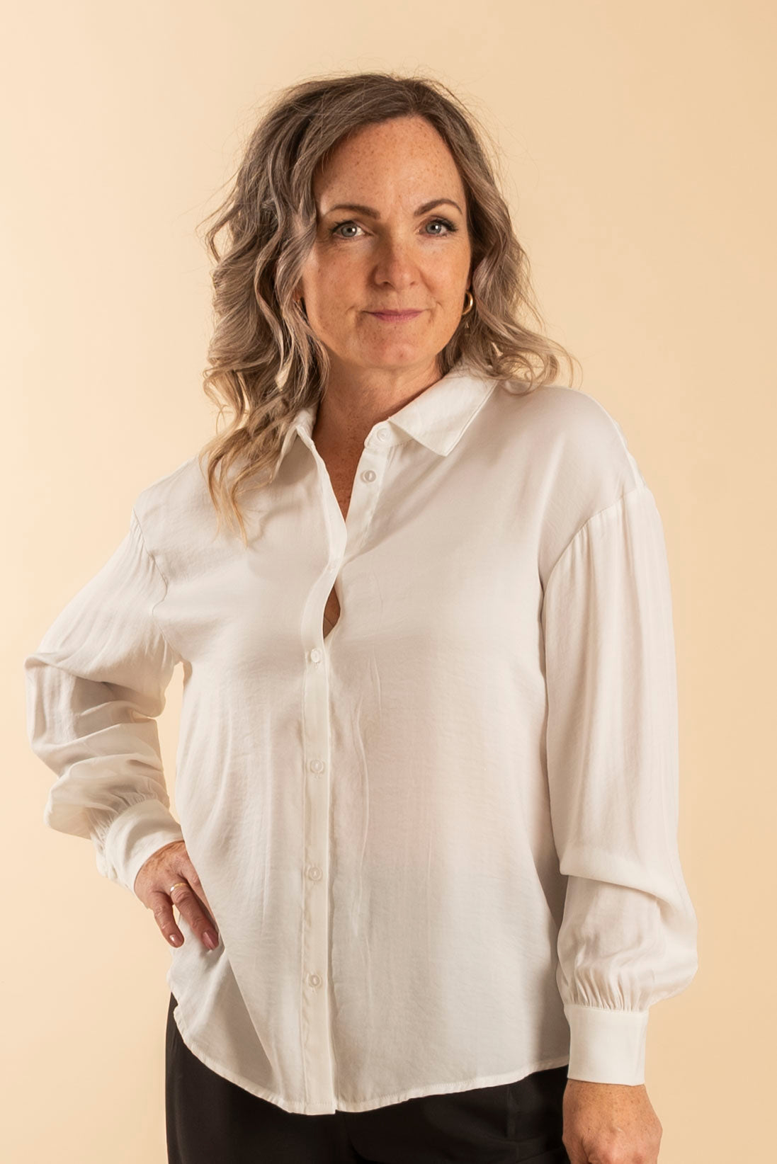 Denne sateng-skjorten er virkelig en klassiker som aldri går av moten. Den har en regular fit, perfekt for å kombinere med favorittjeansene dine for en avslappet look, eller stukket inn i et høytlivsskjørt eller -bukser for en mer sofistikert stil.