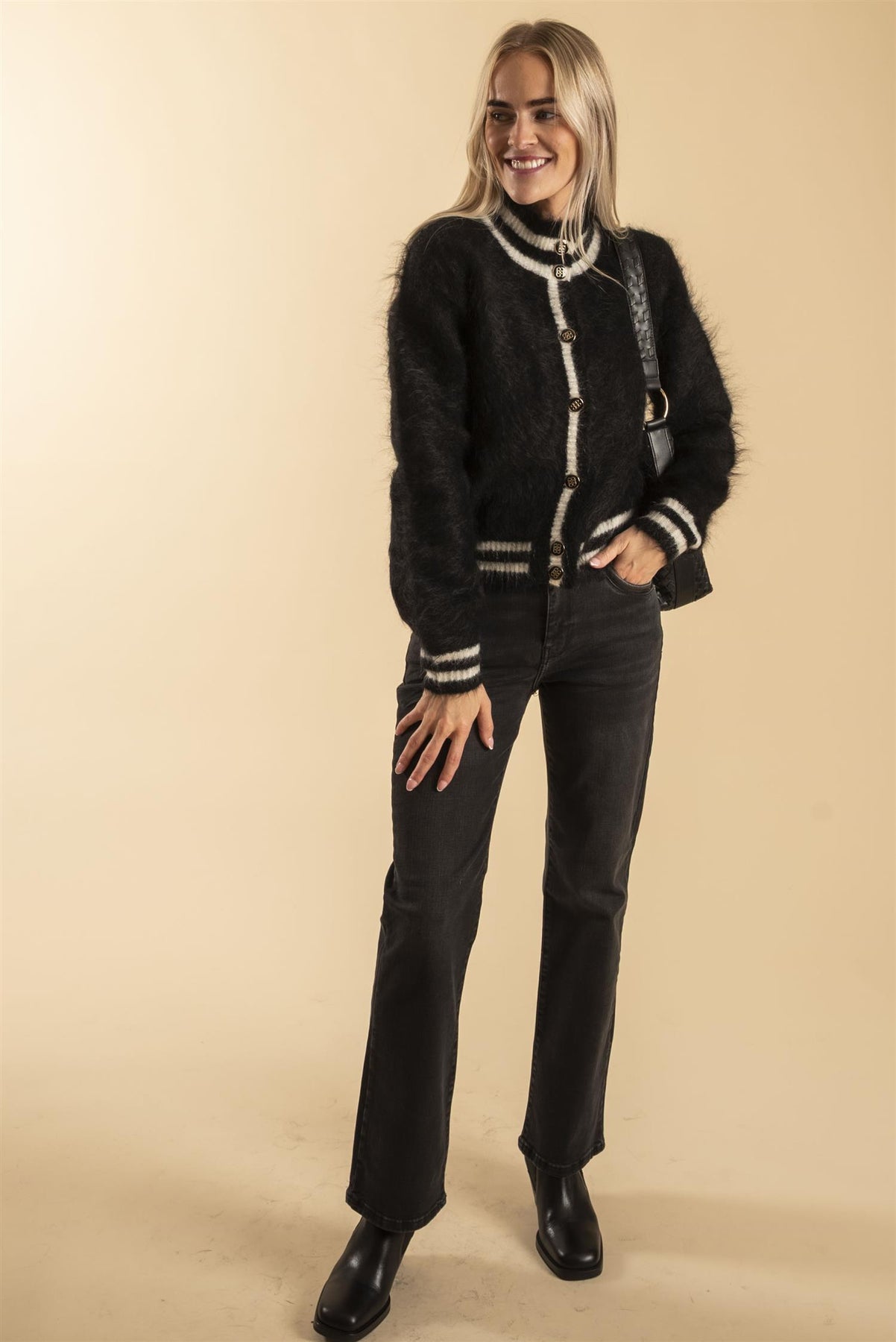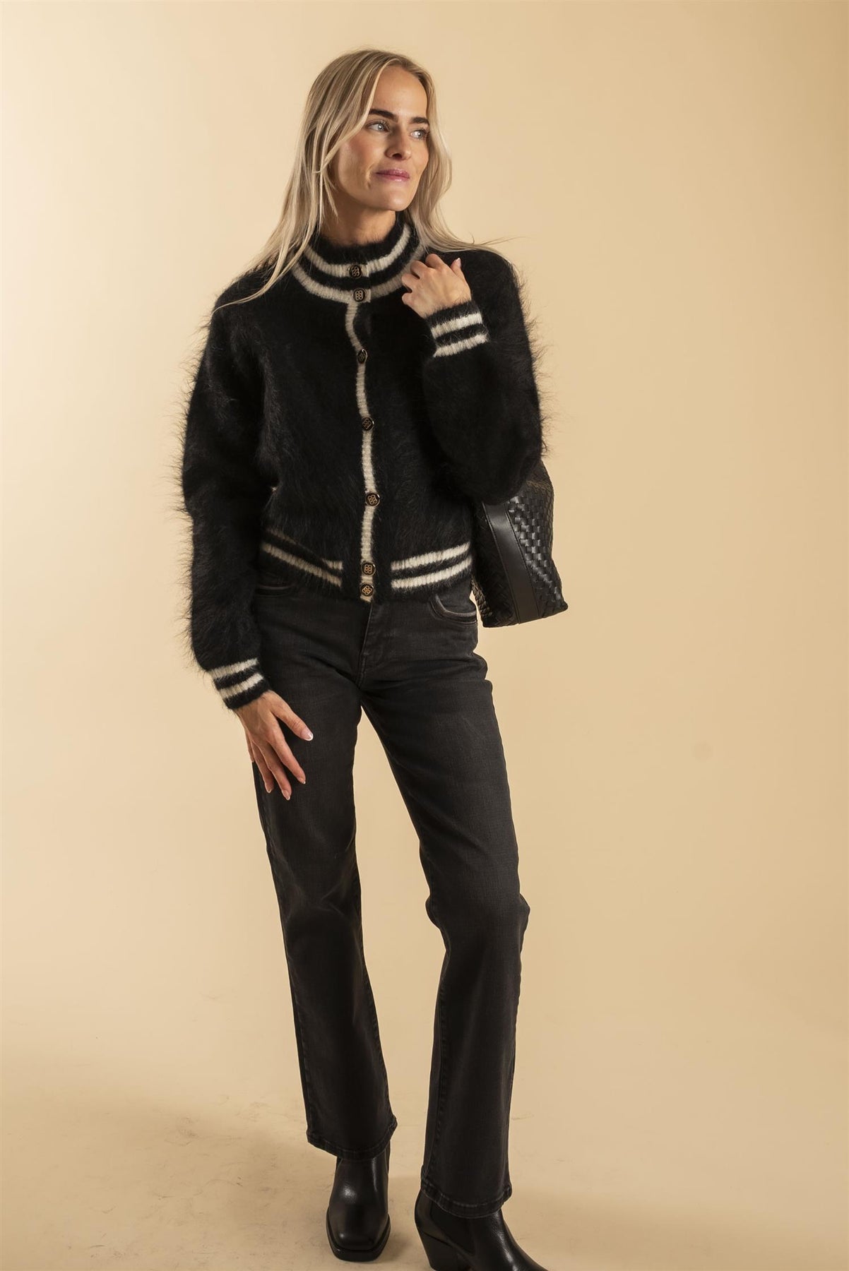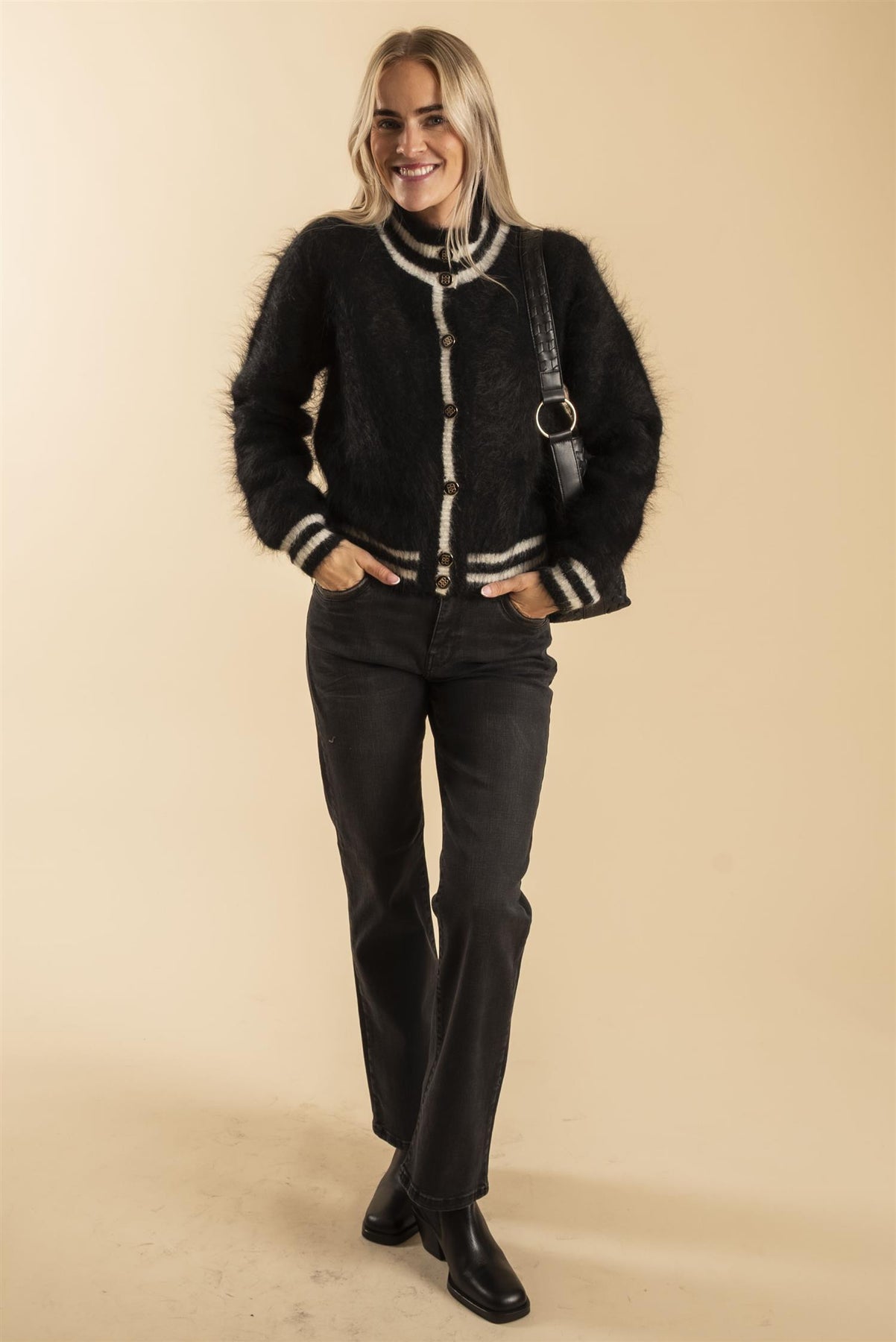 Vår egen modell er 169 cm og har sgtr. 25 tommer. Cardiganen er Twiggy fra ella&il.
