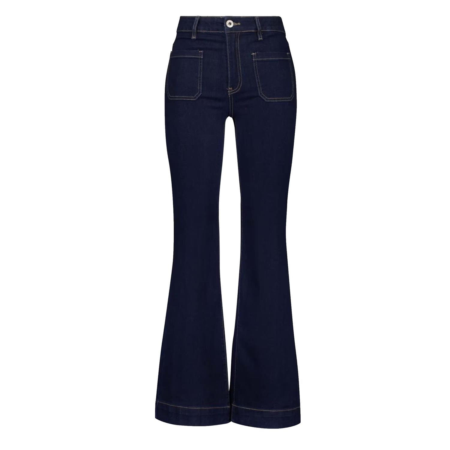 Superfreshe jeans med høyt liv og utvendige lommer foran. Baklommene er plassert midt på rumpa. Den har sleng med dekorativ søm nederst på beina. Buksen er i et ekstra mykt og godt denimstoff med veldig god stretch.