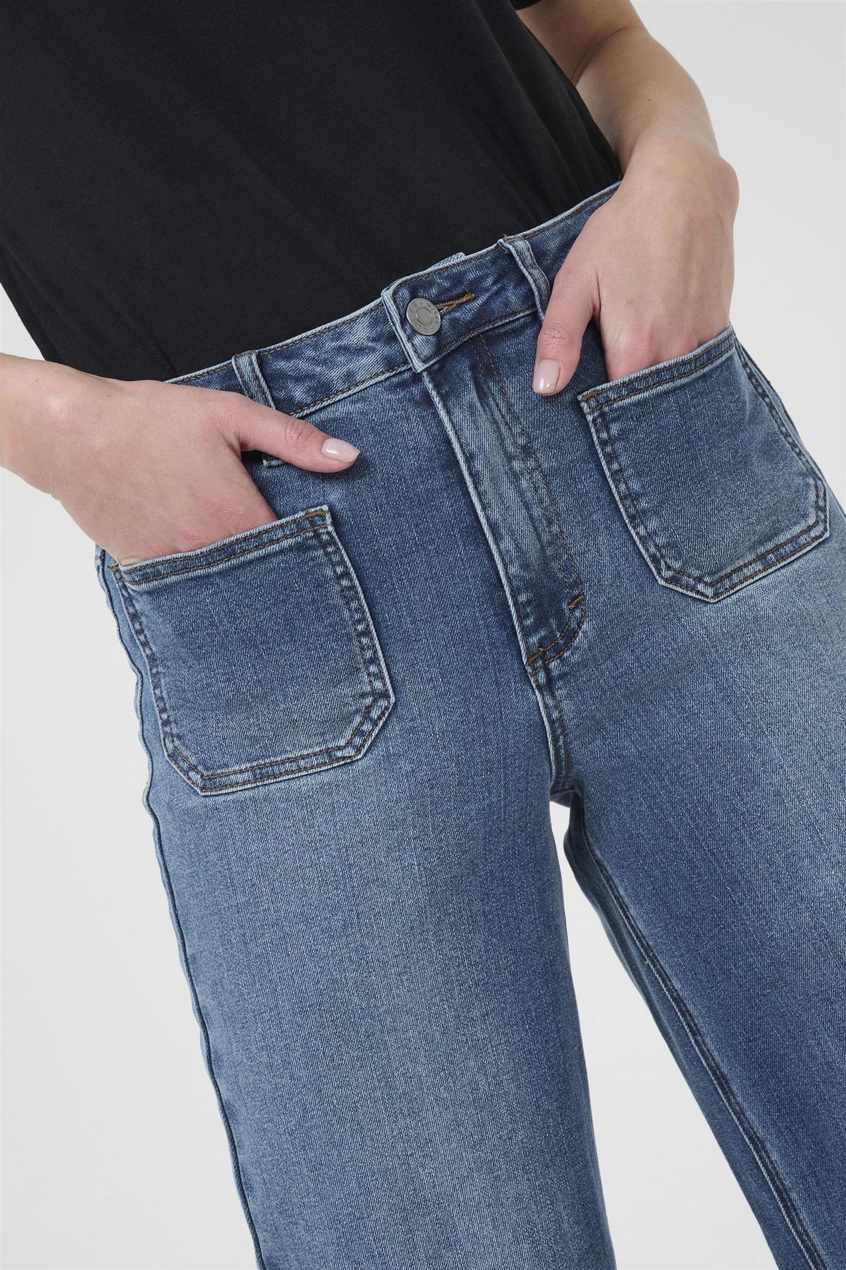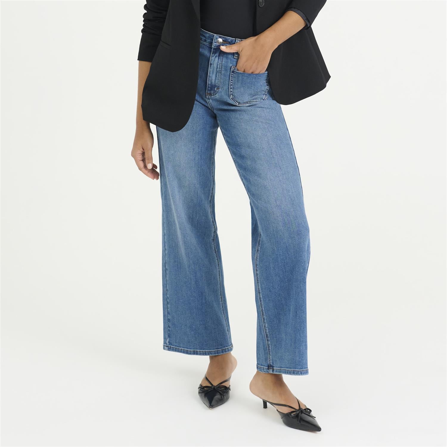 Herlige jeans med vide ben, høy midje og frontlommer. Deilig stretch, full lengde og god passform gir allsidighet og komfort til både hverdags- og kontorbruk.