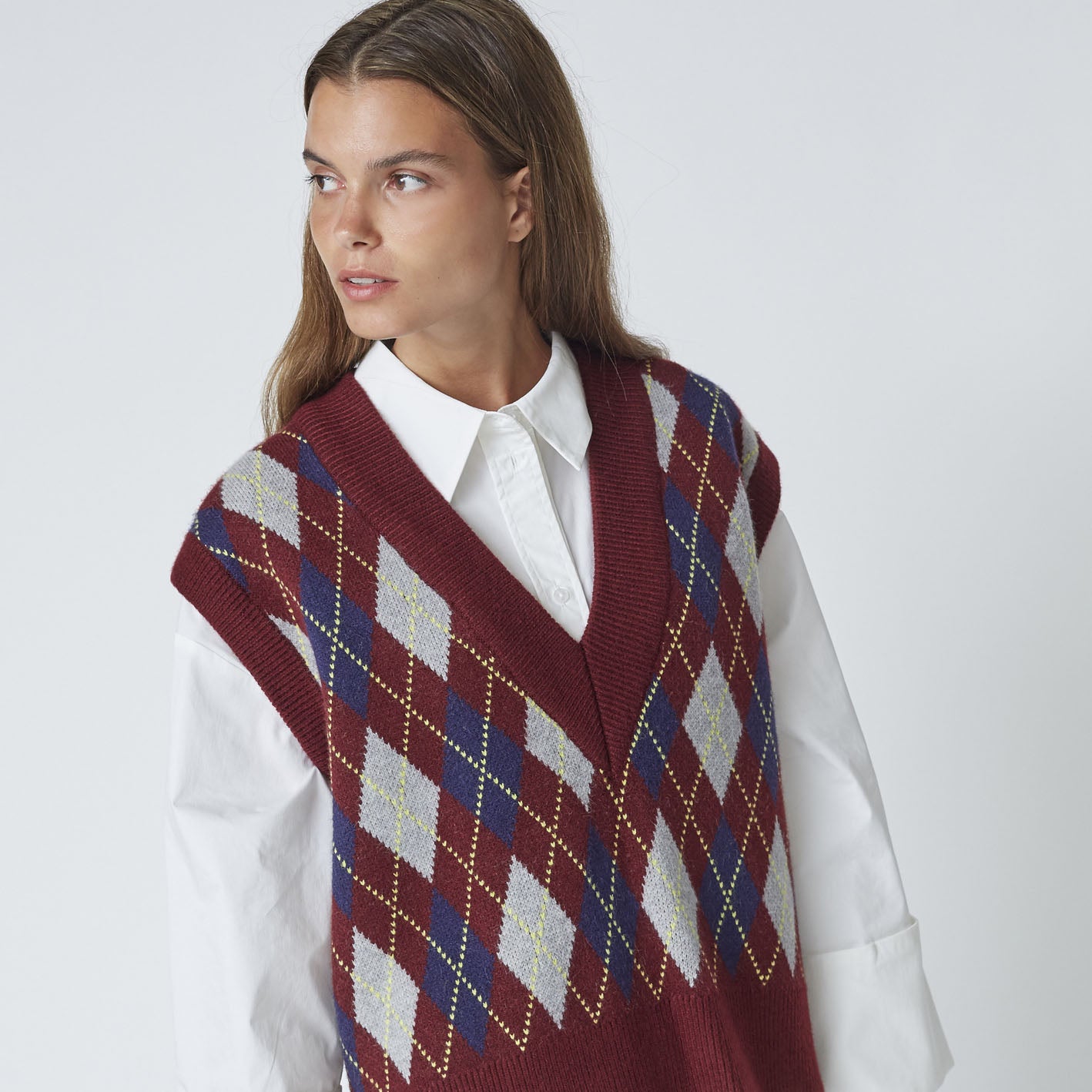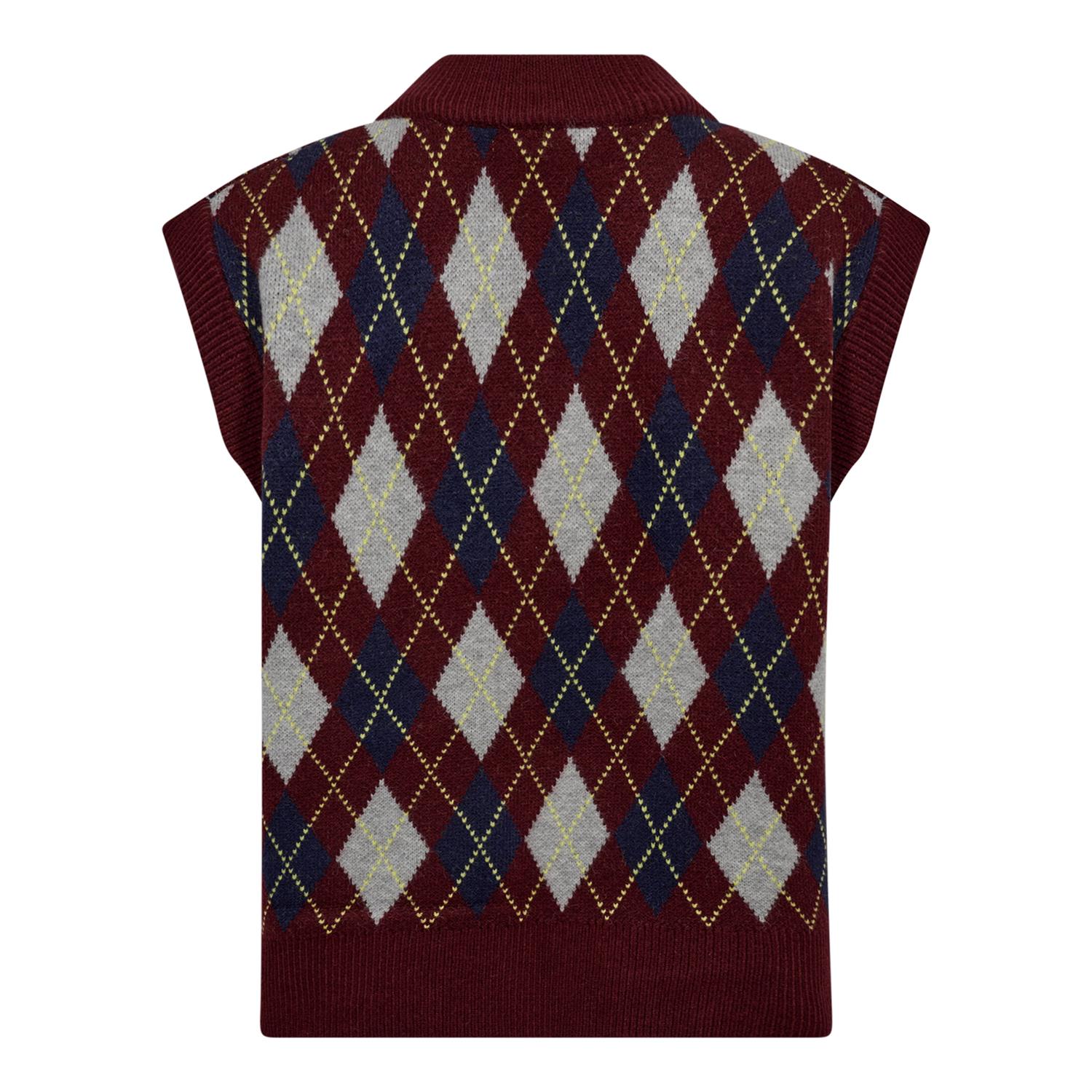 Stilig vest med rutemønster i fargen vinrød og blå, med innslag av grå og gul.