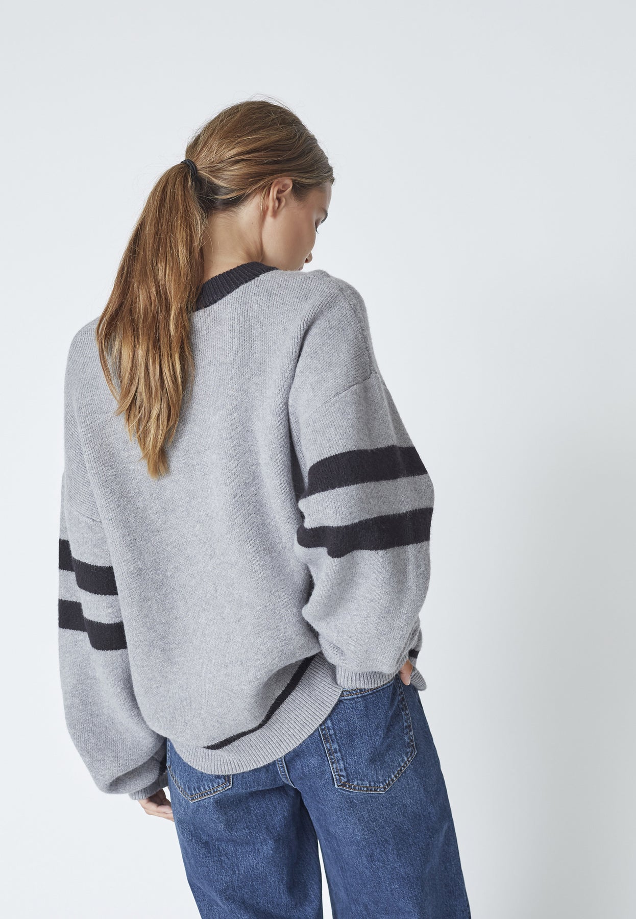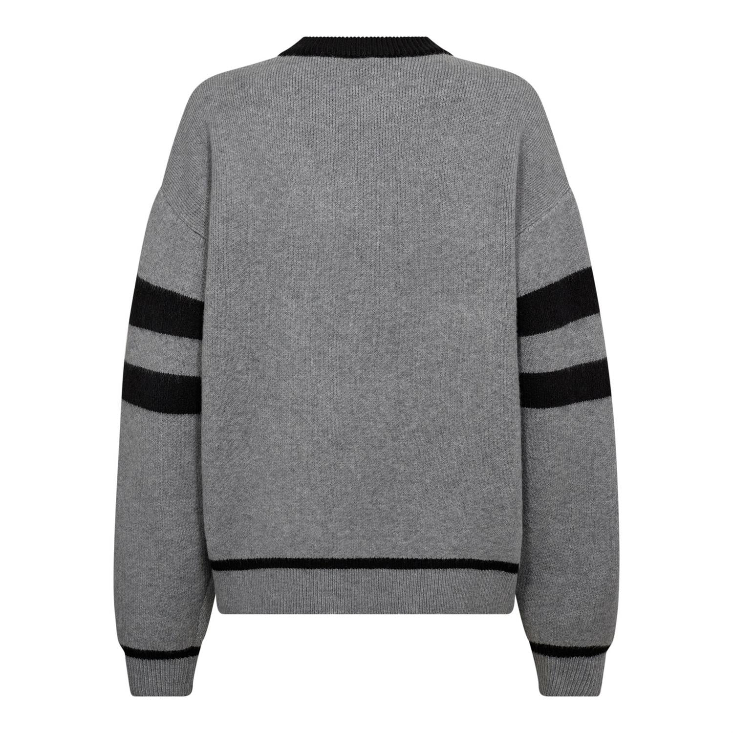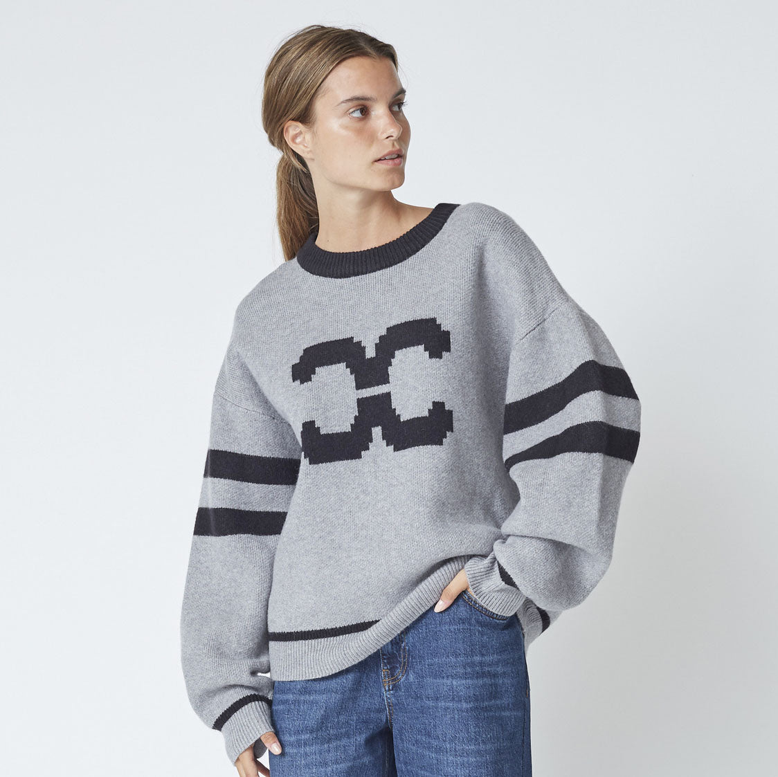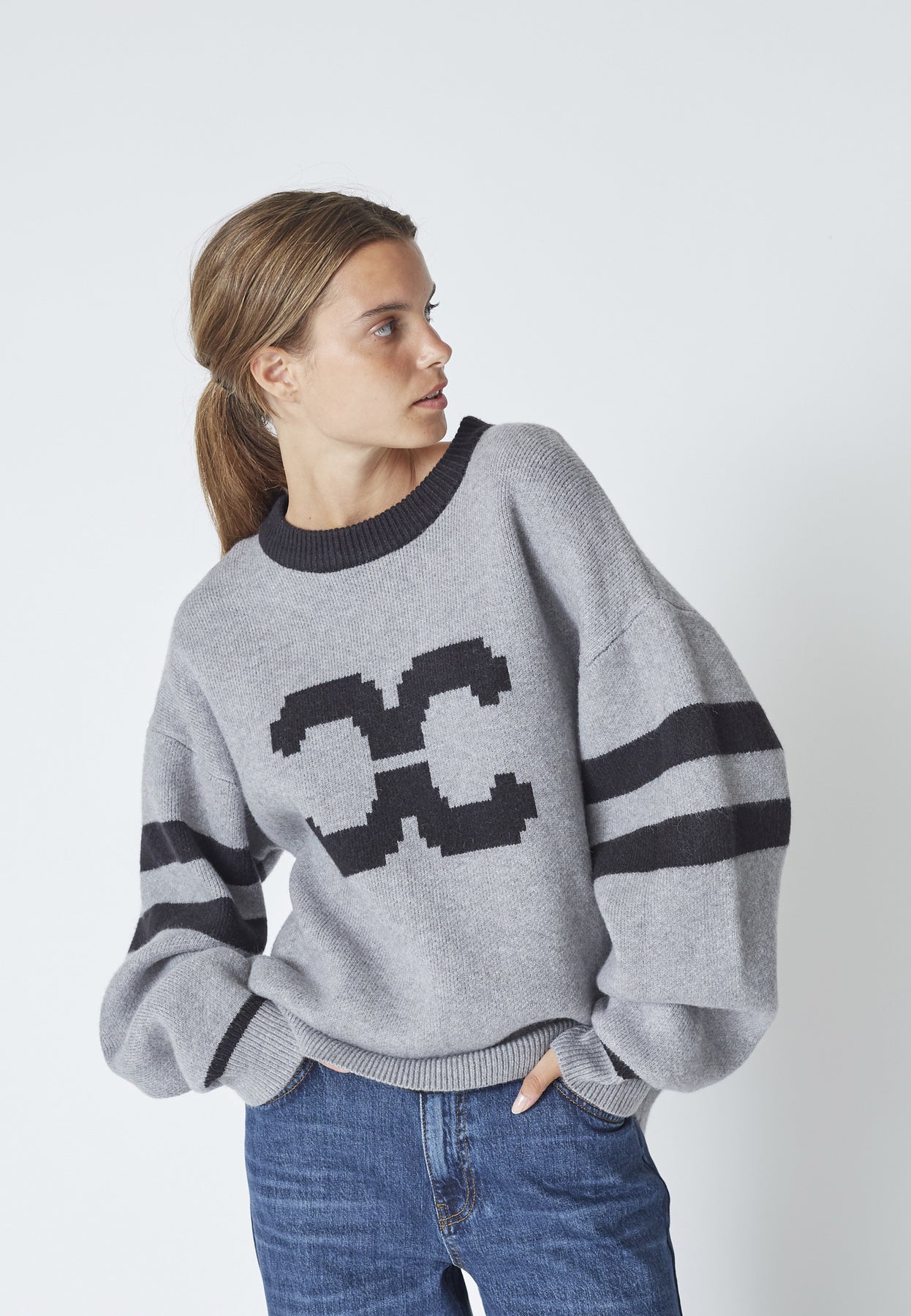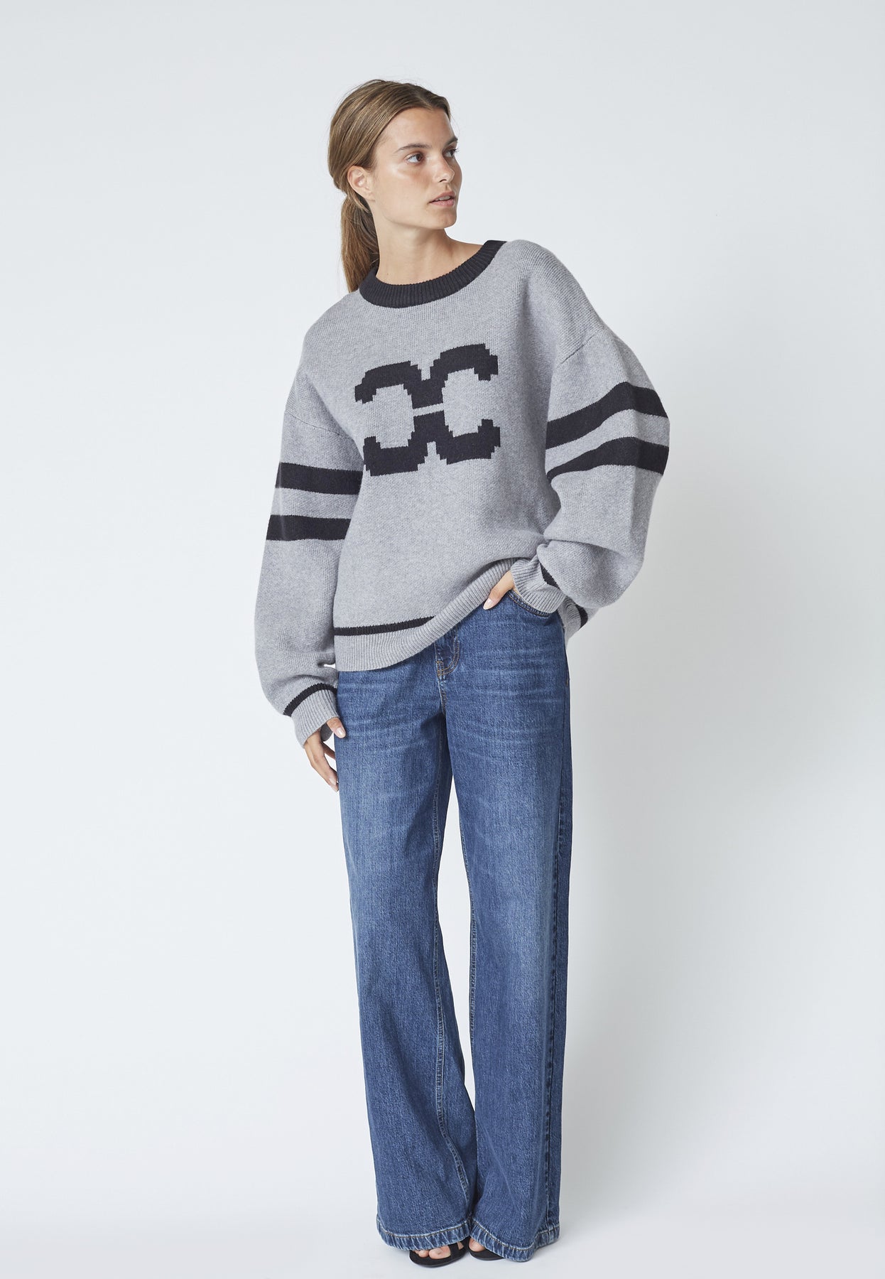 Superfin og sporty strikkegenser i mykt materiale fra Co'Couture med ribbekanter. Kule kontrastdetaljer, samt en stor logo på brystet. Strikkegenseren har en behagelig løs passform.