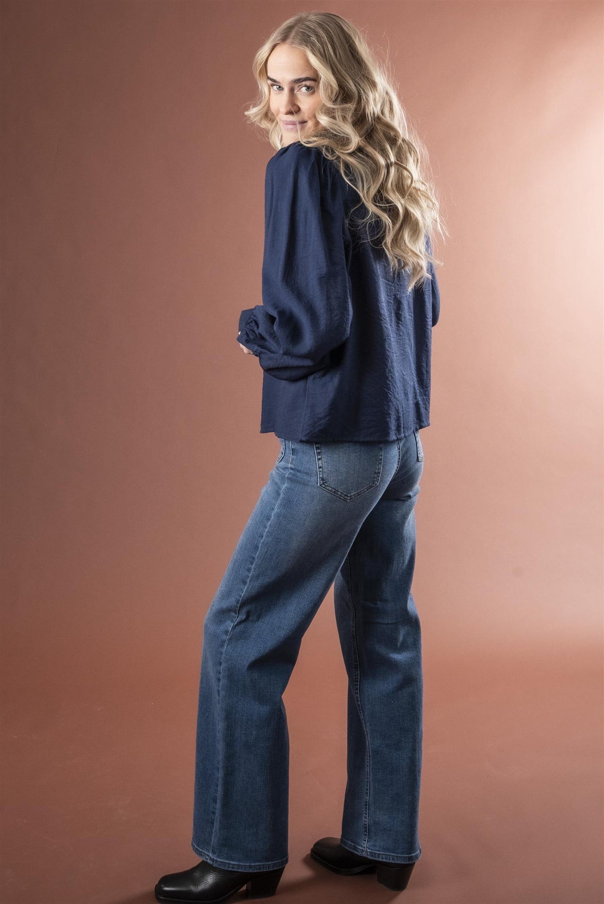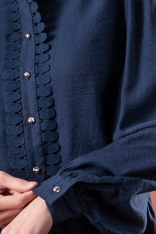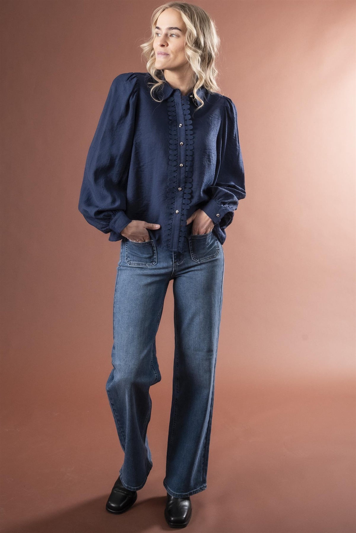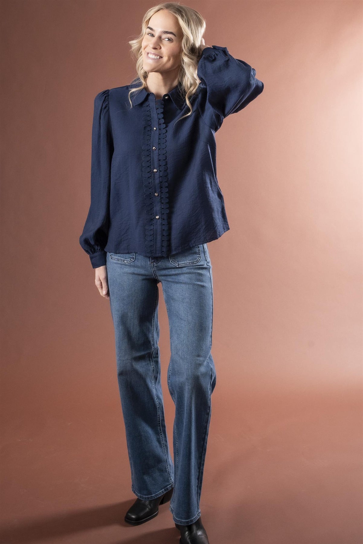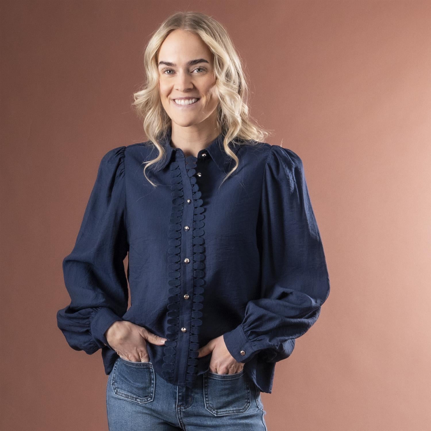 Delikat og feminin bluse med fine detaljer som gir et sofistikert uttrykk. Den dekorative pyntekanten i knappestolpen tilfører et elegant preg, mens ermene har lett vidde som samles i en bred mansjett for en balansert silhuett. Den rette fasongen gjør blusen enkel å style både til hverdags og mer pyntede anledninger.