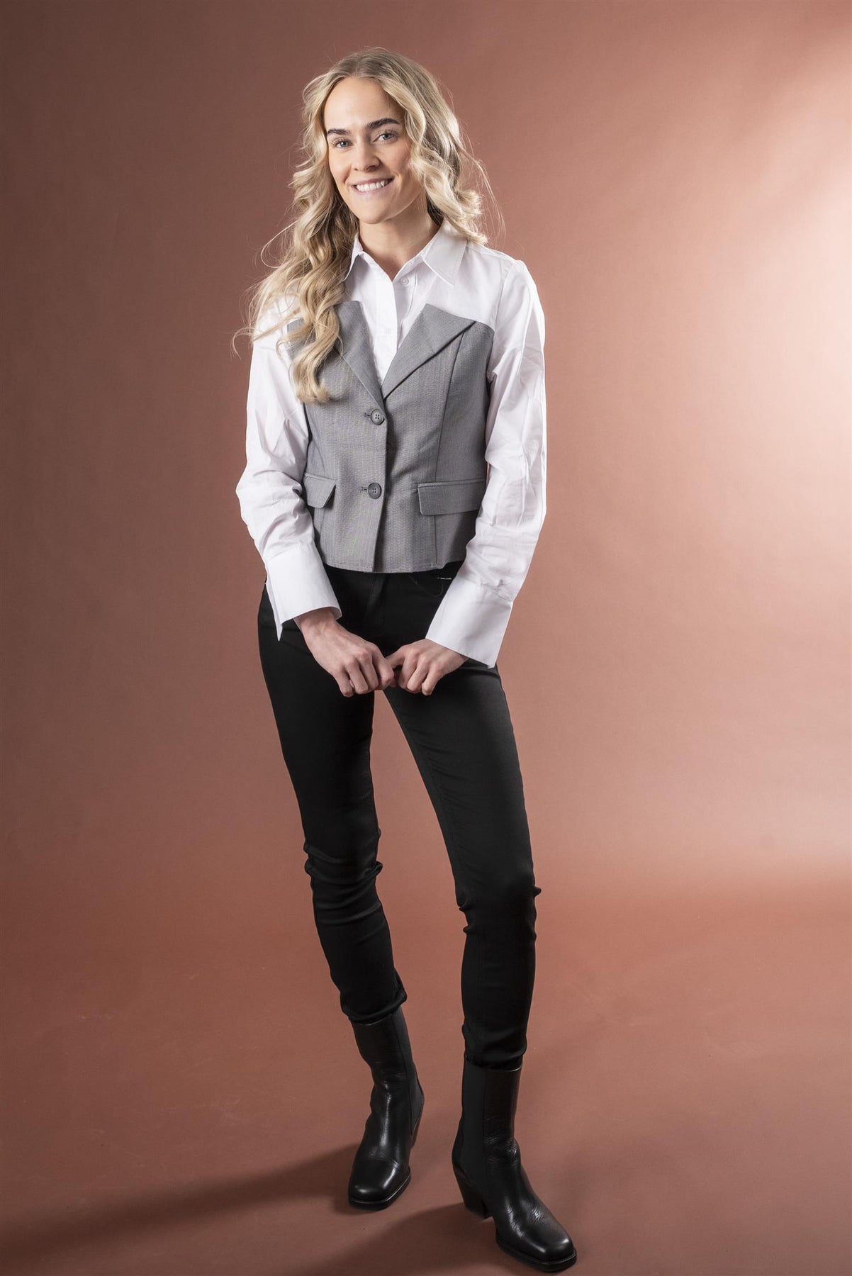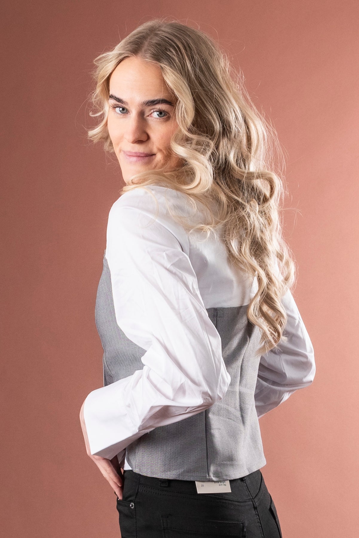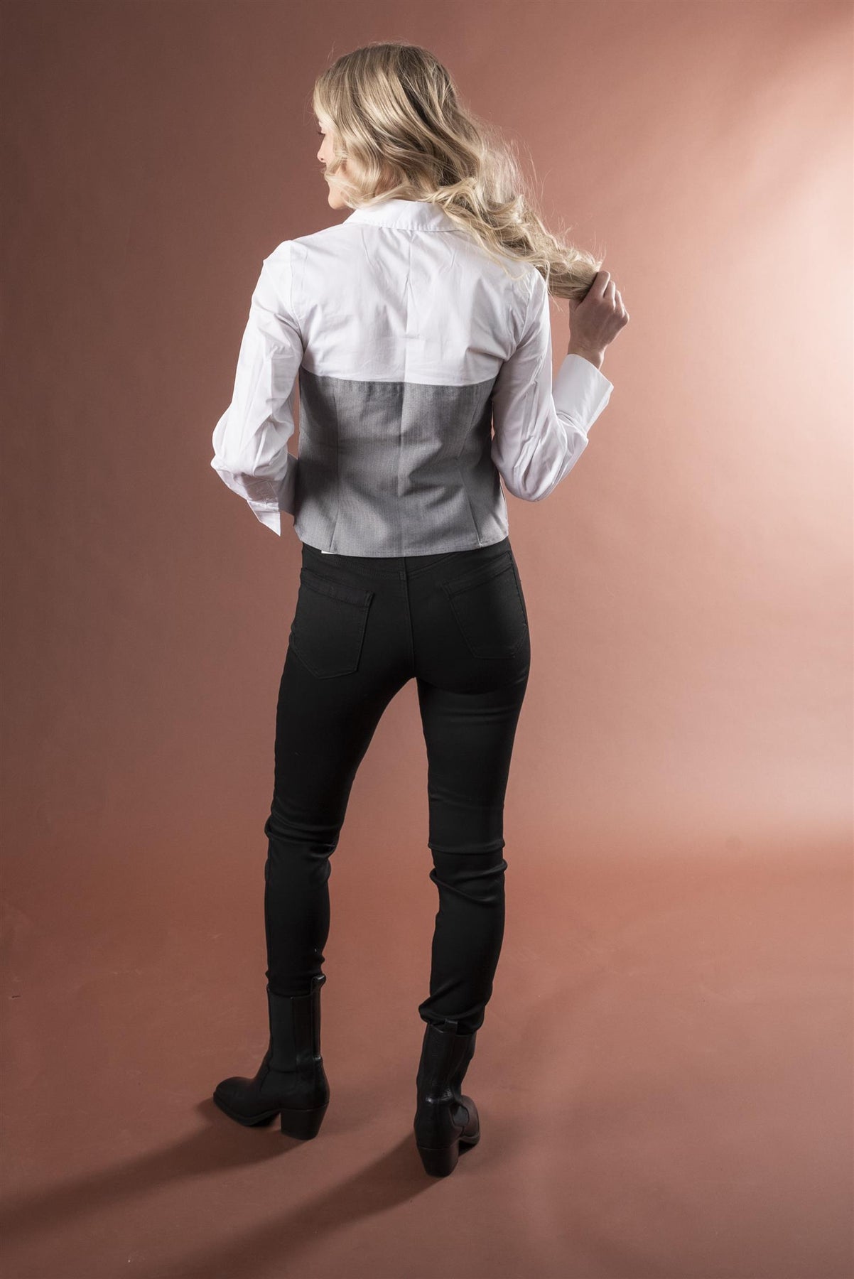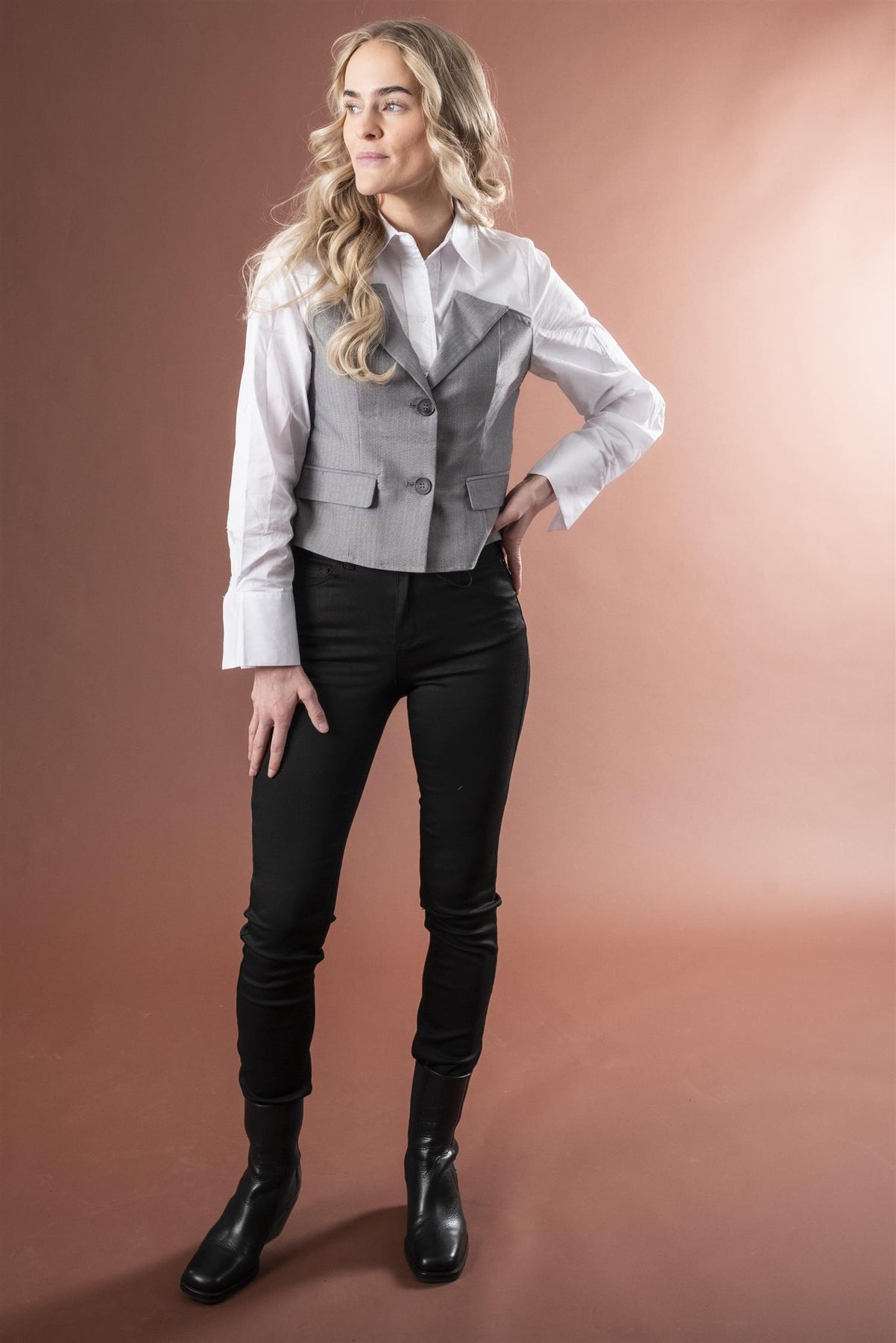 Superkul og feminin overdel fra trendy Co´Couture. Her får du 1 plagg, som ser ut som 2. Hvitskjorte med korsett/vest som sitter på. Innsvinget og smal modell.