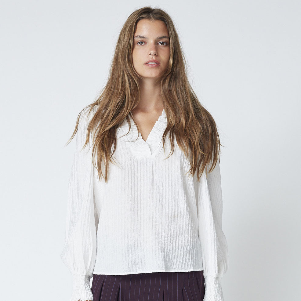 Nydelig bluse med flotte detaljer og ballongermer i kreppet kvalitet med masse tekstur. Lekker halsutrigning med volang og v-hals.
