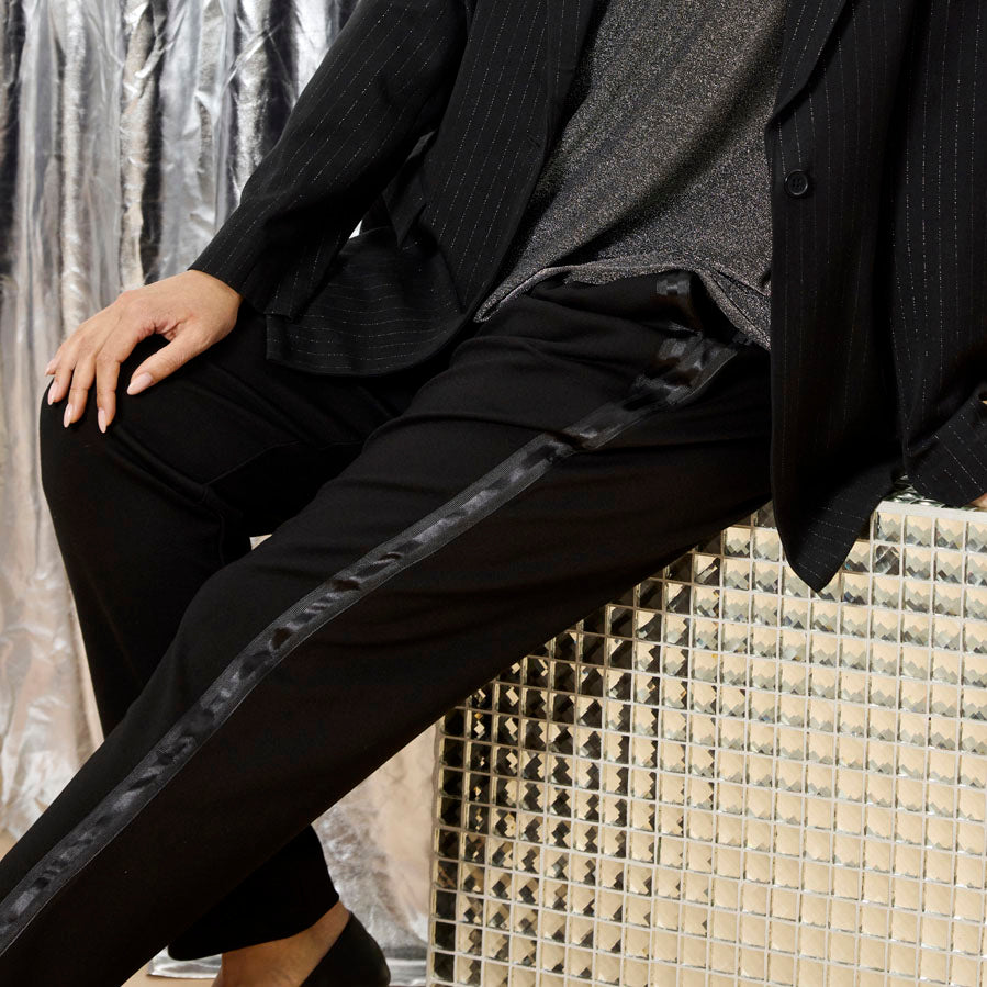 Årets store trend til fest-sesongen er smoking, og her en superkul bukse i comfy og behagelig kvalitet med shiny tidsriktige striper ton-i-ton.