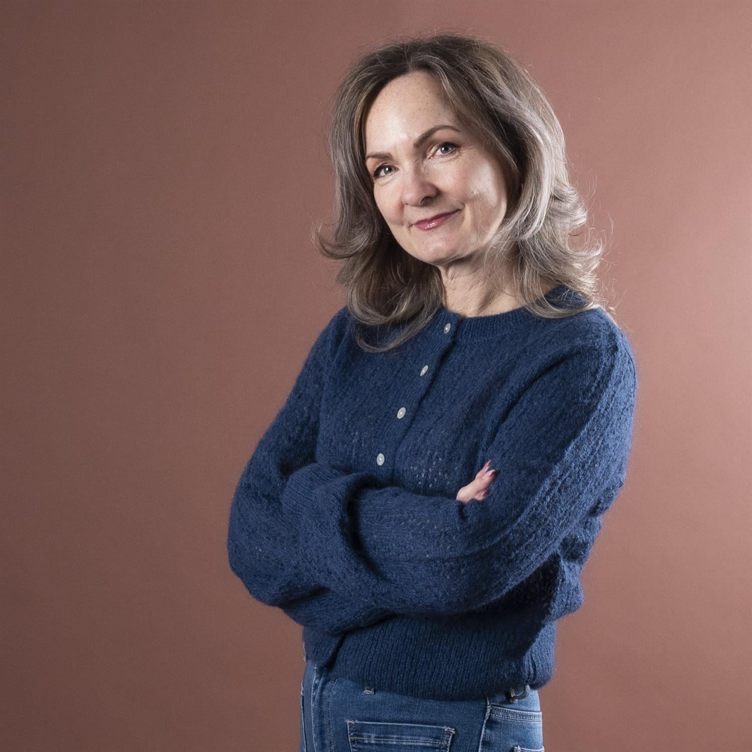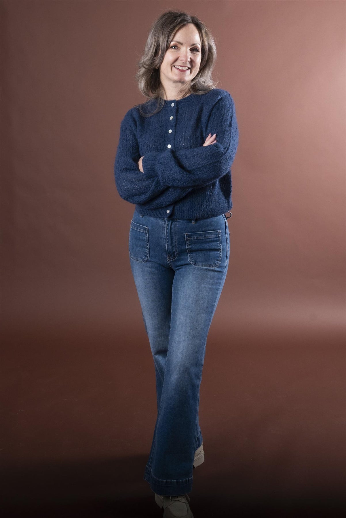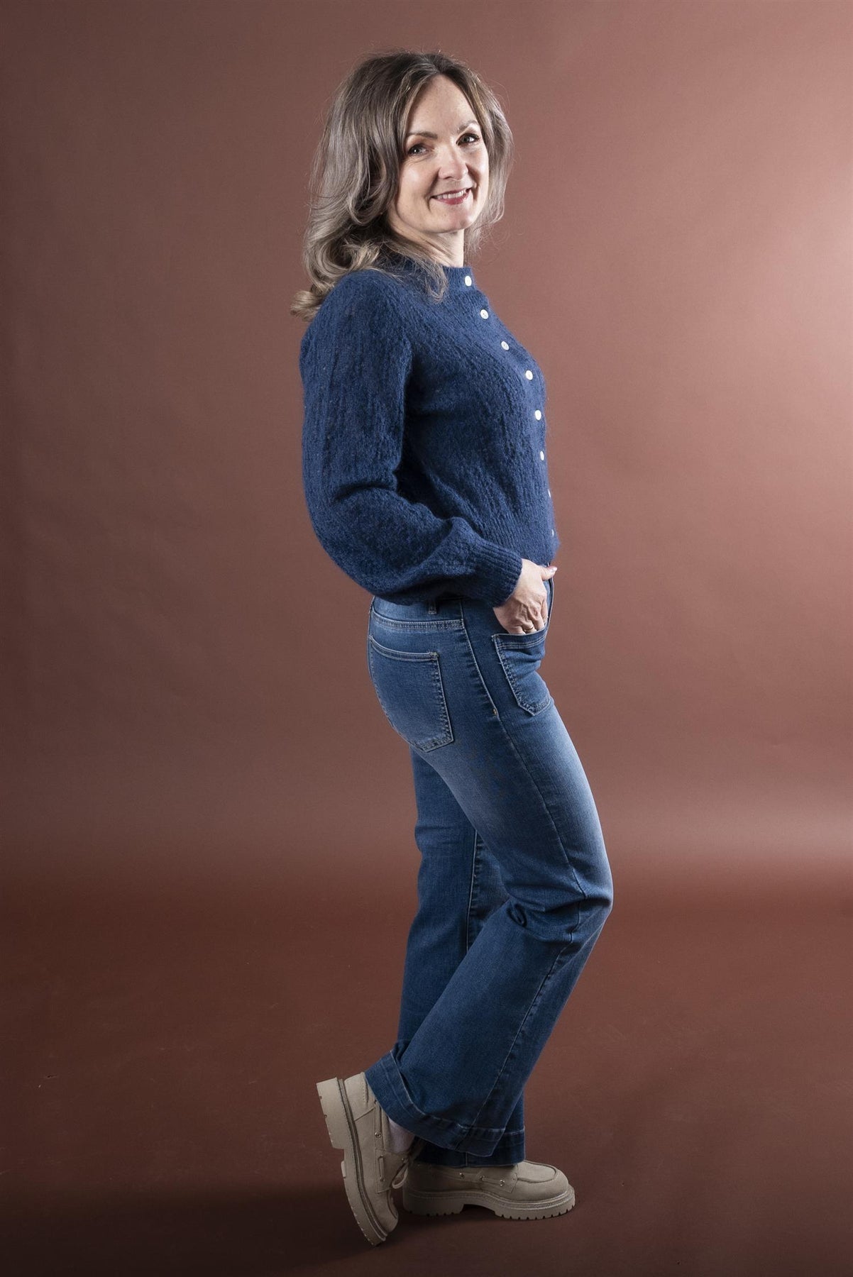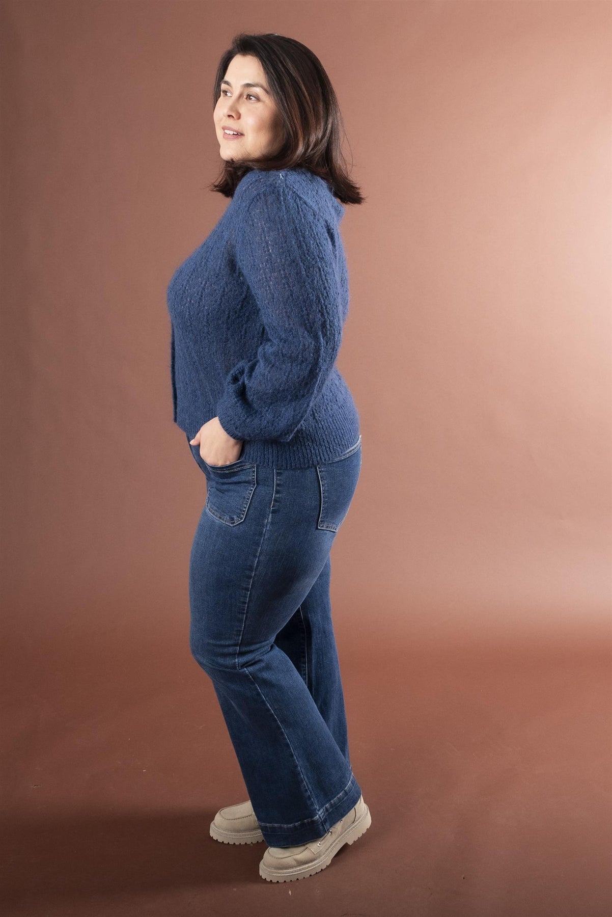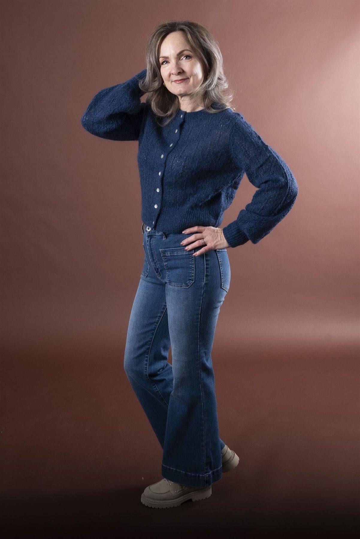 Vår blonde modell er 164 cm og har str. S. Jeansen er Annika fra Floyd.