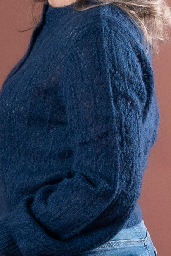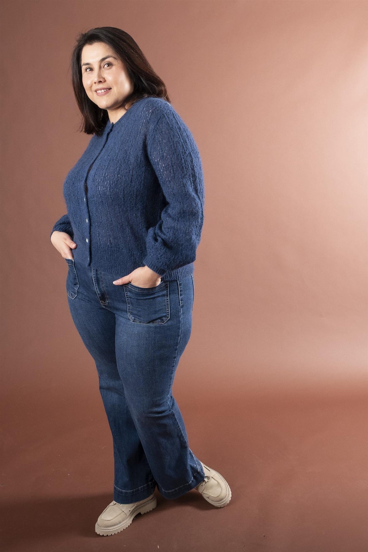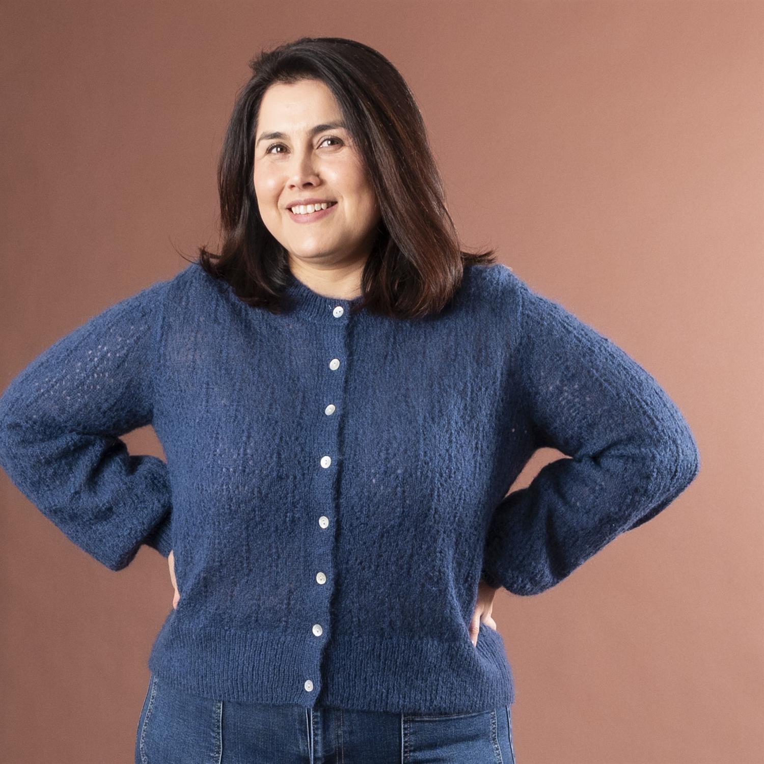 Delikat og feminin cardigan i en lekker blåfarge, laget av et luftig strikkemateriale med mønsterdetaljer.