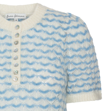 Myk og luftig strikkegenser i blå og hvitt med korte ermer — perfekt for lag-på-lag eller alene på kjølige dager.