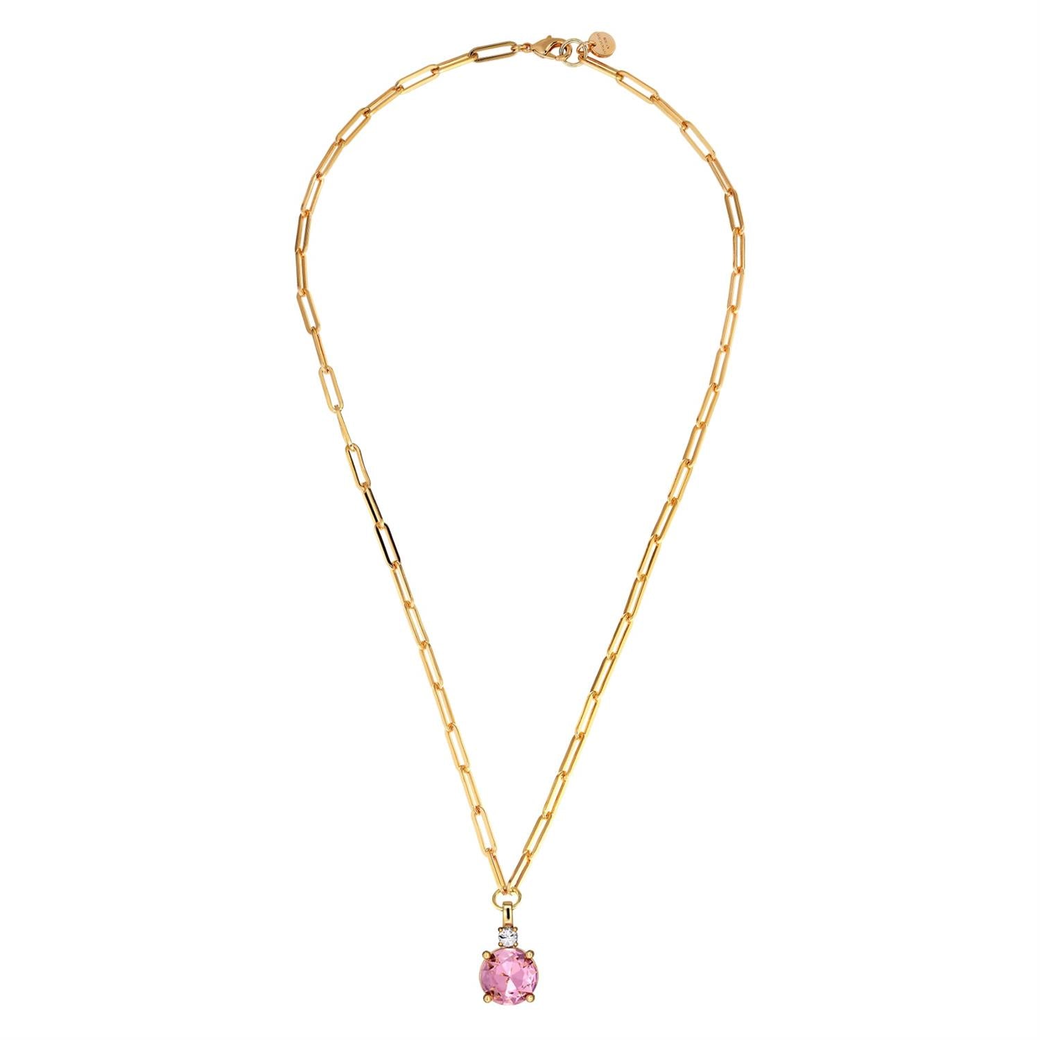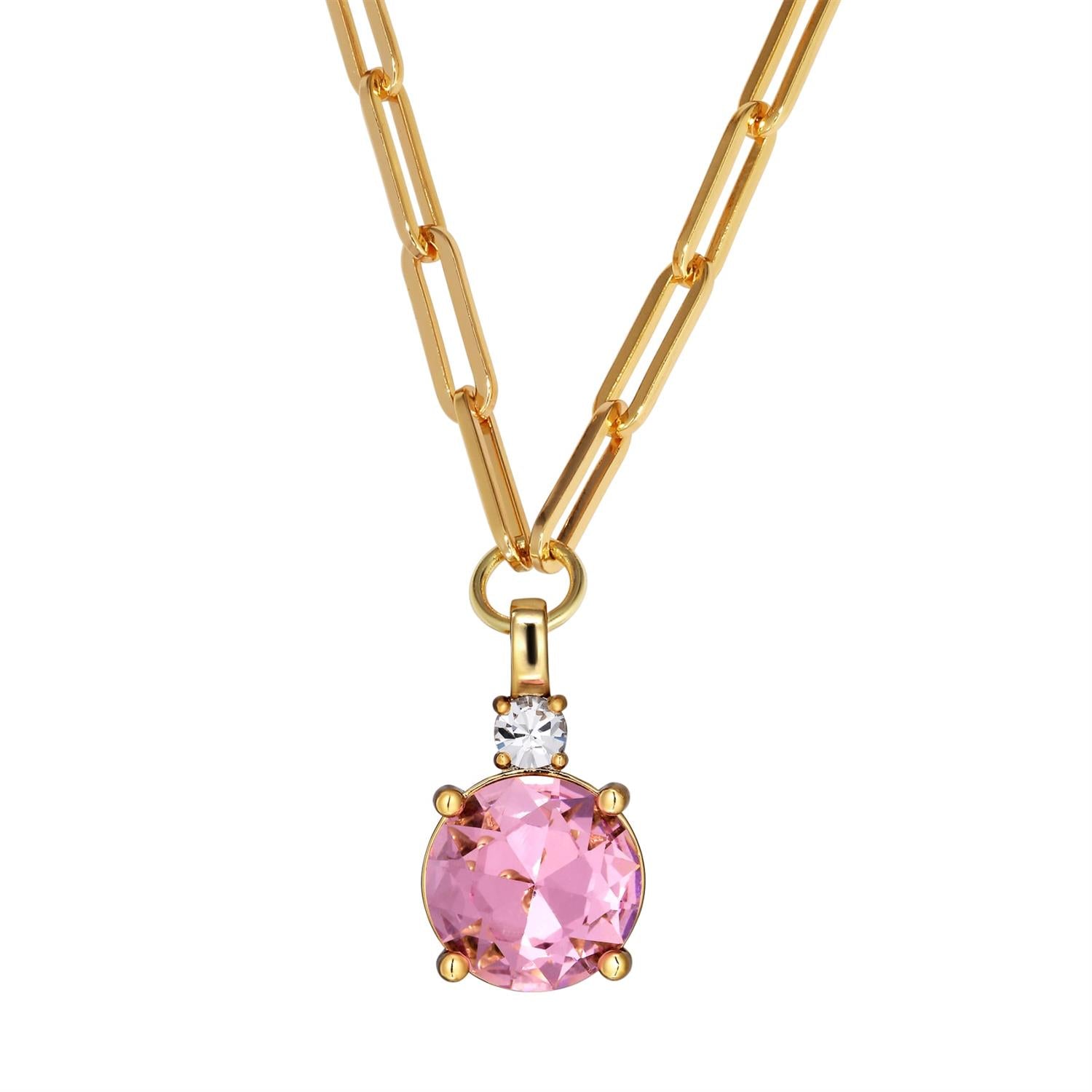 GLORY – En vakker og klassisk kjede av 80 cm belagt rustfritt stål – og utsmykket med en stor fasettslipt solitairekrystall med en diameter på 15 mm, satt i en klassisk innfatning. Her vist i favorittversjonen av klassisk lys rosa krystall med gullfarget finish.