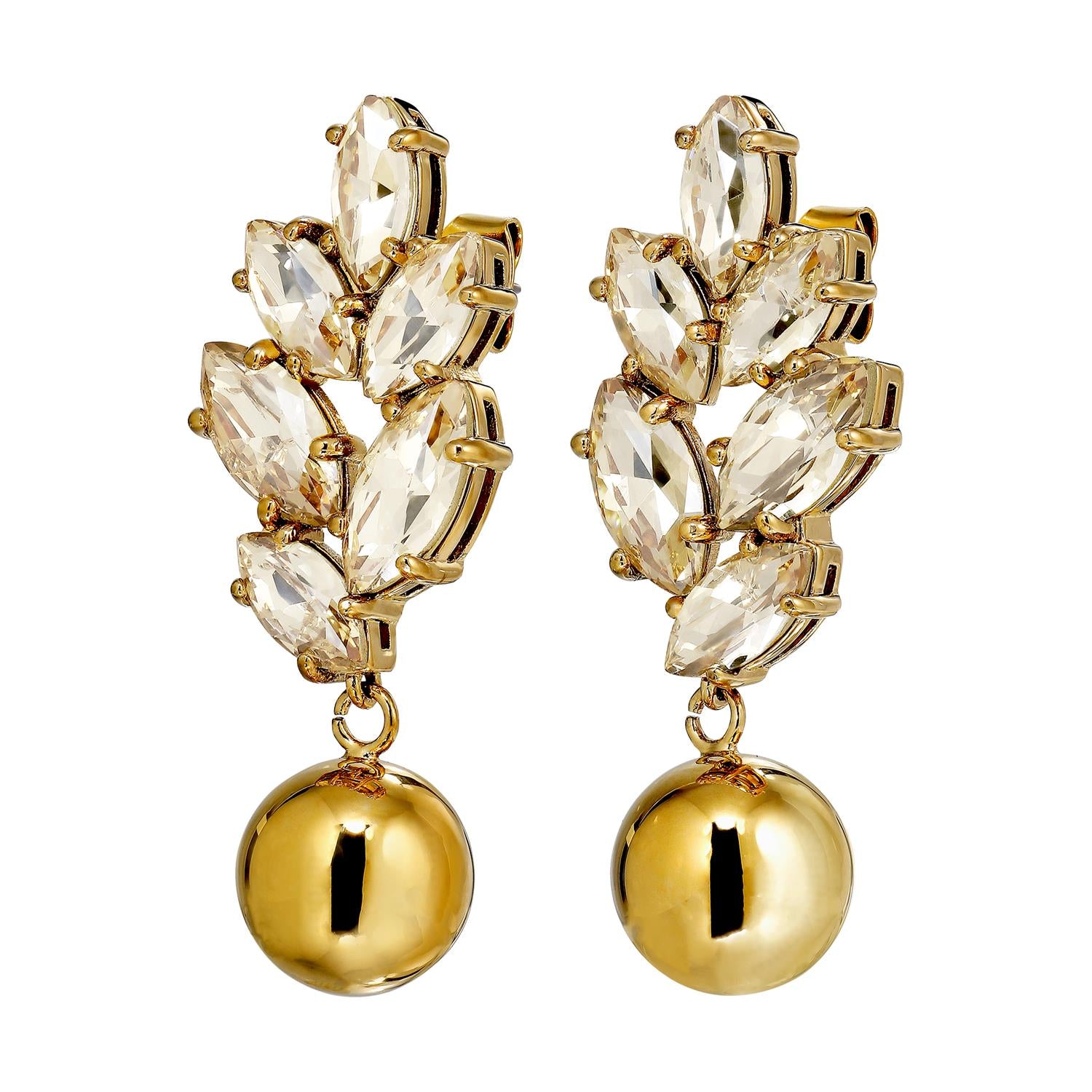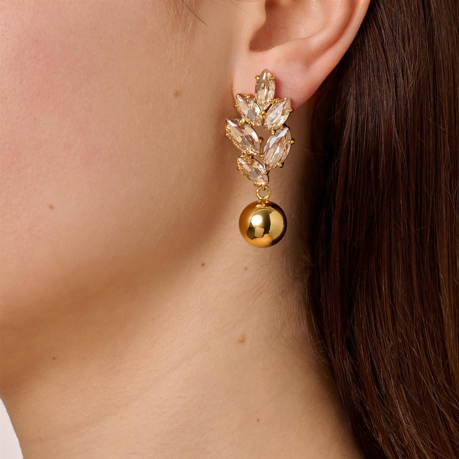 En skjønnhet, feminin og elegant ørenring, der vil gjøre seg til større og mindre sammenkomster. Den bladformede toppen er fullt besatt med navette formede krystaller i forskjellige tonerbærere og større hvite imitasjoner. Smykket er designet i poleret messing med kirurgisk ørenstikker.