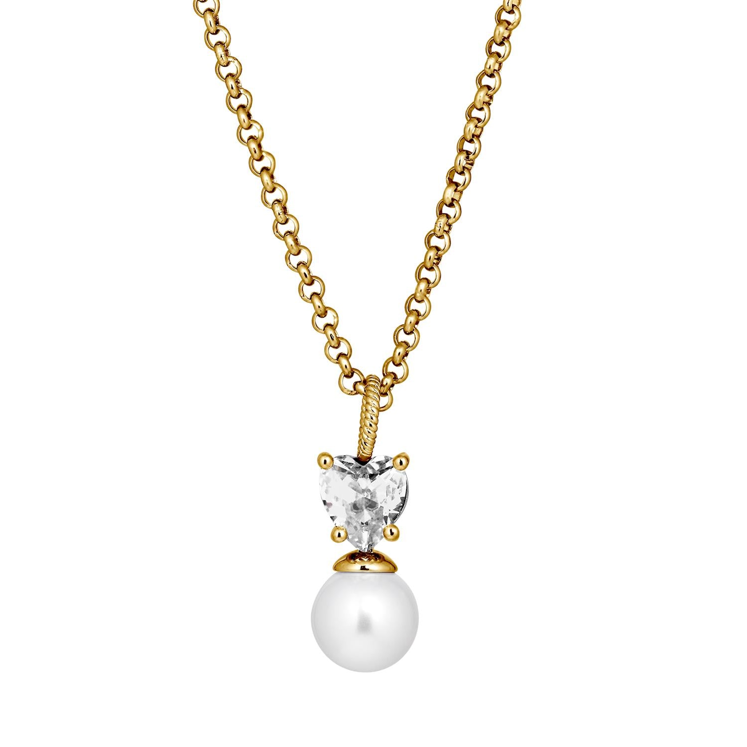 COLUME - en elegant kjede laget med et hjerteformet krystallanheng med spisser og en rund hvit imitert perle. Total lengde ca. 42 cm og 5 cm forlengelseskjede. Kjede laget i rustfritt stål, anheng i polert messing.