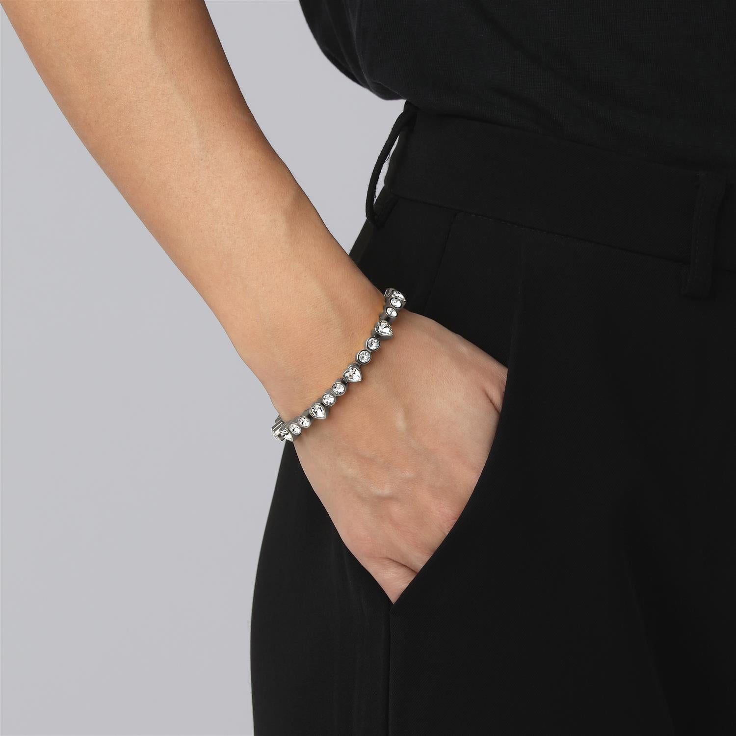 Et romantisk og søtt krystall-armbånd, med en blanding av flere runde og hjerteformede krystaller satt i modernistiske innfatninger.