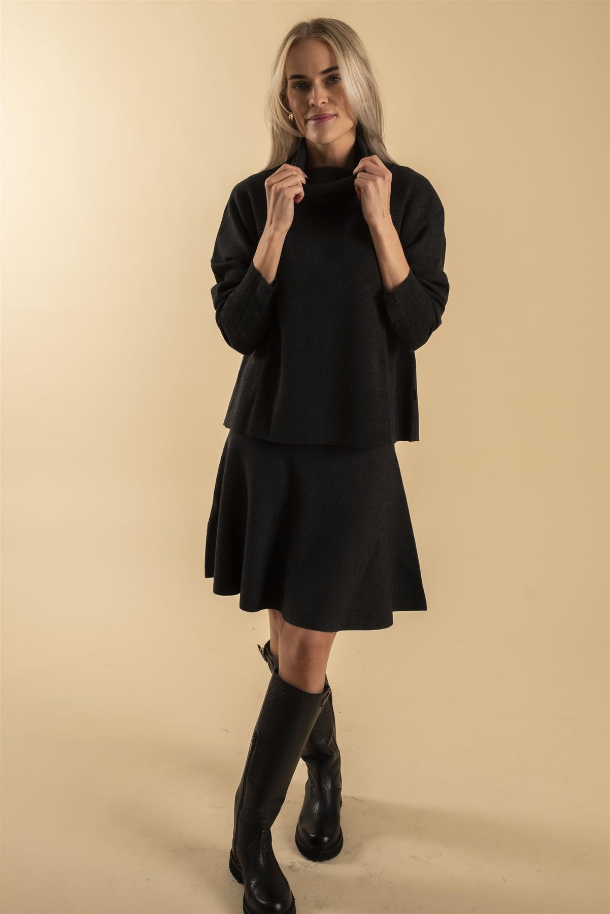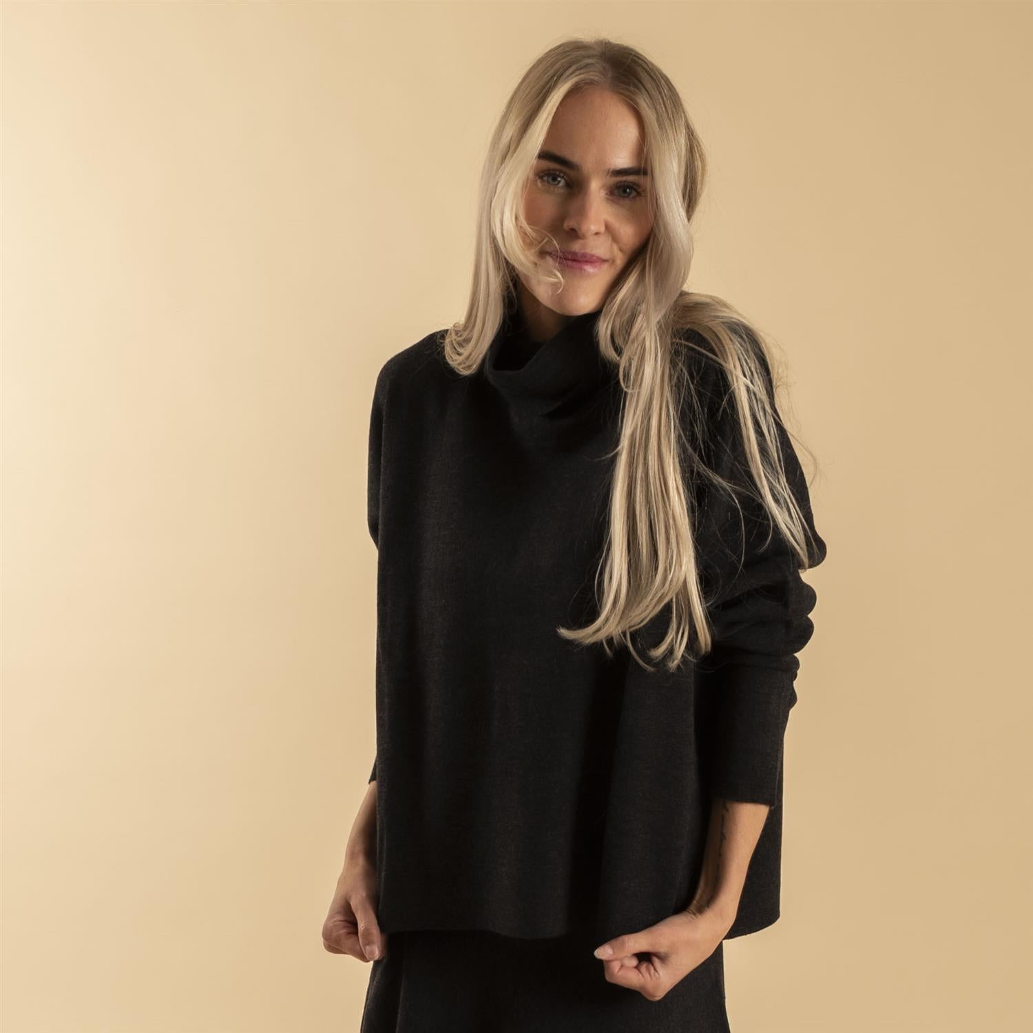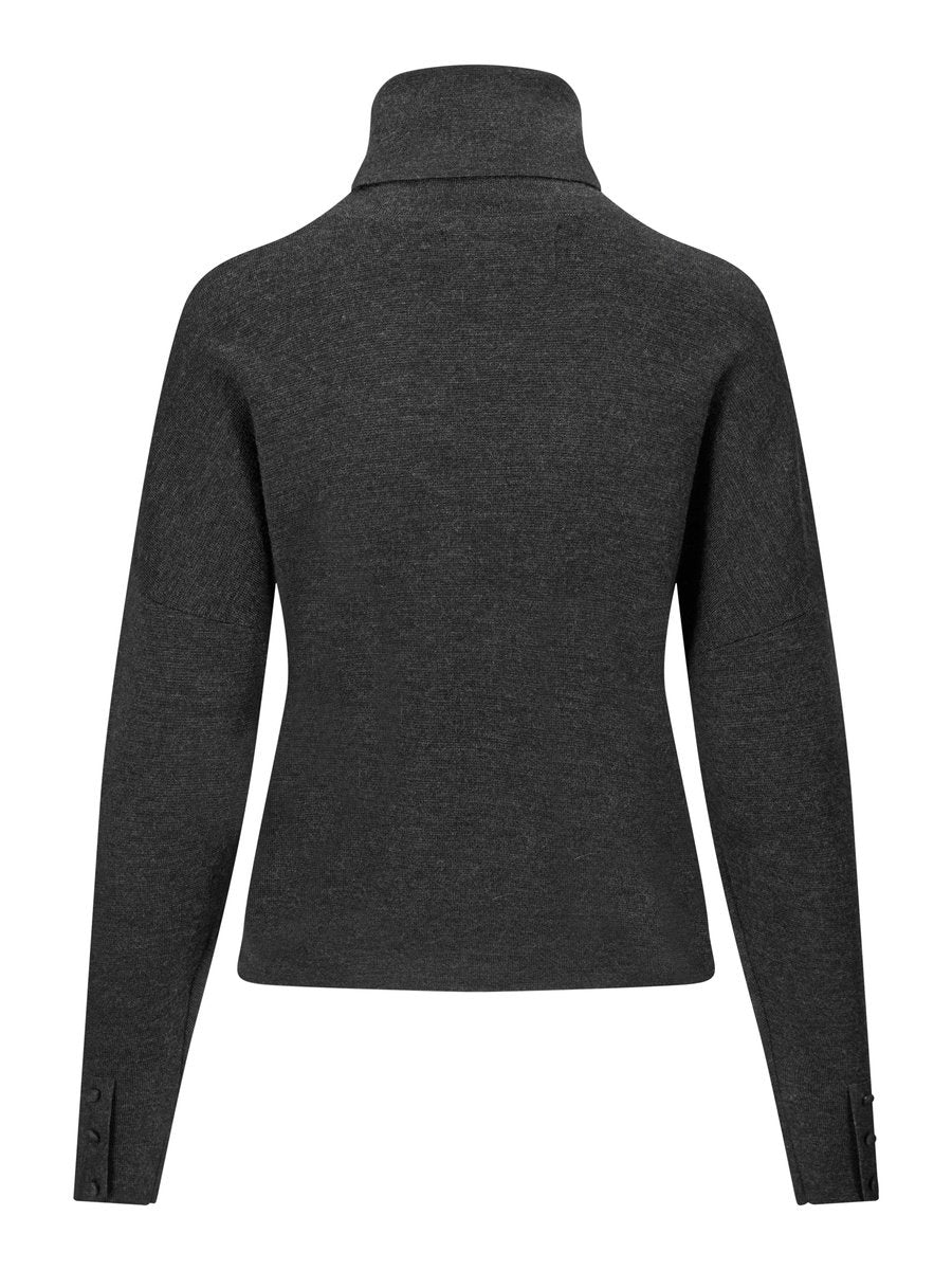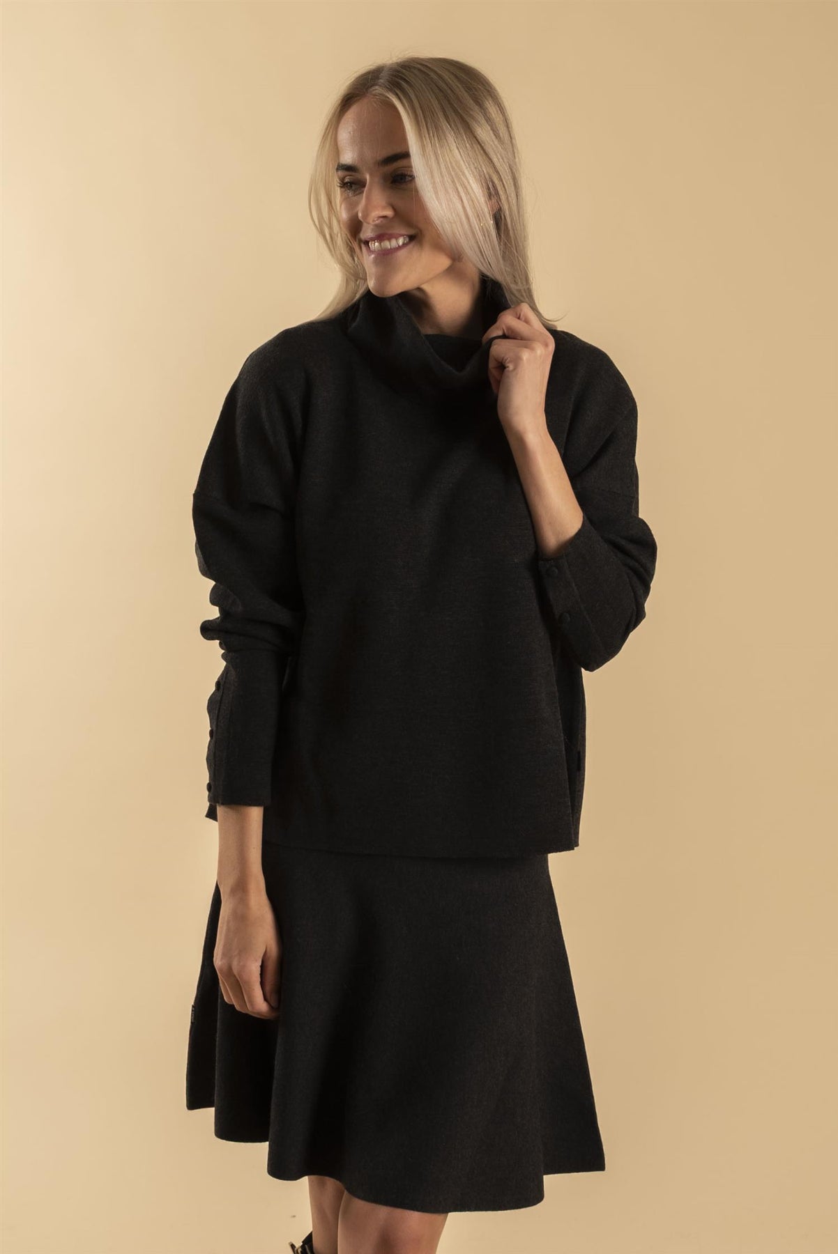 Fantastisk deilig strikket polo med vidde, litt croppet (kort) med drop shoulder og høy hals. Den har lange ermer med velurknapper på mansjettene.