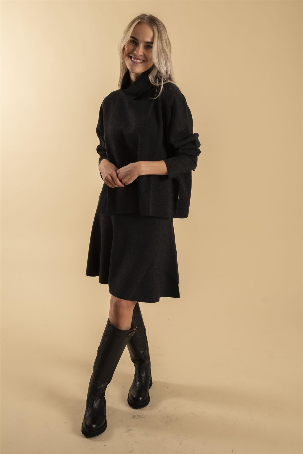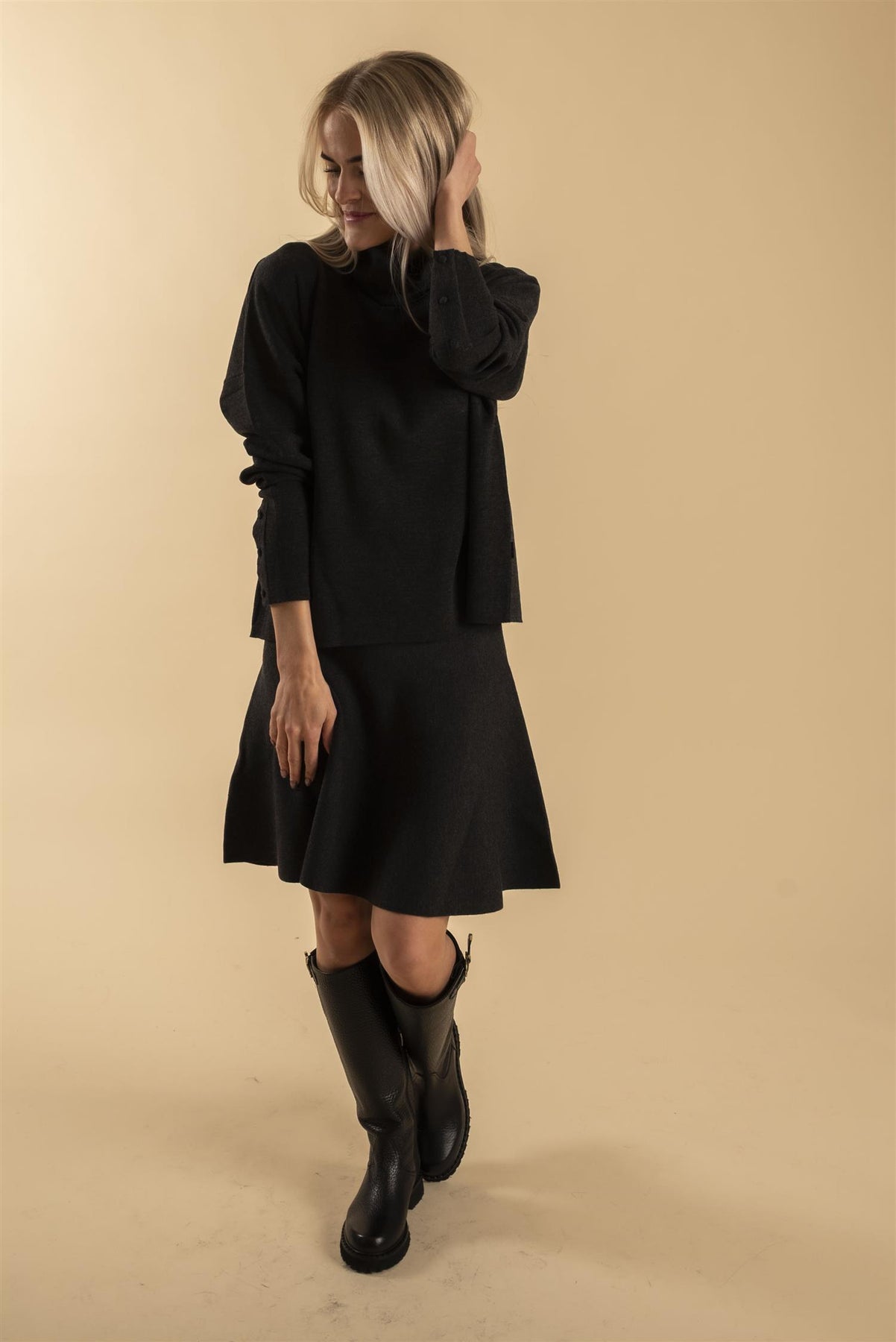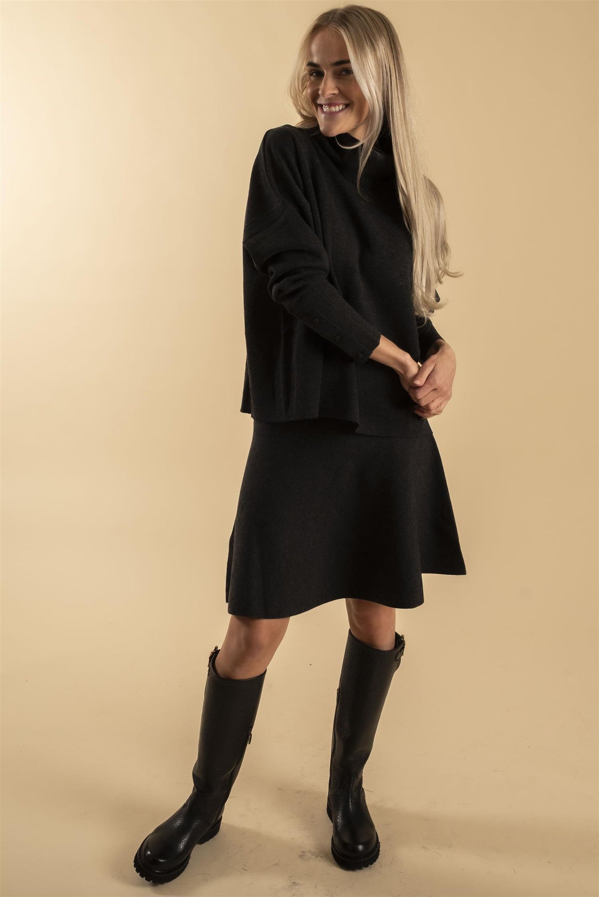 Fantastisk deilig strikket polo med vidde, litt croppet (kort) med drop shoulder og høy hals. Den har lange ermer med velurknapper på mansjettene.