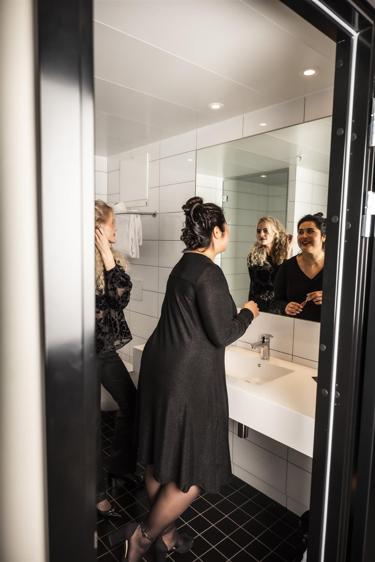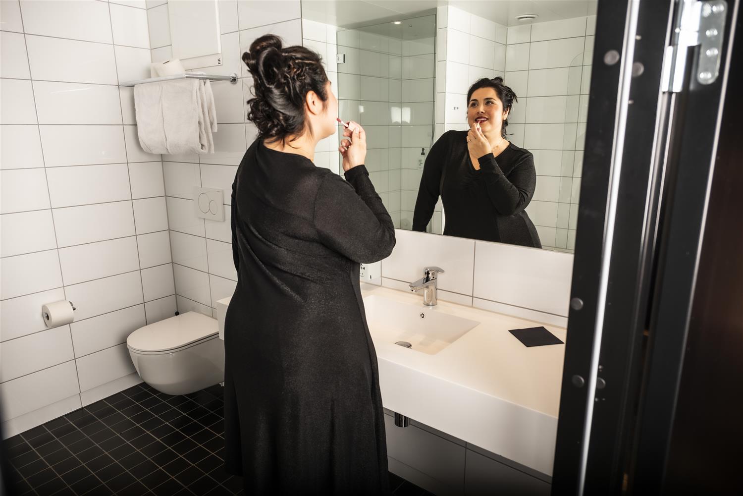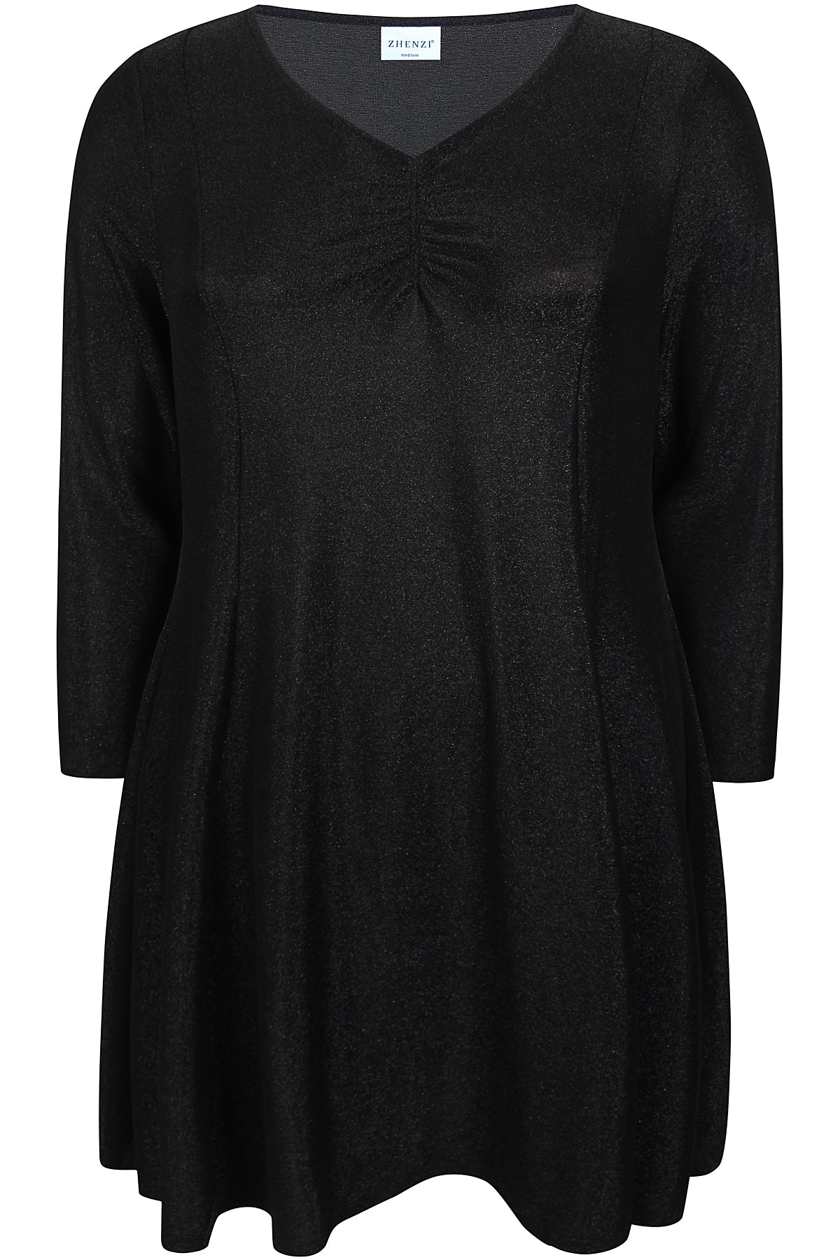 Lekker glitrende kjole med innvevd lures som har flatterende passform. Lange ermer, v-utrigning med små rynker som gir fin silhuett over bysten. A-fasong på kjolen så den slipper over hoftene.