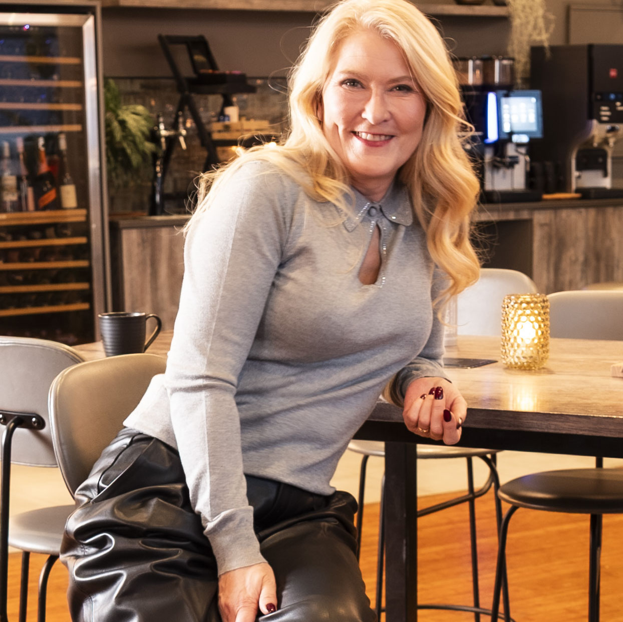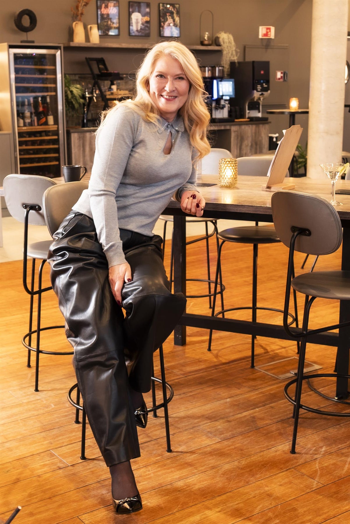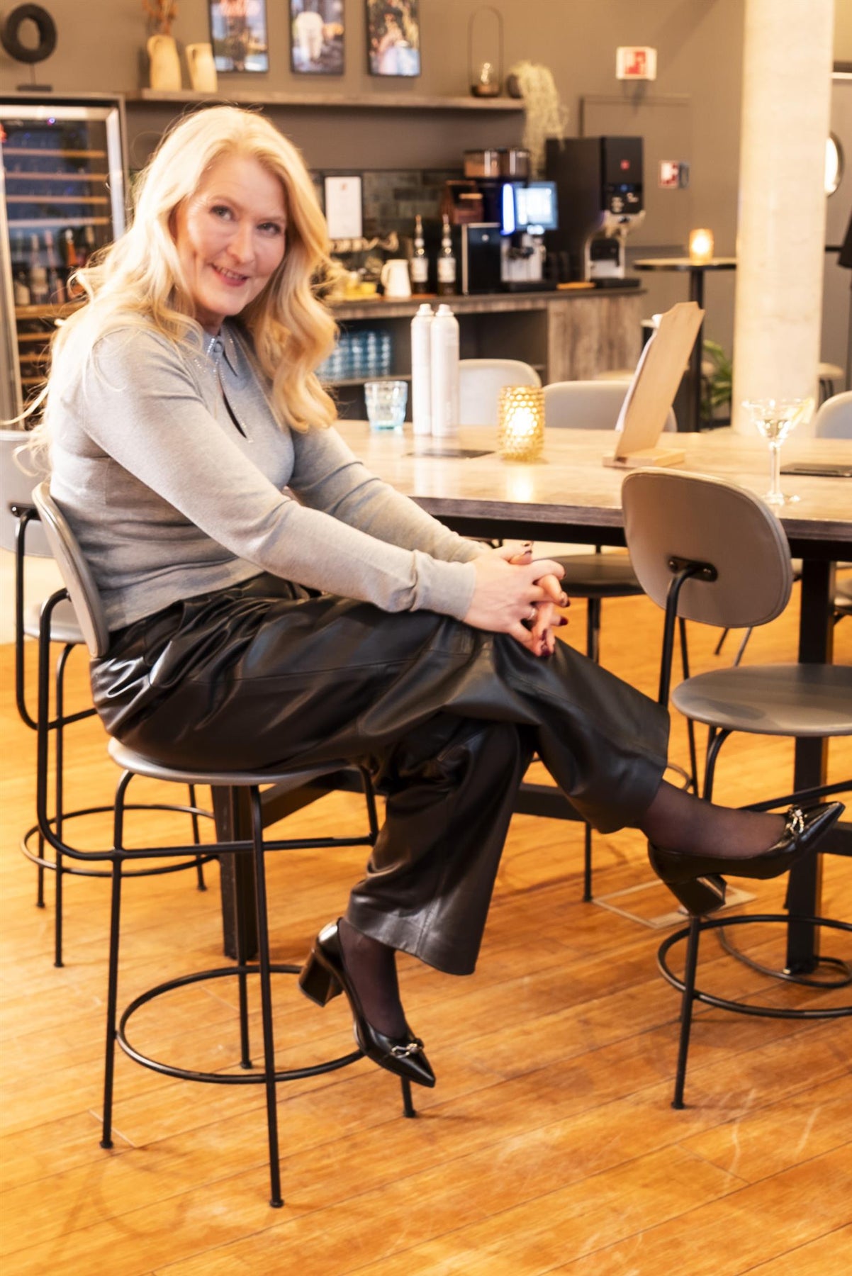 Vår egen modell er 169 og har str. M. Skinnbuksen er Brodia fra InWear.