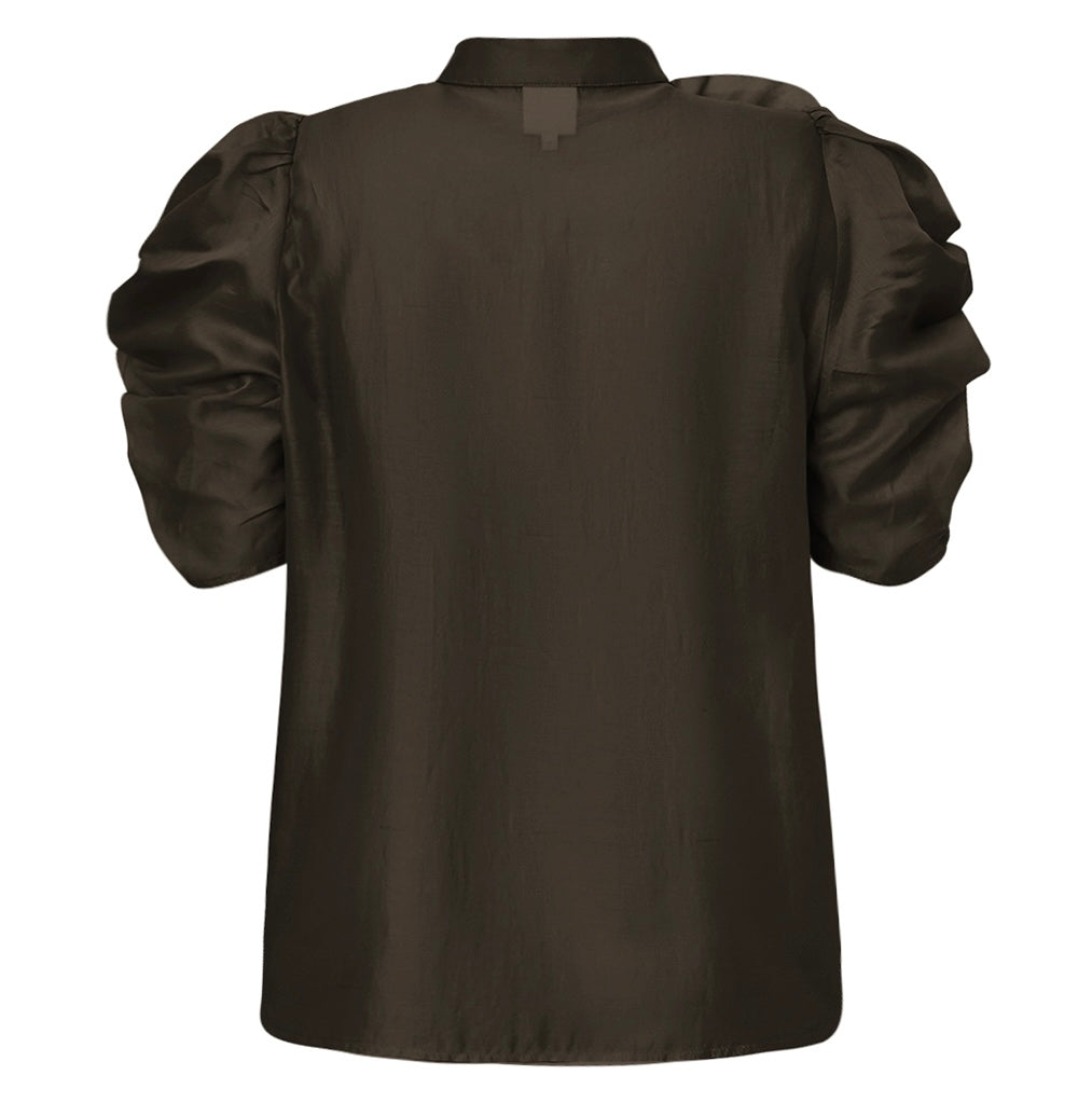Vakker og spesiell bluse med korte ermer som har en distinkt puffet effekt, som gir en dramatisk og moderne silhuett. Ermene er voluminøse og skaper et stilig utseende. Blusen har en høy hals som lukkes med en knapp foran og en svært dekorativ blomst på den ene siden.