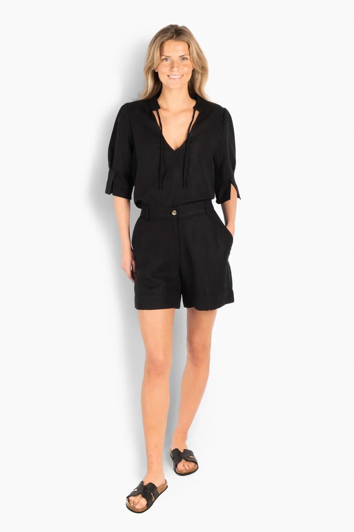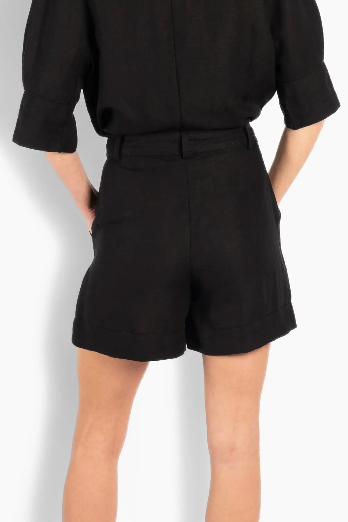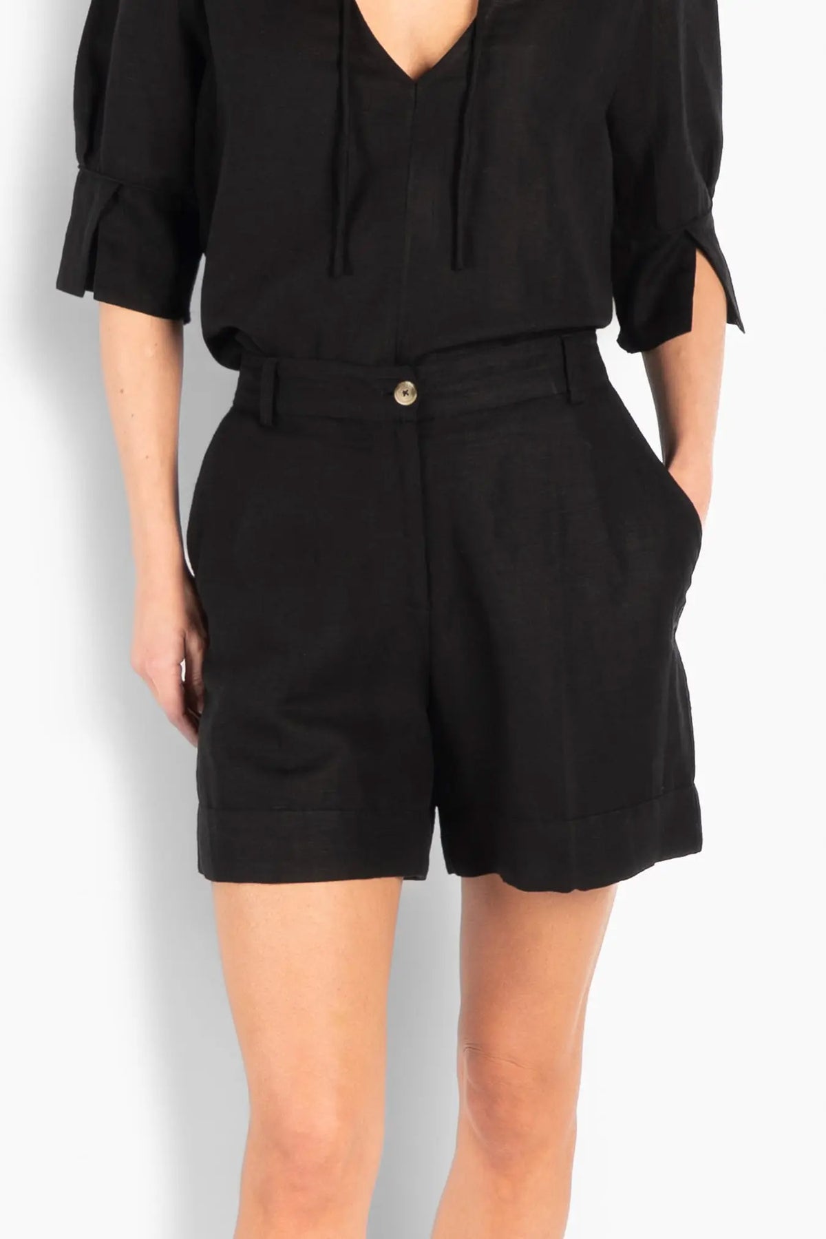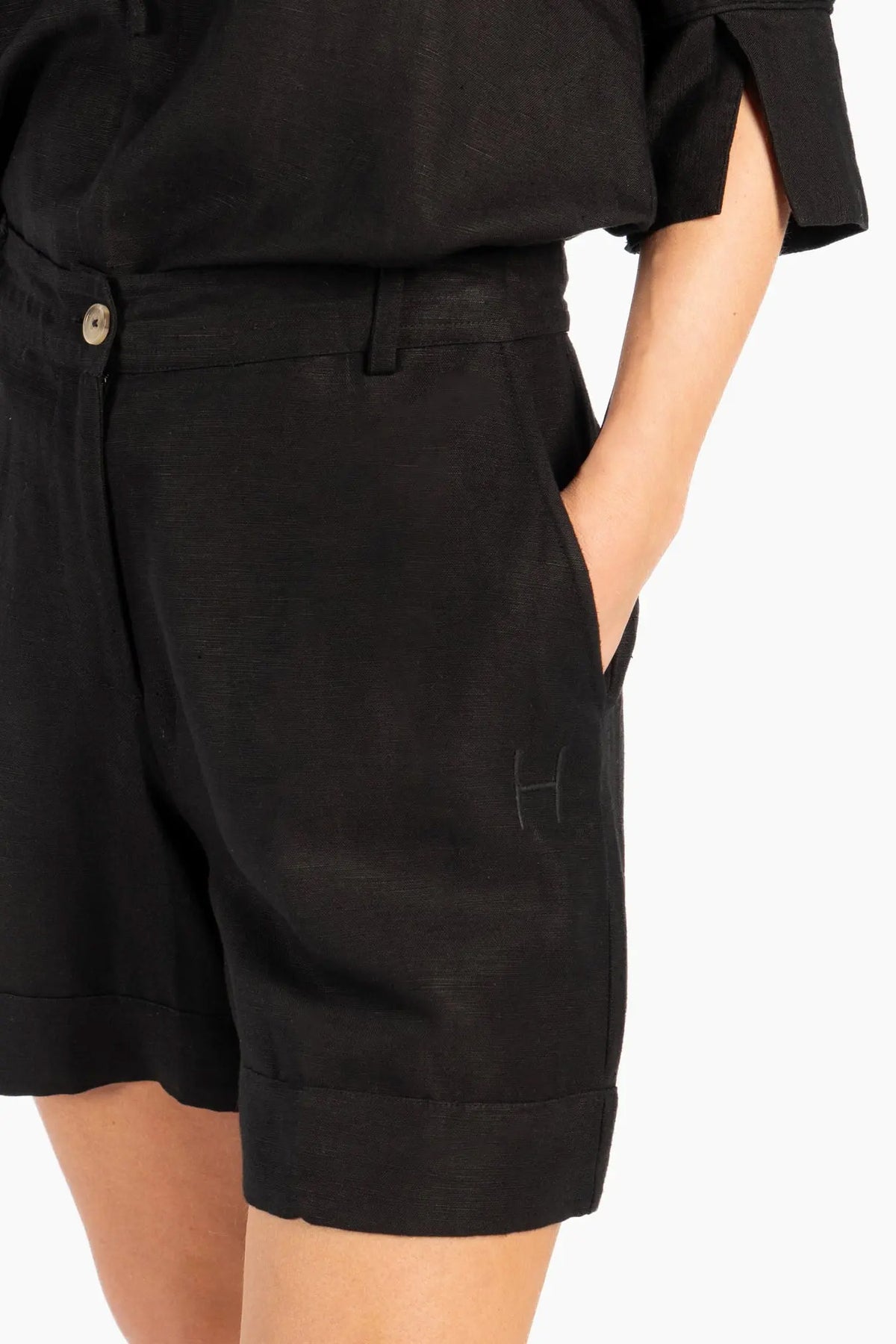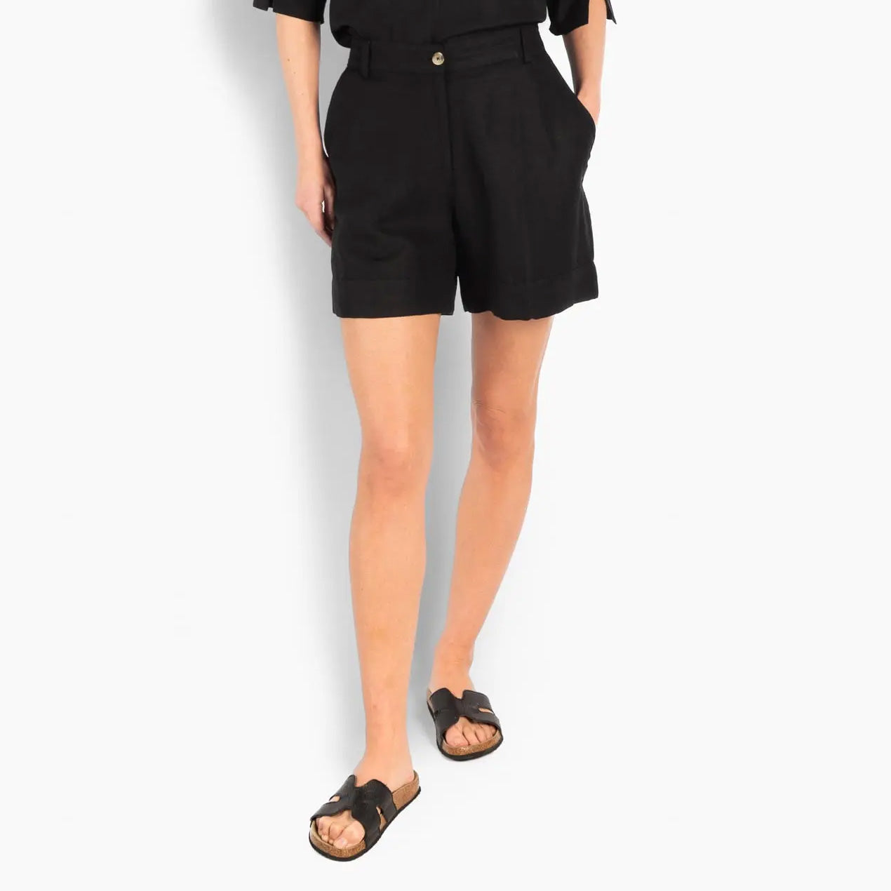 Skreddersydde shorts designet med en ren, strukturert silhuett. Laget av en pustende blanding av lin og viskose, gir de en lett følelse og et mykt, naturlig fall.