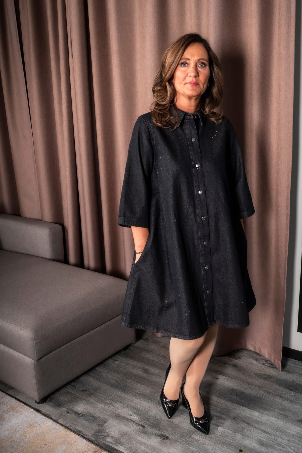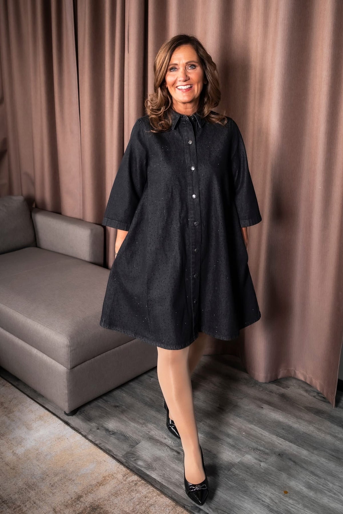 Denimkjole overstrødd med sorte paljetter/studs, løs A-form og klassisk krage. Knapper i front, trekvart lange ermer og praktiske sidelommer gir en tidløs stil.