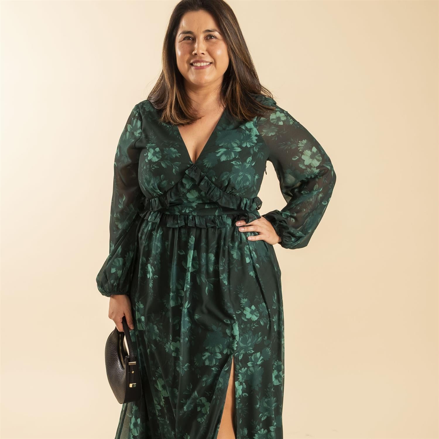 Ankelsid kjole i delikat chiffon med v-hals. To tekstiltrukne knapper i nakken og tildels åpen rygg. Liten smock i ryggen. Kjolen har en mørk korallfarge med blomsterprint i røde toner. Lange, gjennomsiktige ermer i chiffon med en vid ballongform og tynn strikk ytterst. Søte volangdetaljer både foran og bak på kjolen.