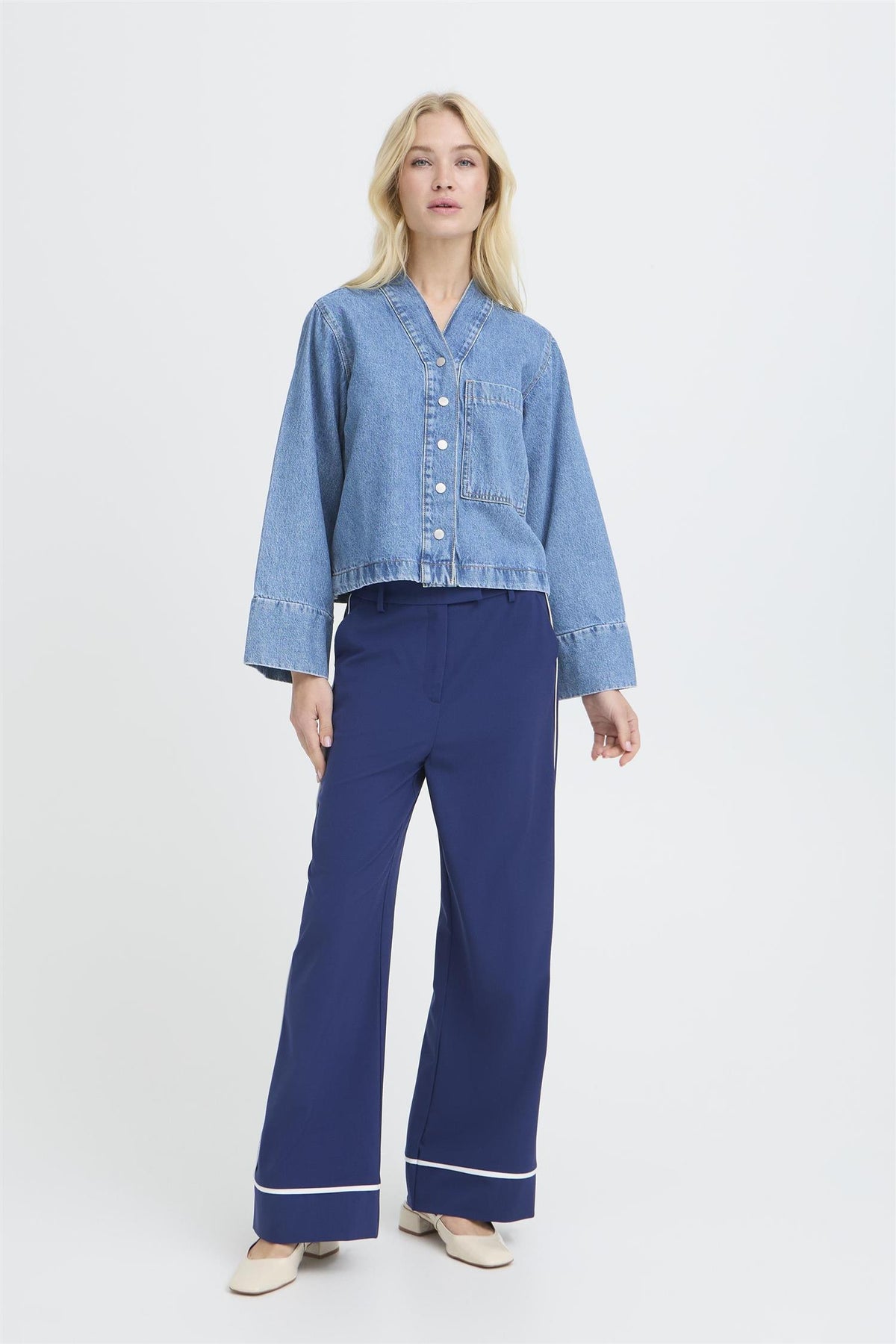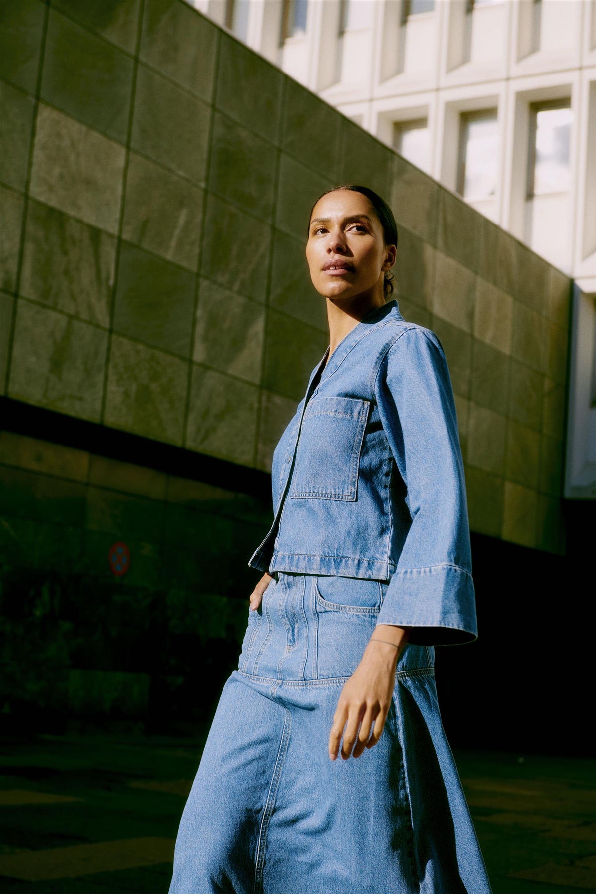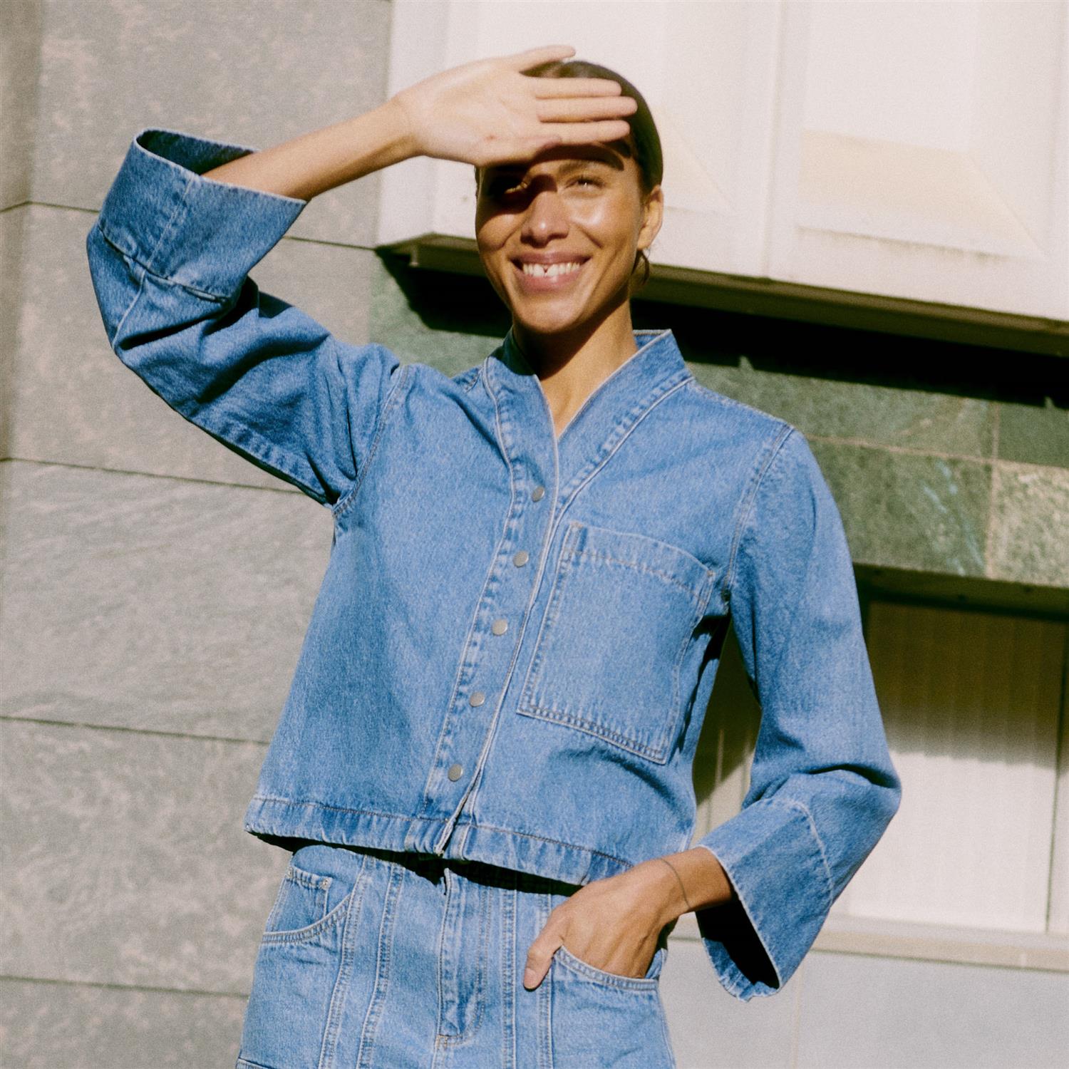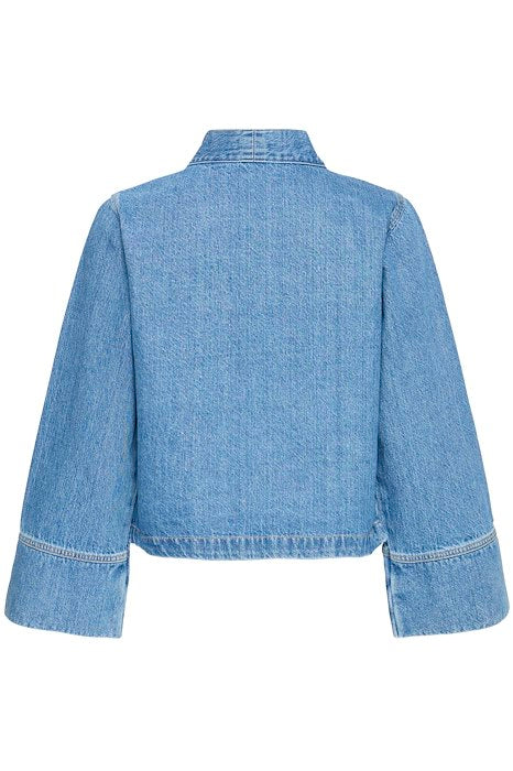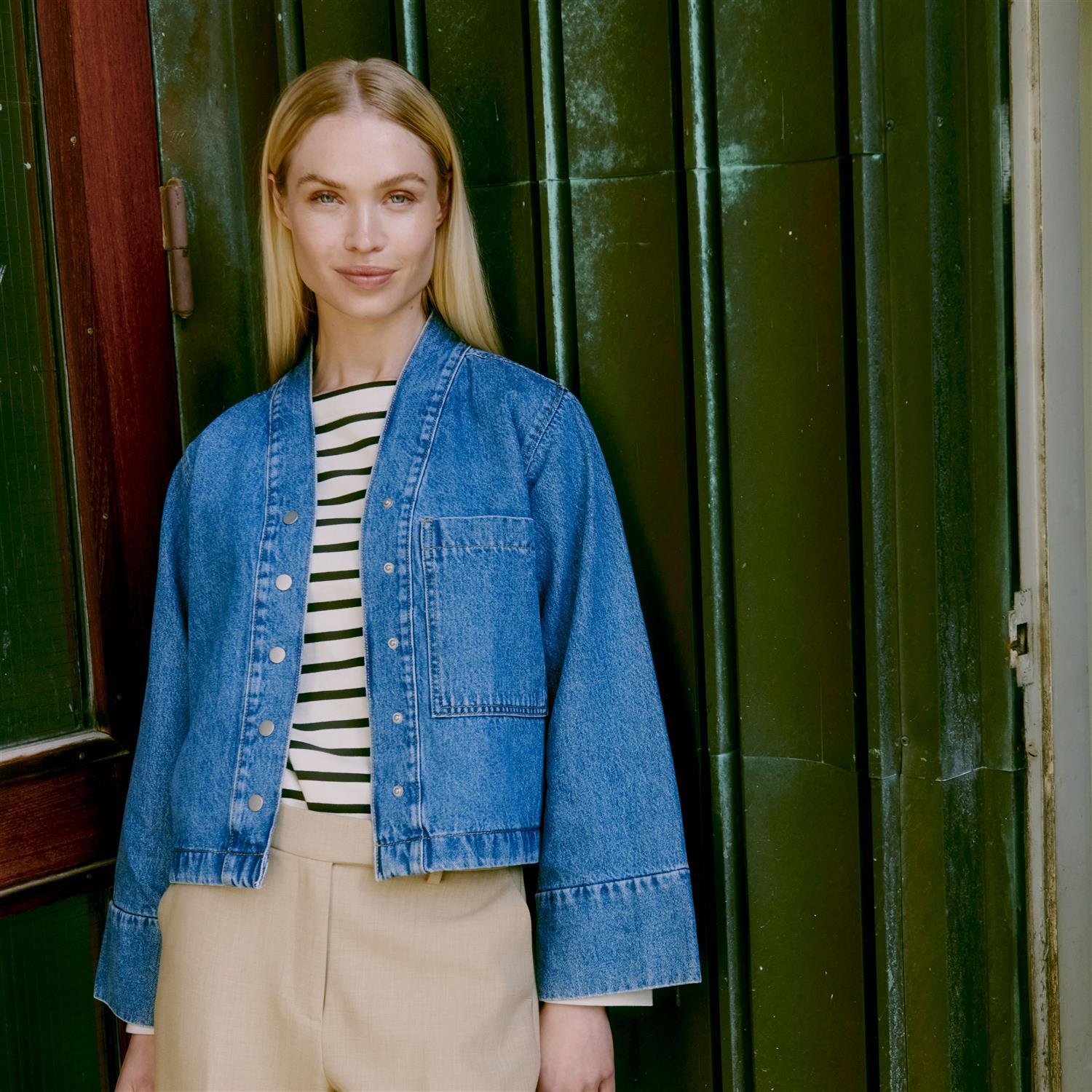 Typete denimjakke med en rett, kort silhuett, brede og rette ermer samt tydelige sømmer.