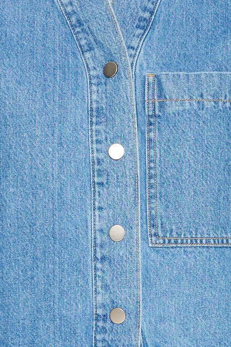 Fronten har en brystlomme, trykknapper og en V-formet ståkrage.