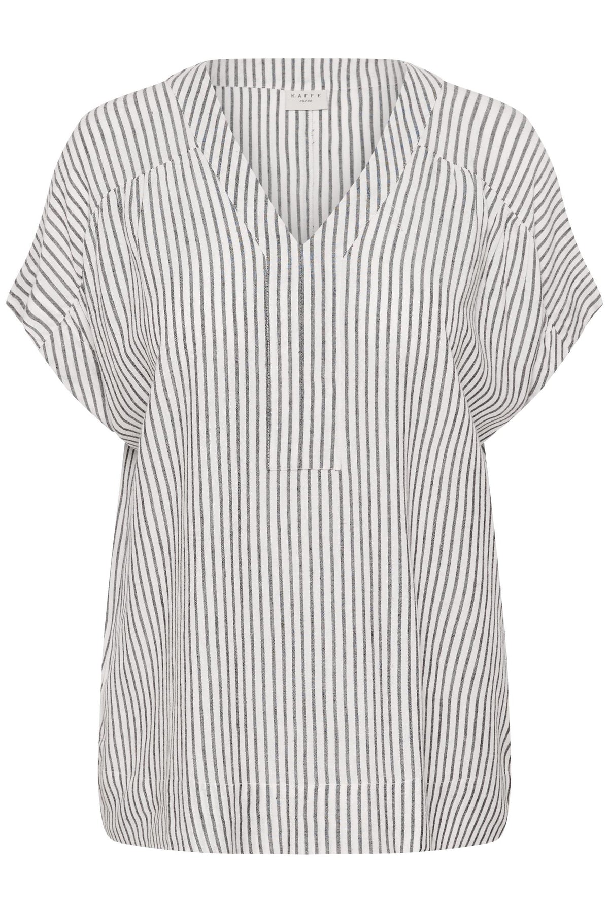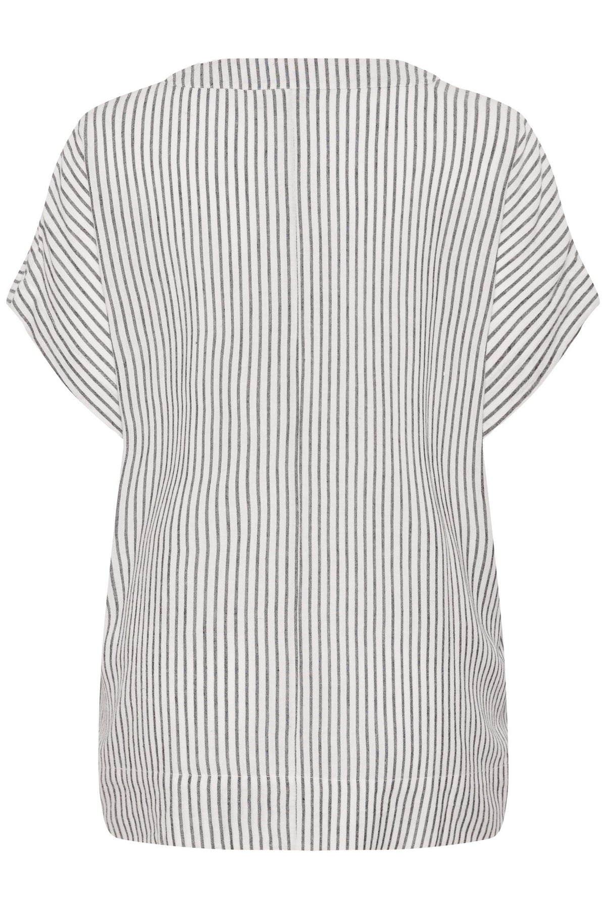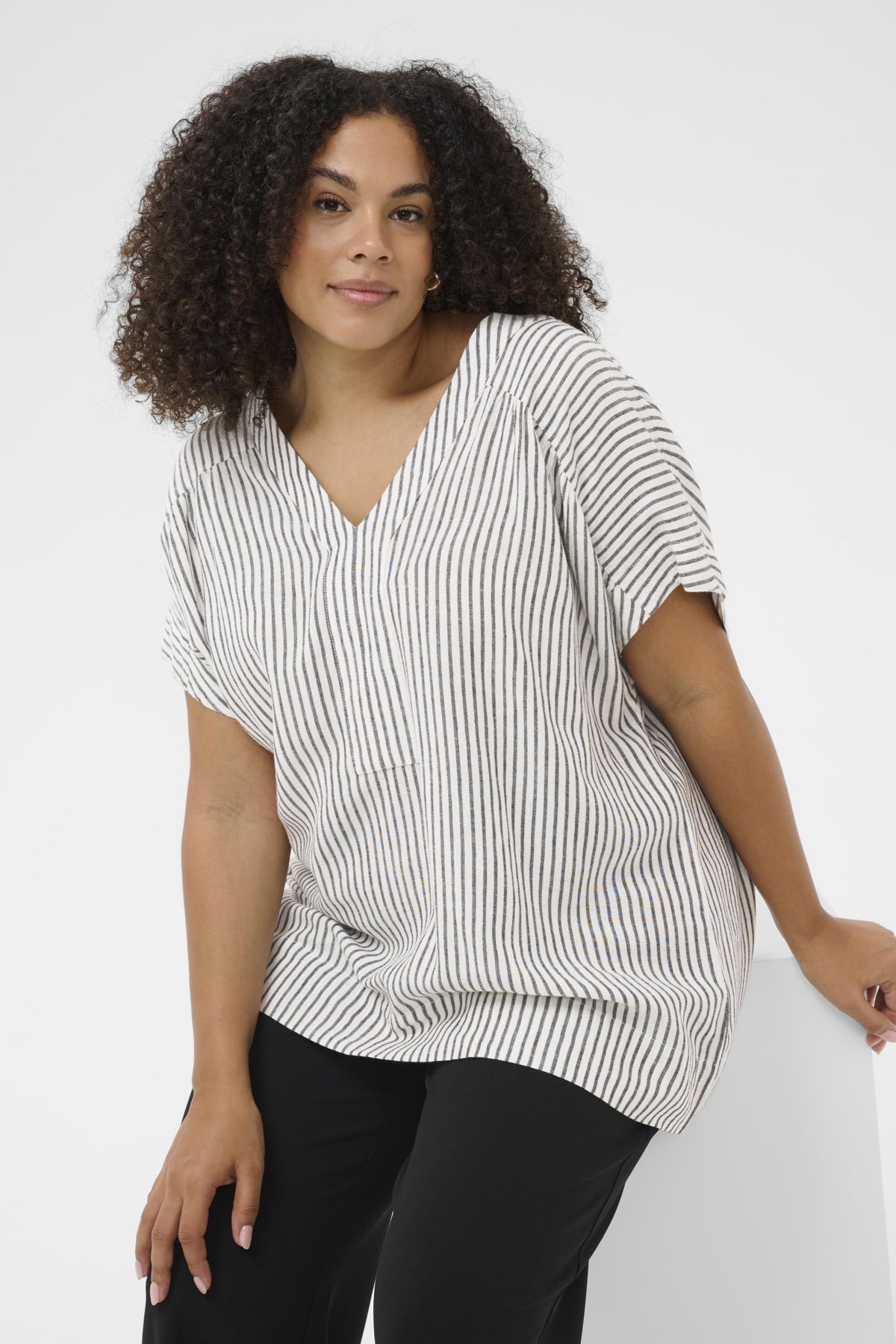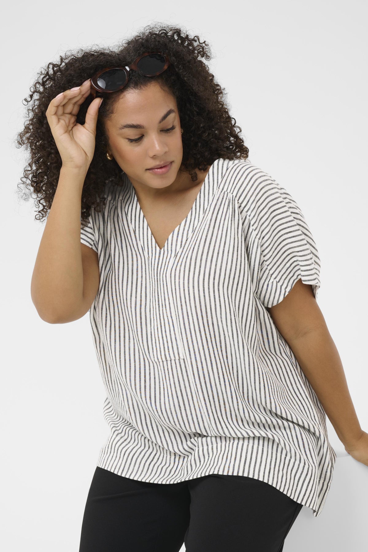Luftig og flott blanding av lin og viscoe med flatterende passform og trendy striper. V-utrigning og korte ermer. Match med buksen med samme navn for komplett antrekk.