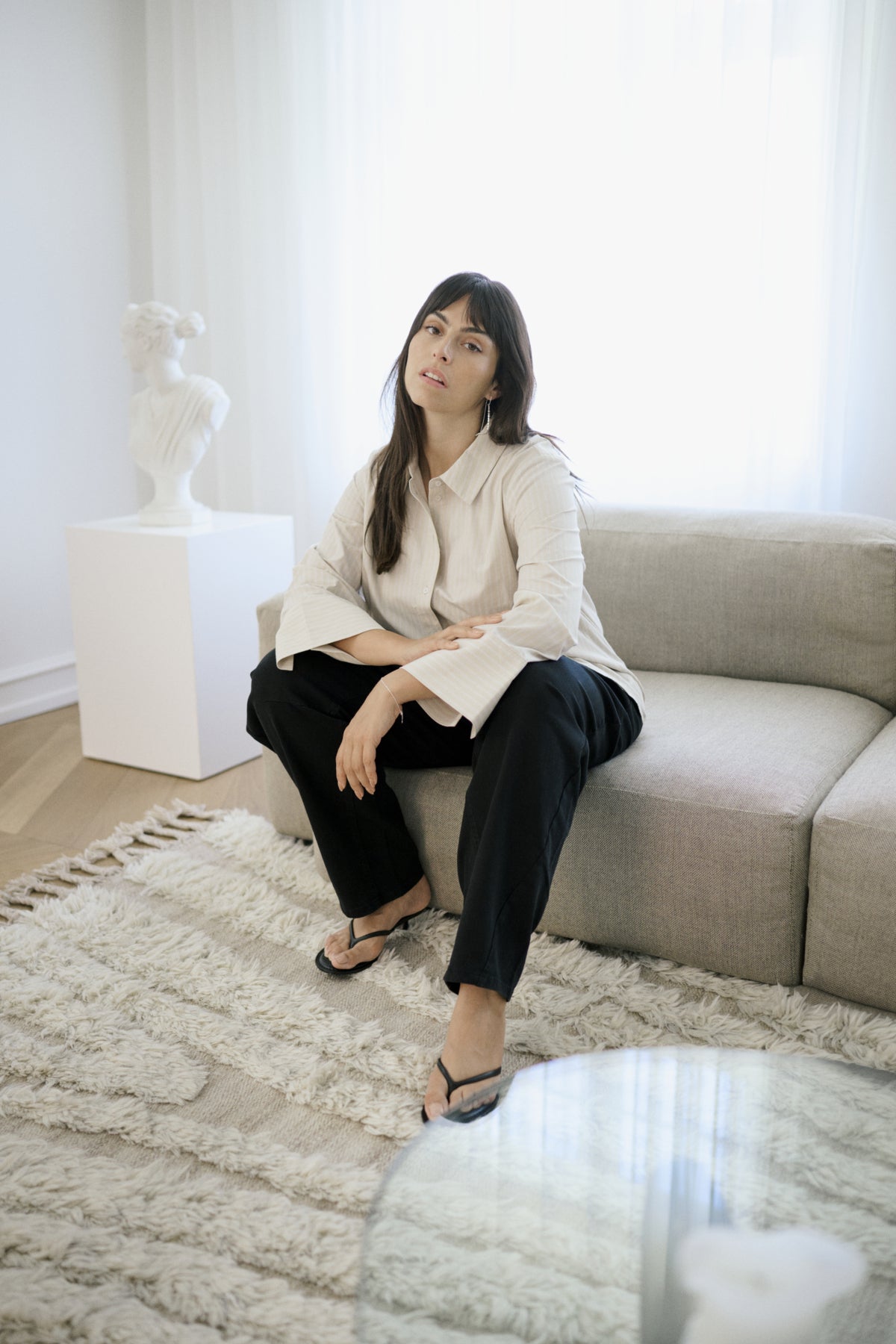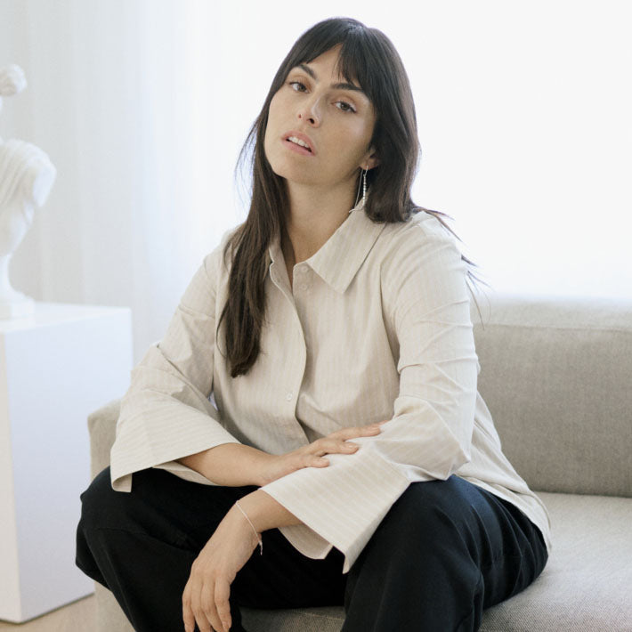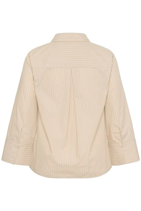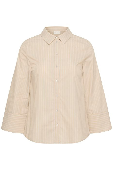 Skjorten har lange, vide ermer med brede mansjetter og svakt avrundet kant nederst.