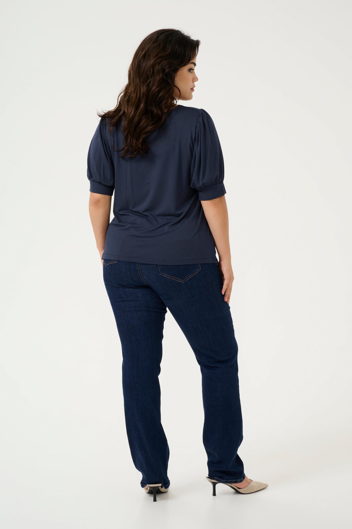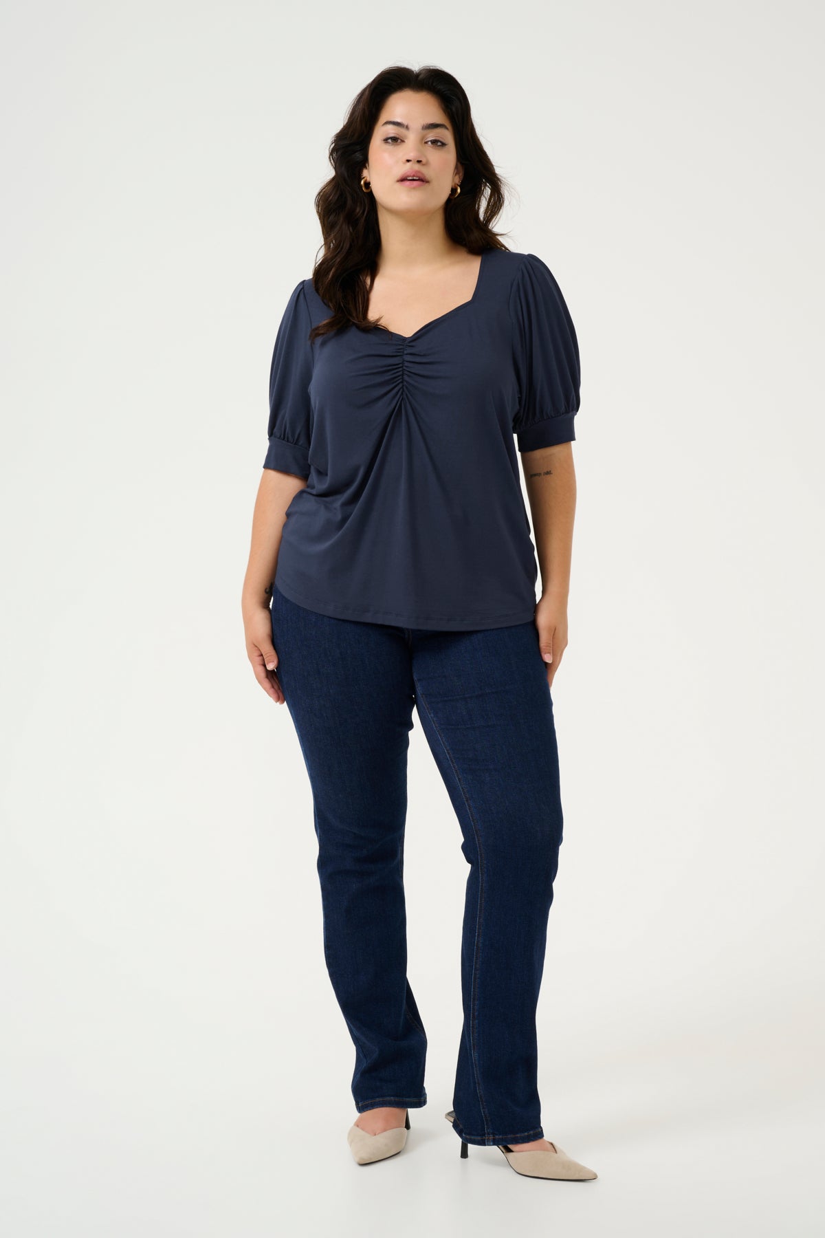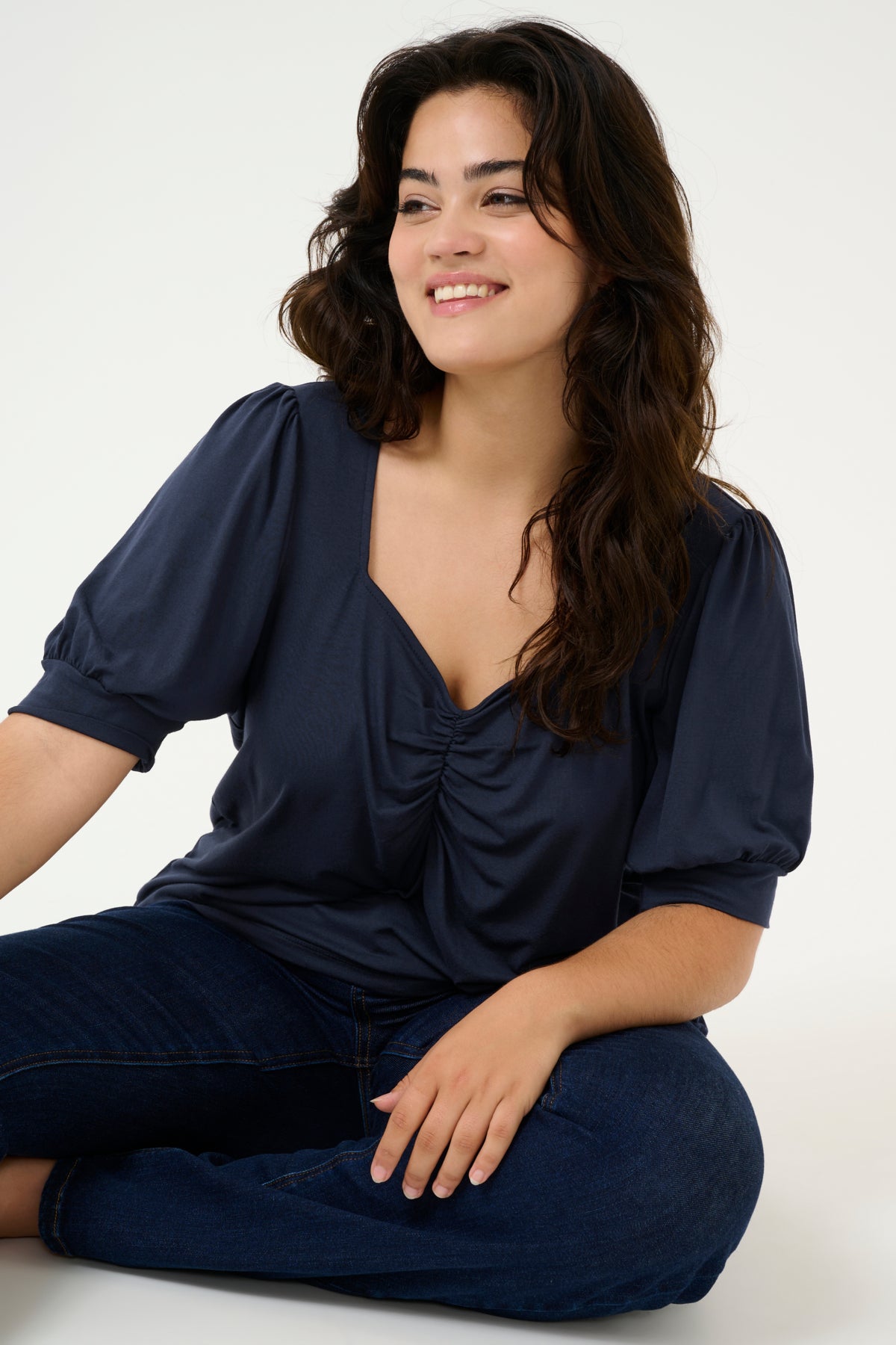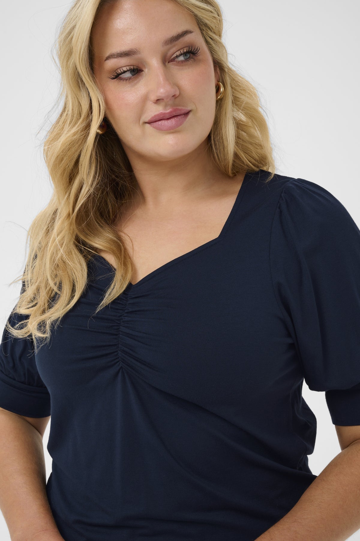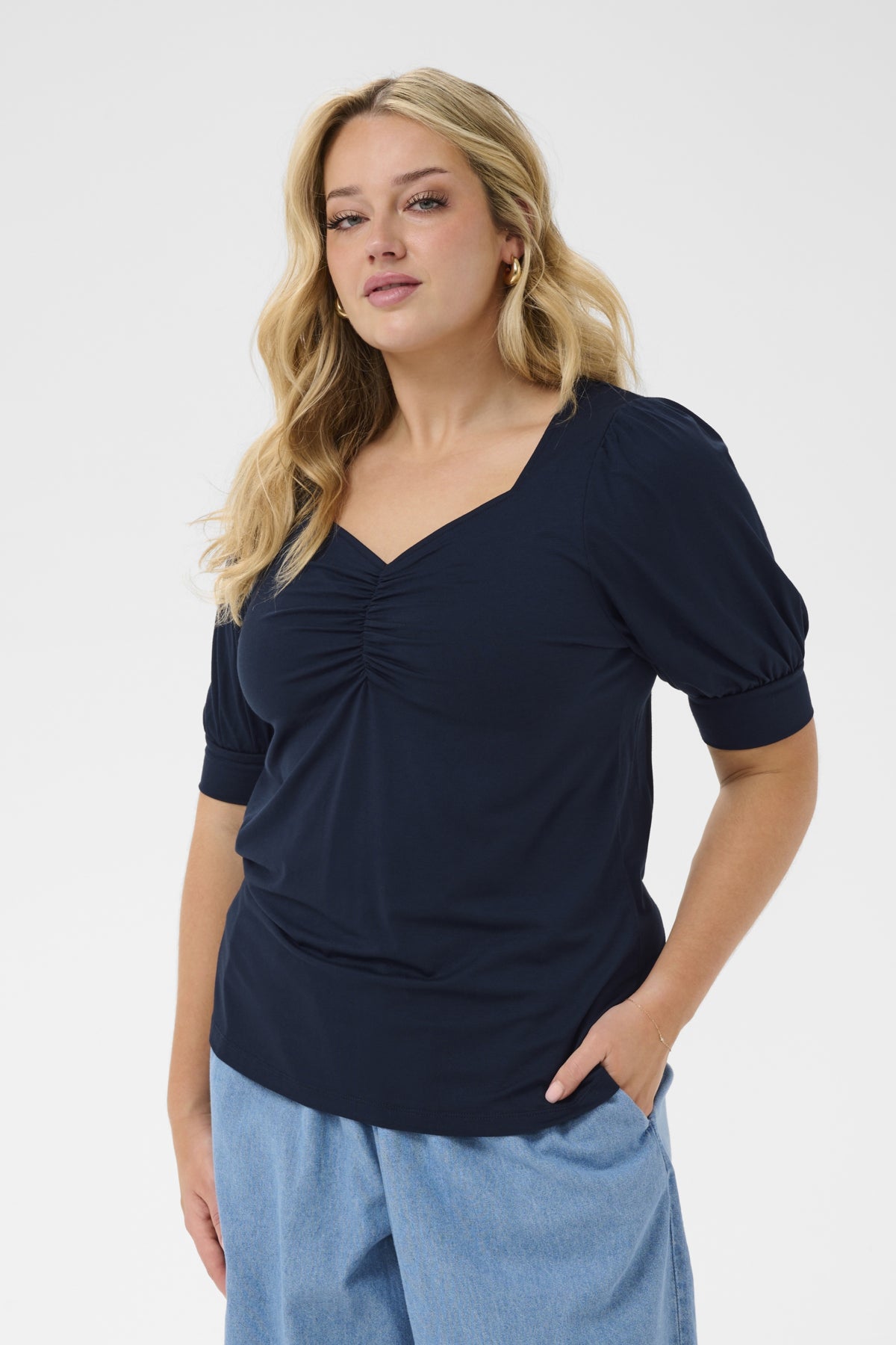 Viscose-topp med flatterende hjerteformet utringning og rynkedetaljer foran. Mykt, elastisk stoff og avslappet passform. Halvlange ermer for allsidig bruk.