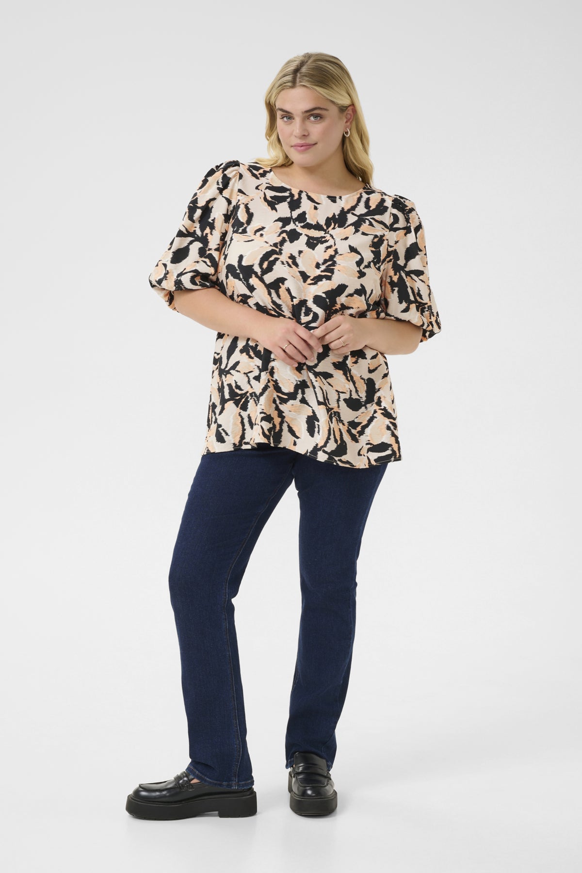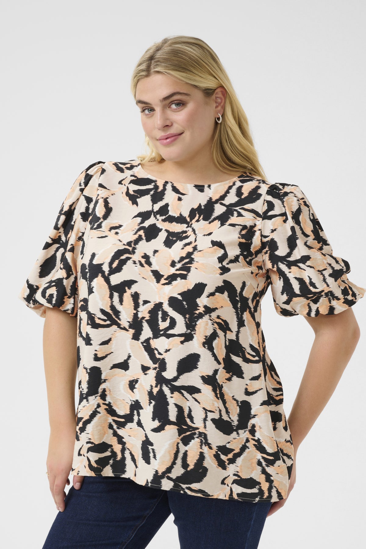 Elegant bluse med løs passform, rund hals og voluminøse korte ermer. Komfortabel design gir allsidighet til både hverdag og fest. Herlig stoff som faller pent og mønster som er skjulende.