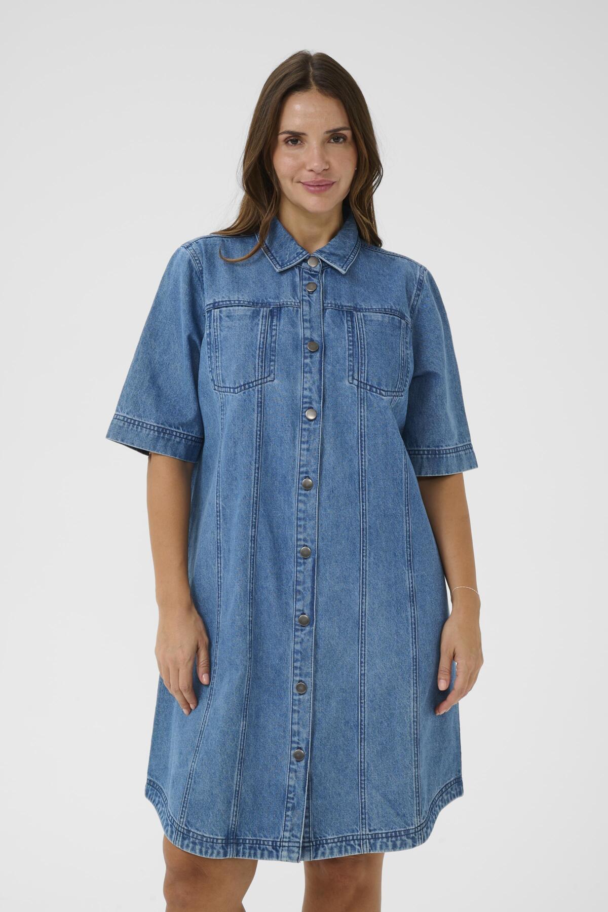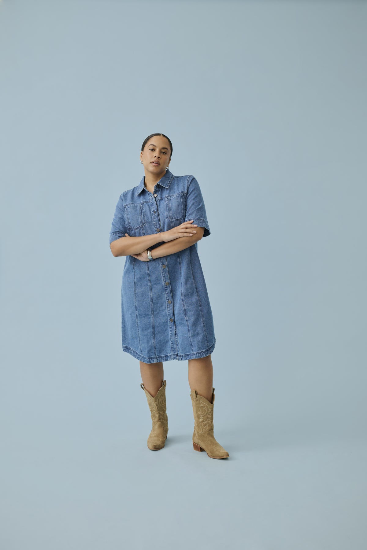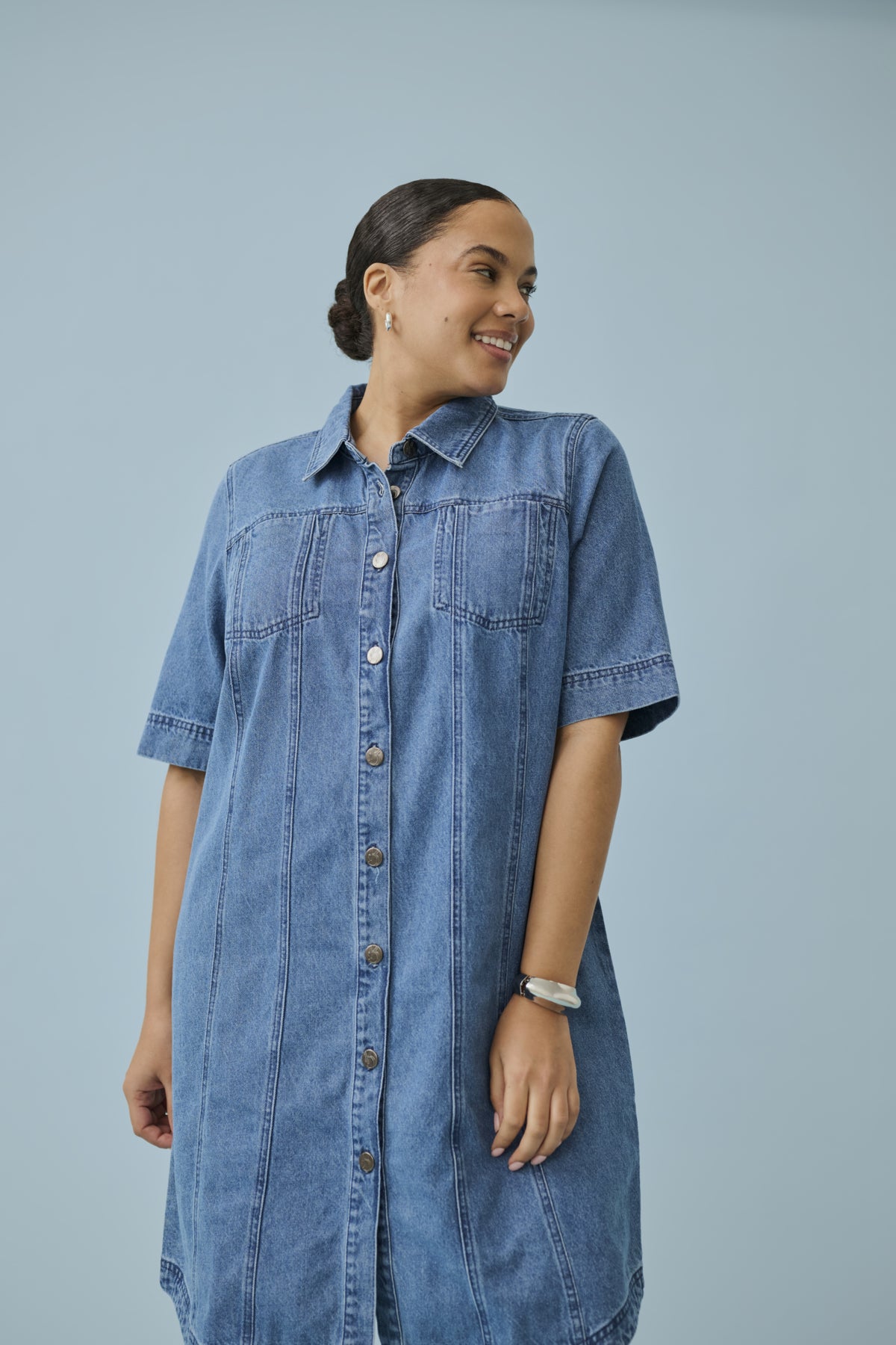 Skikkelig tøff denimkjole med rett, svakt utsvinget fasong og synlige vertikale sømmer. Modellen har klassisk krage, halv lange ermer, full knappestolpe med metallknapper og to brystlommer.