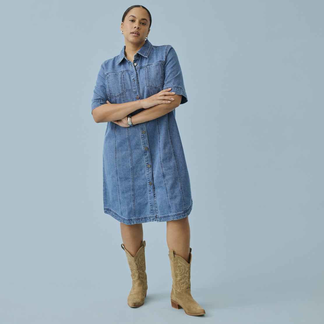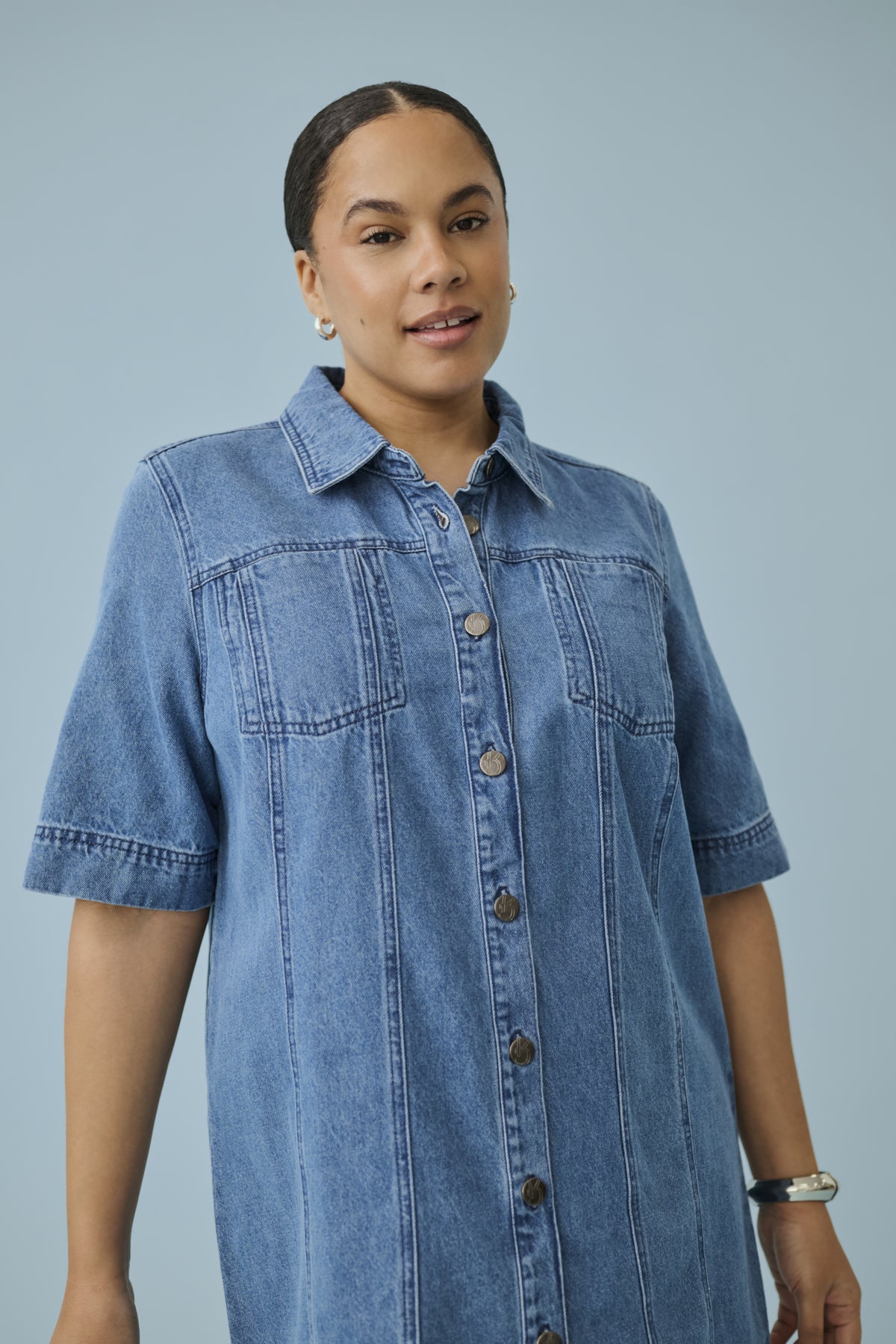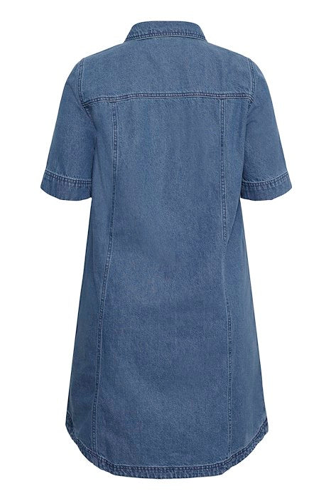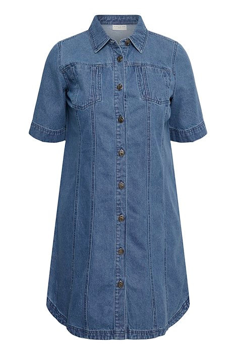Skikkelig tøff denimkjole med rett, svakt utsvinget fasong og synlige vertikale sømmer. Modellen har klassisk krage, halv lange ermer, full knappestolpe med metallknapper og to brystlommer.