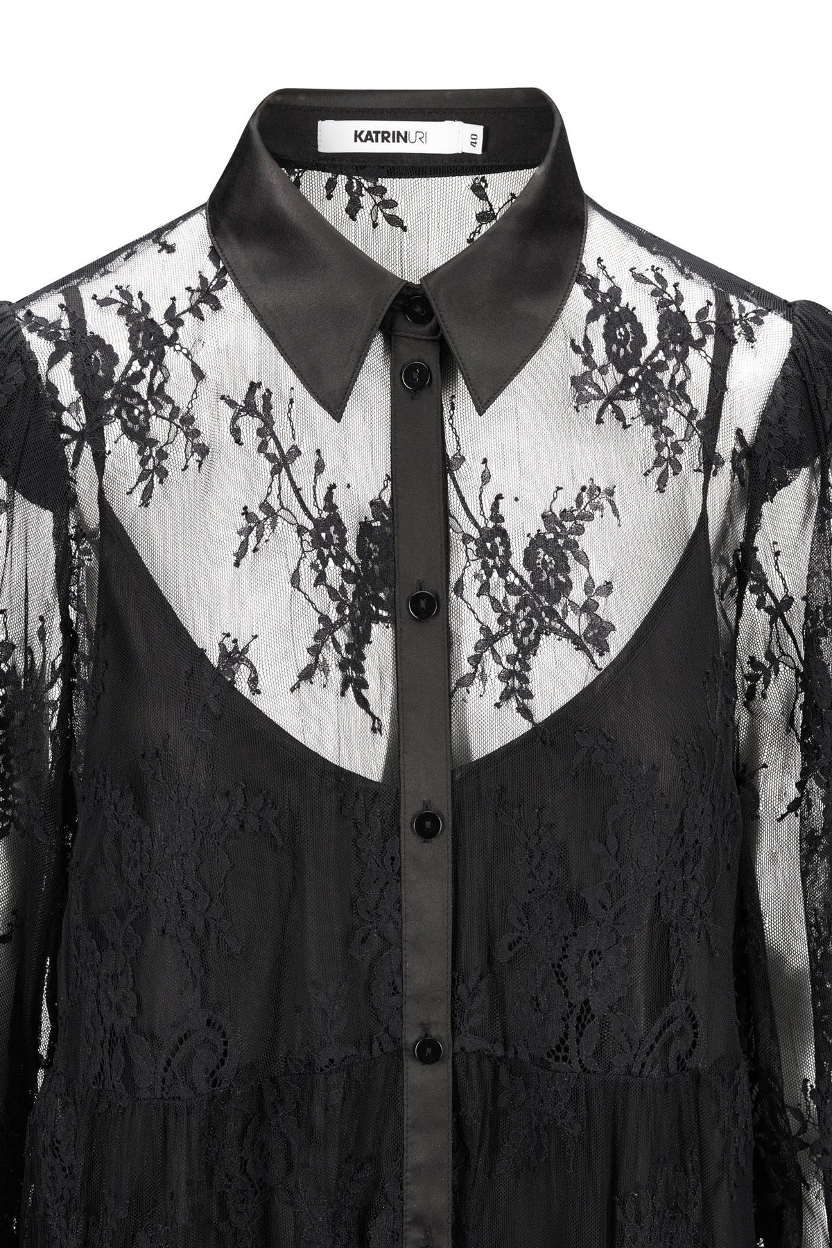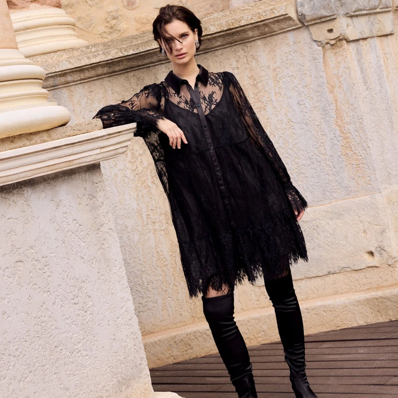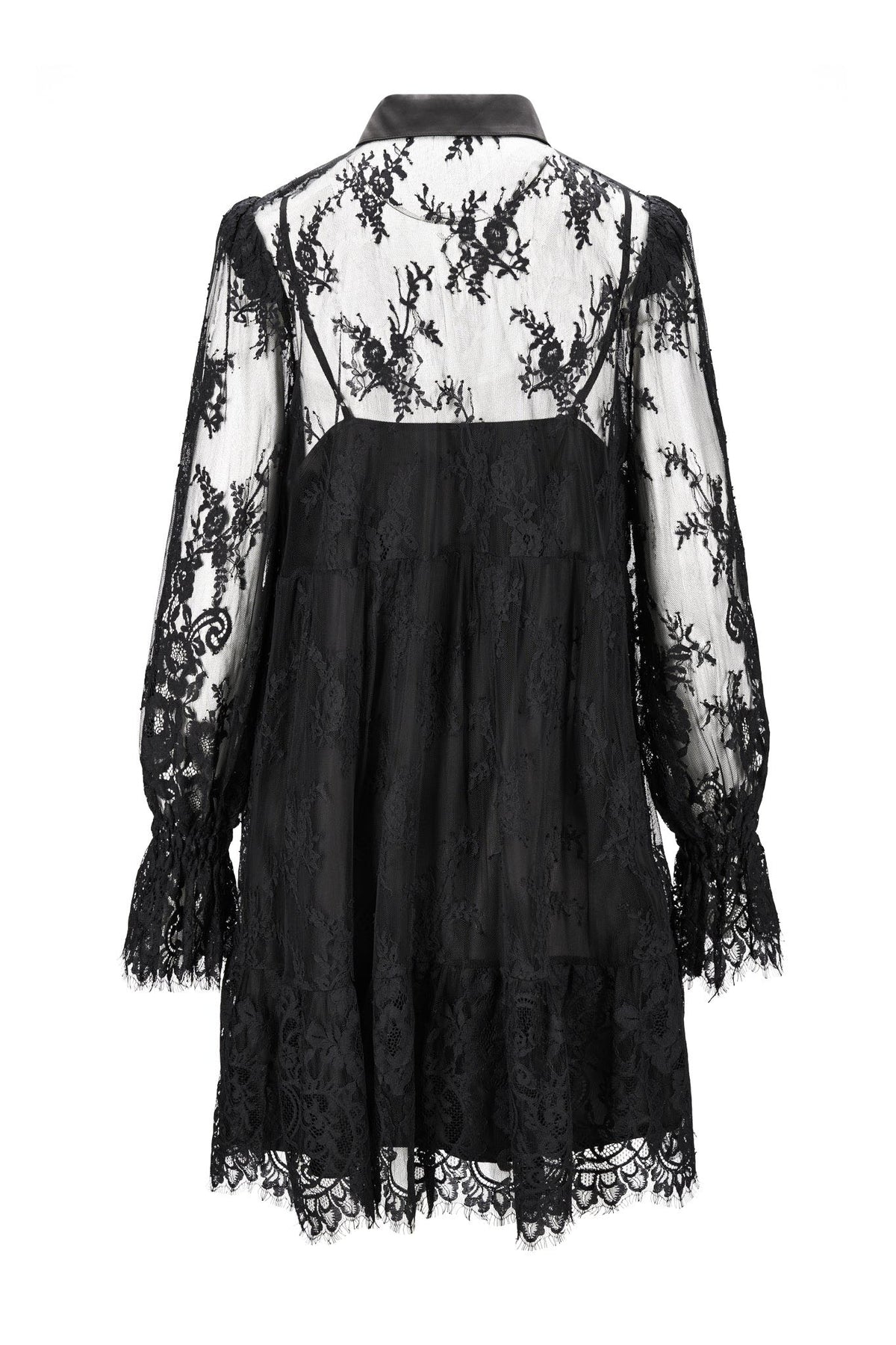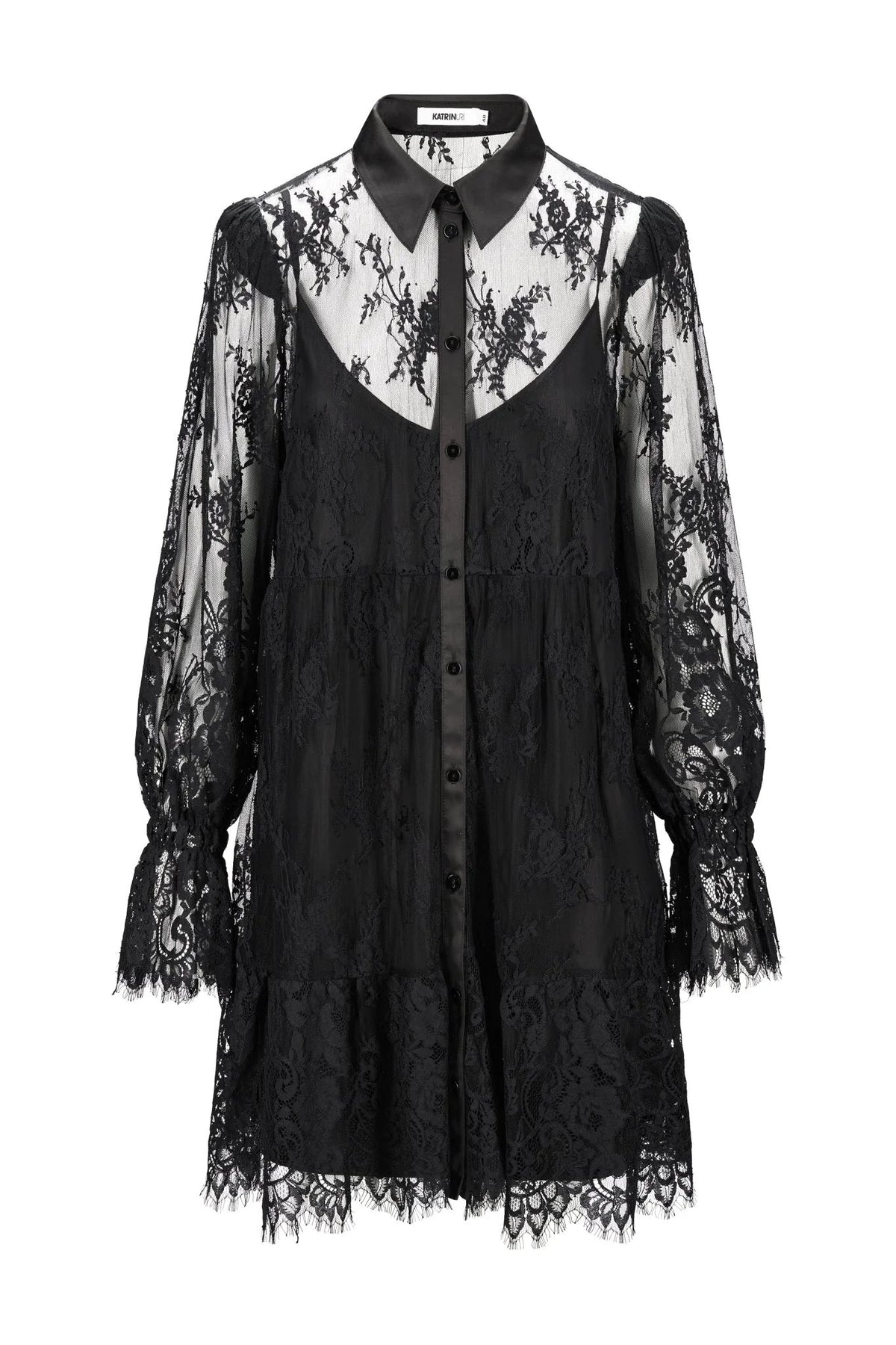 Elegant og typete kjole med praktisk vidde og kombinasjon med blonder, sateng-krage, knappestolpe og en markering av skulderpartiet.