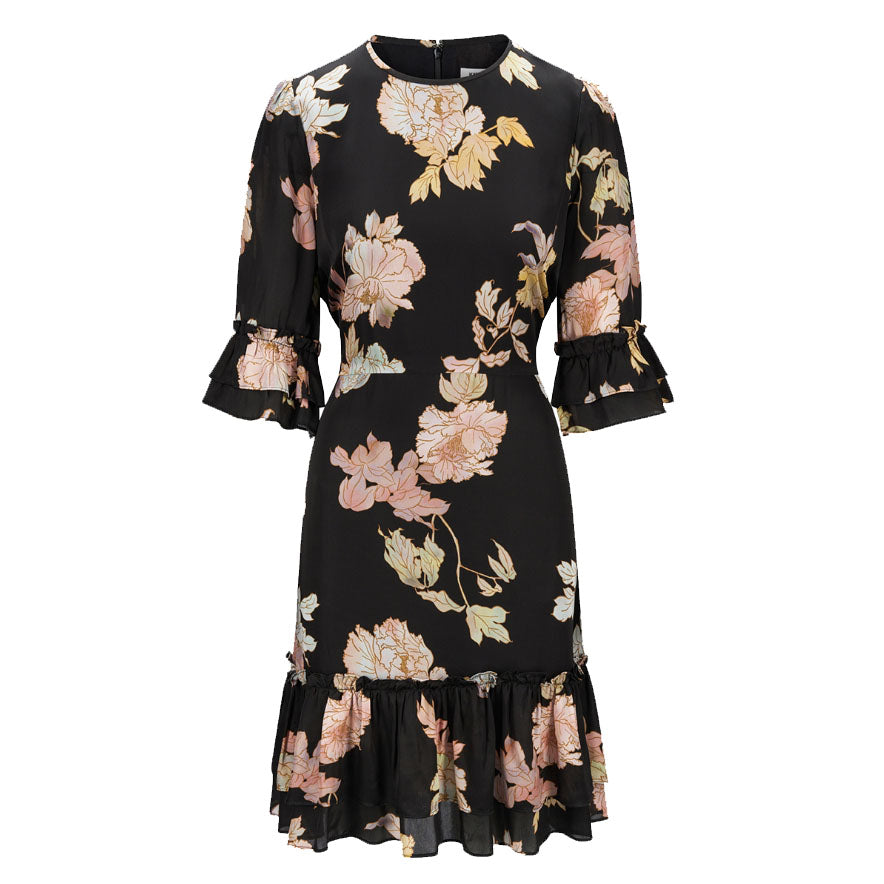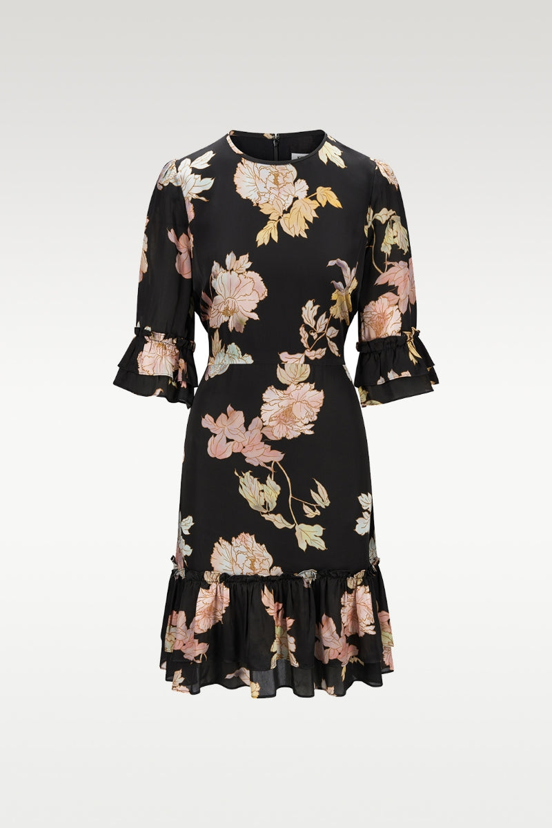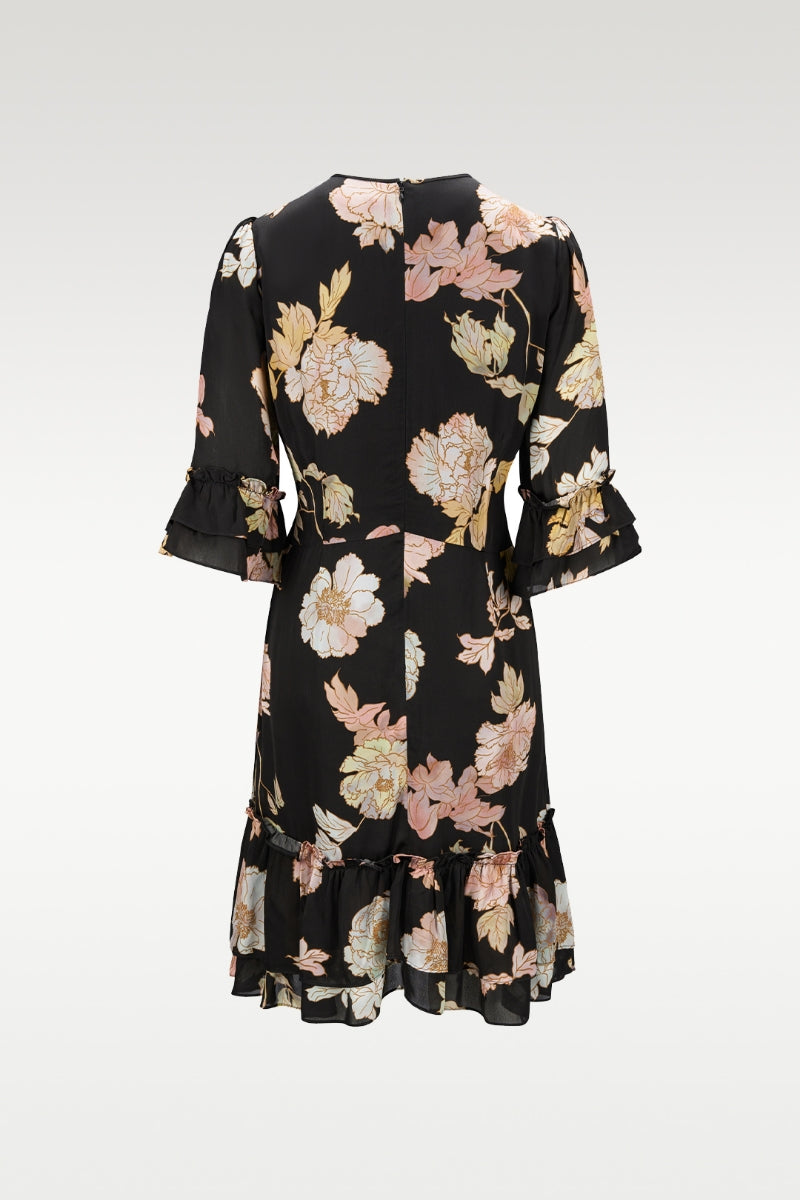 Stilfullt kjole som utstråler en sofistikert eleganse, og har trekvart lange armer med volang. Rynker på skuldrene, volanger på 3/4 ermer og nede i avslutningen som gir den et feminint trekk.