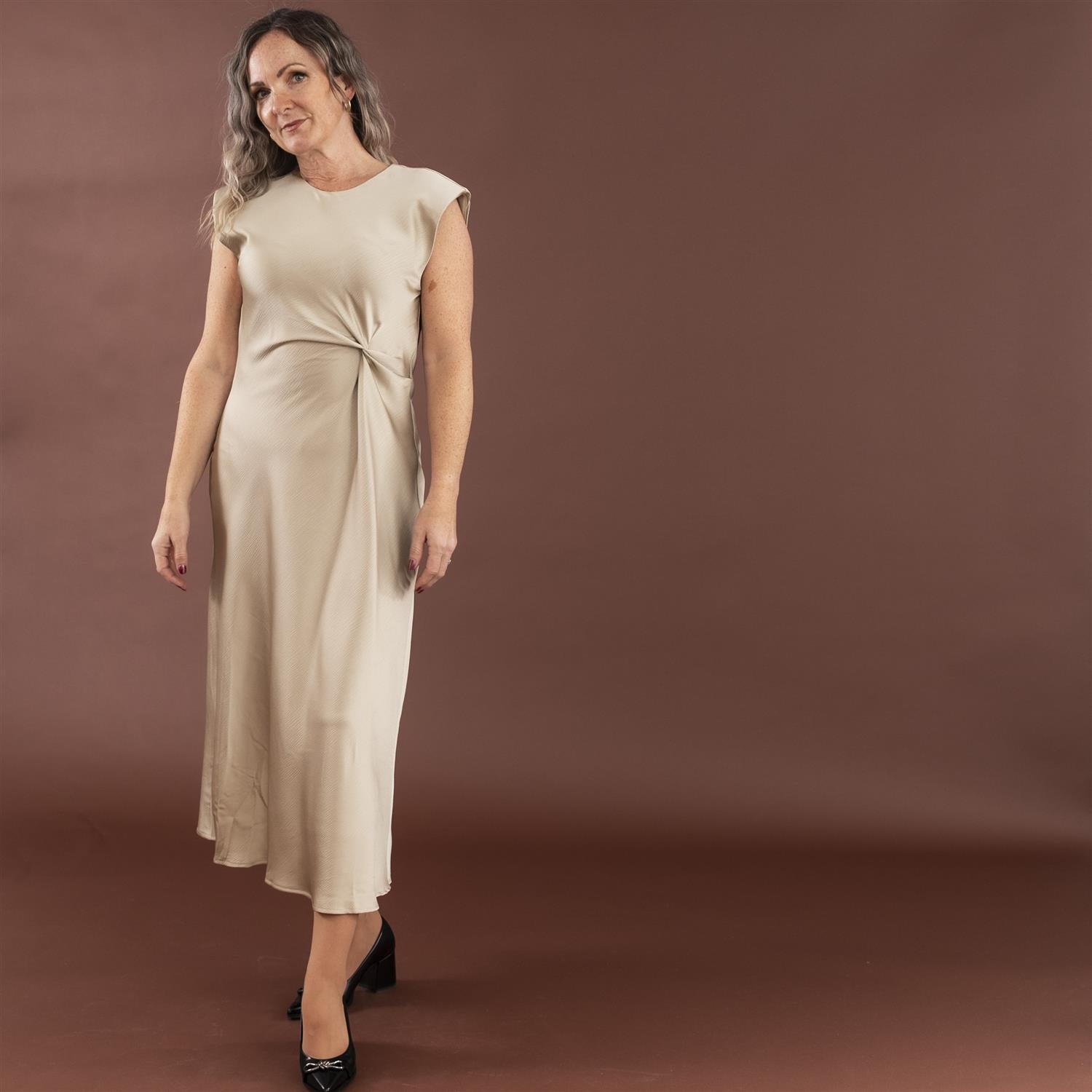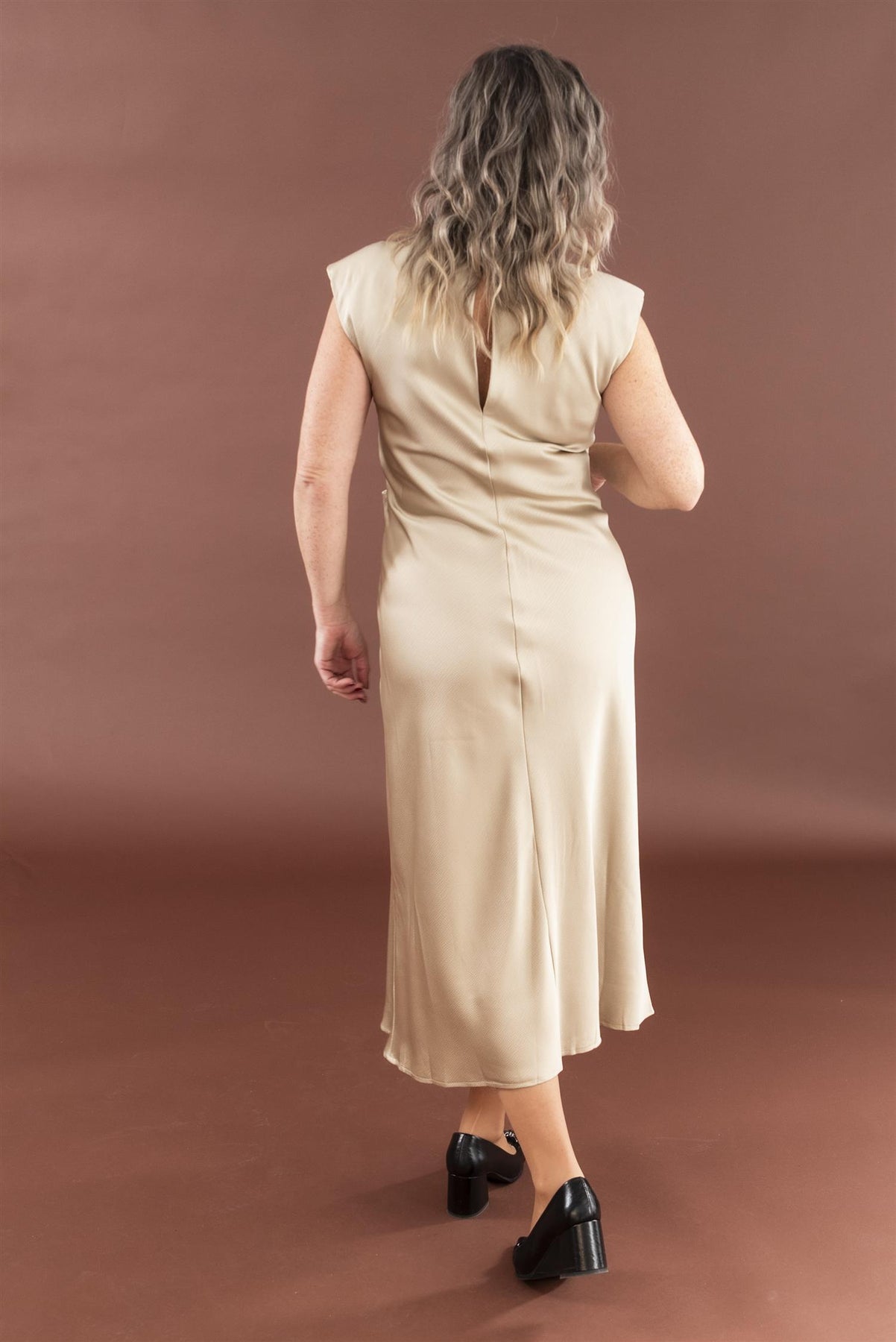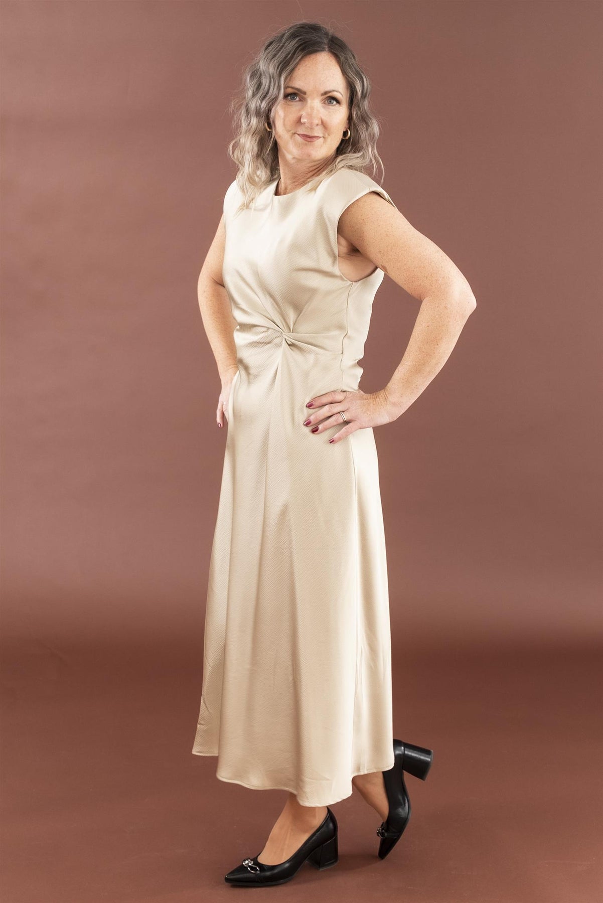 Nydelig kjole i flatterende design og lekker shiny kvalitet. Skulderputer som fremhever samt gir inntrykk av smalere midje.