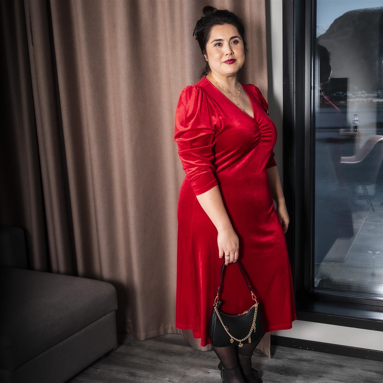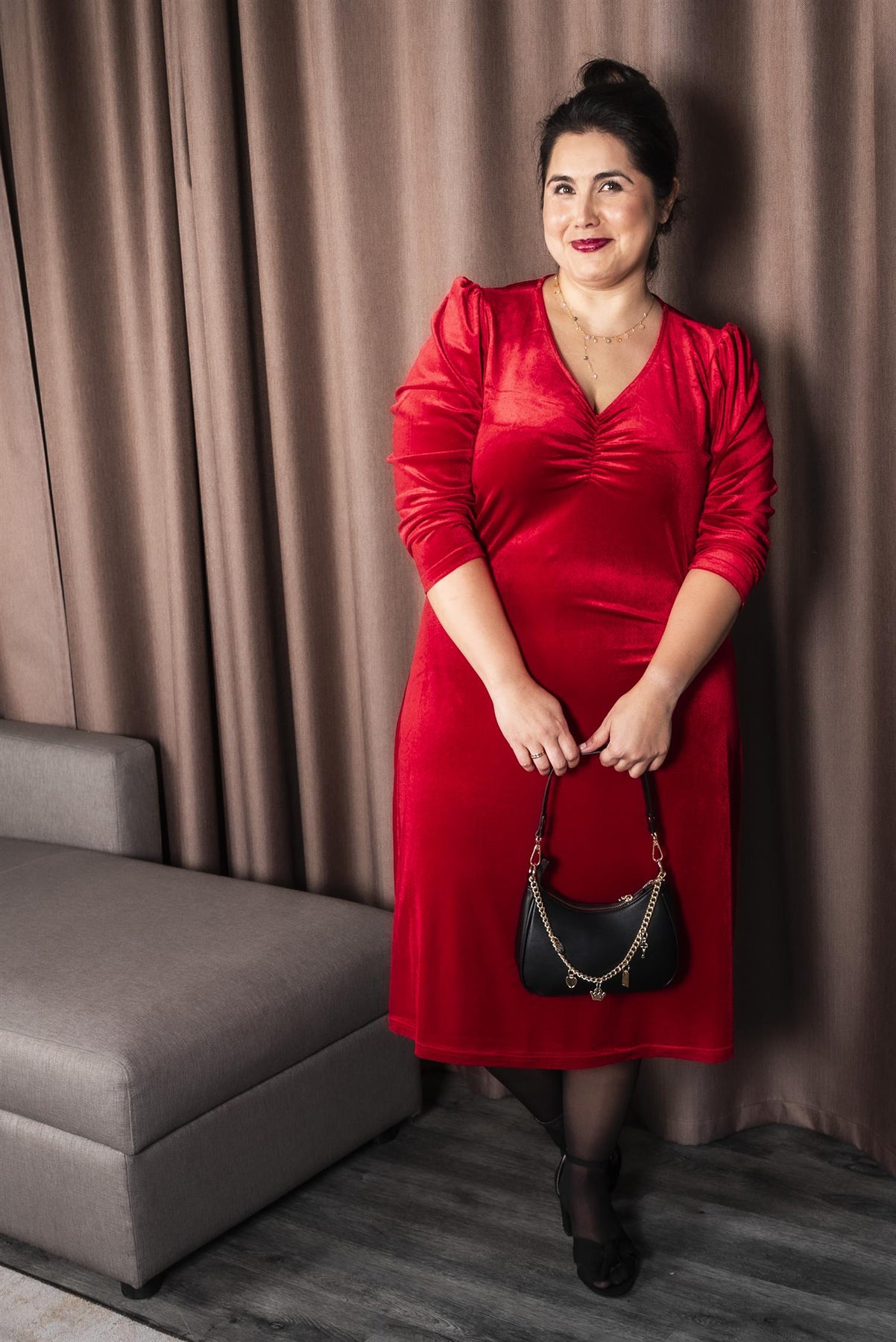 Myk og skimrende velour midikjole i flatterende A-form, V-utringning, lange ermer og lett rynkedetalj over bysten. Snill lengde som går helt ned til knærne.