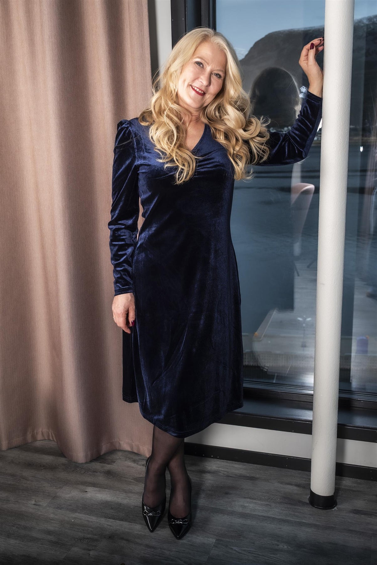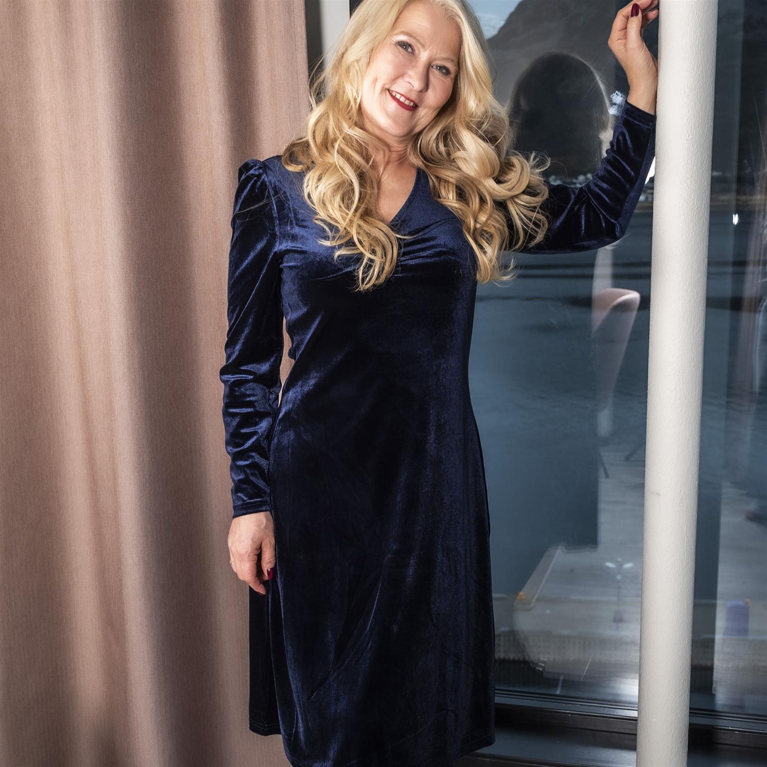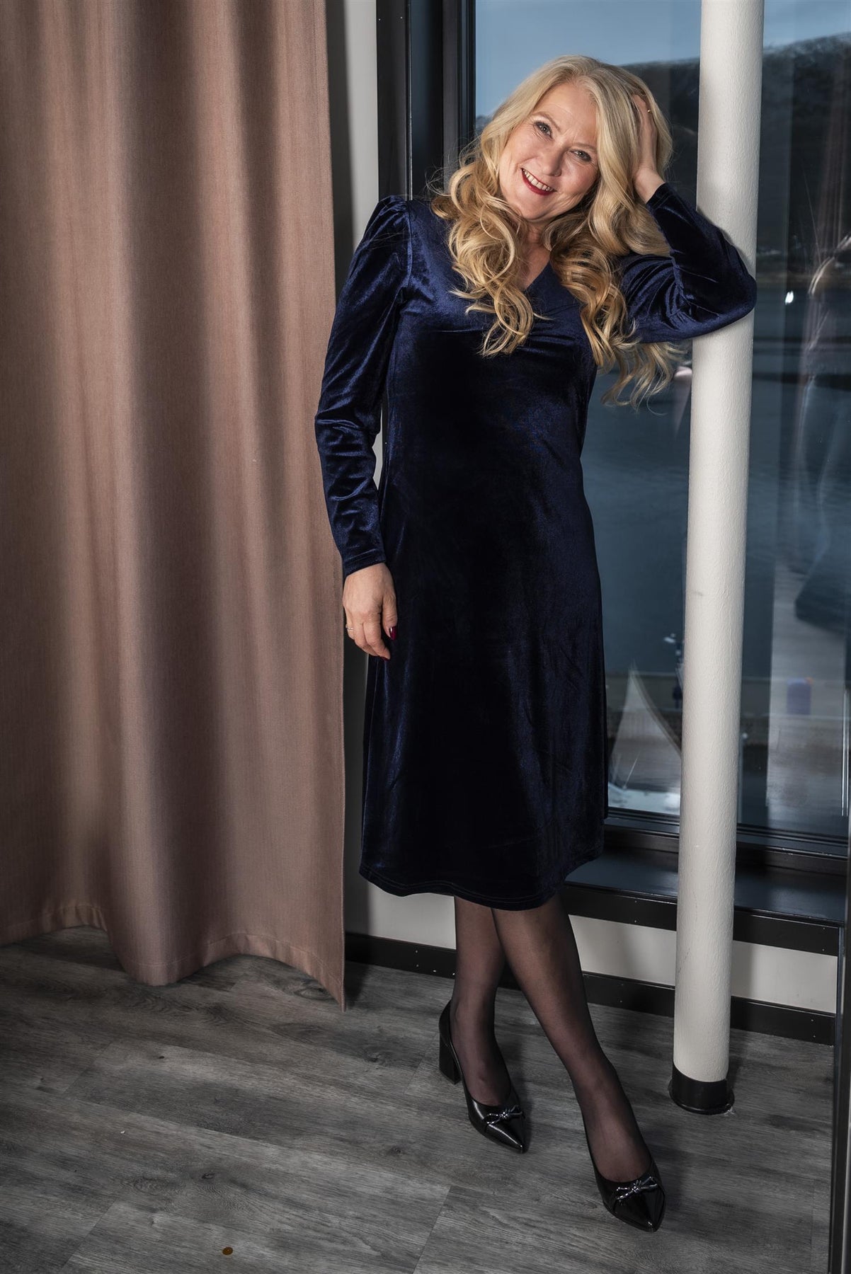 Myk og skimrende velour midikjole i flatterende A-form, V-utringning, lange ermer og lett rynkedetalj over bysten. Snill lengde som går helt ned til knærne.