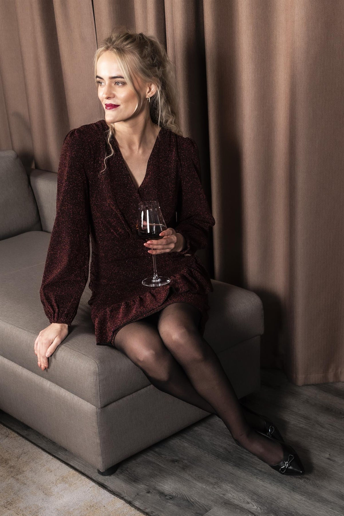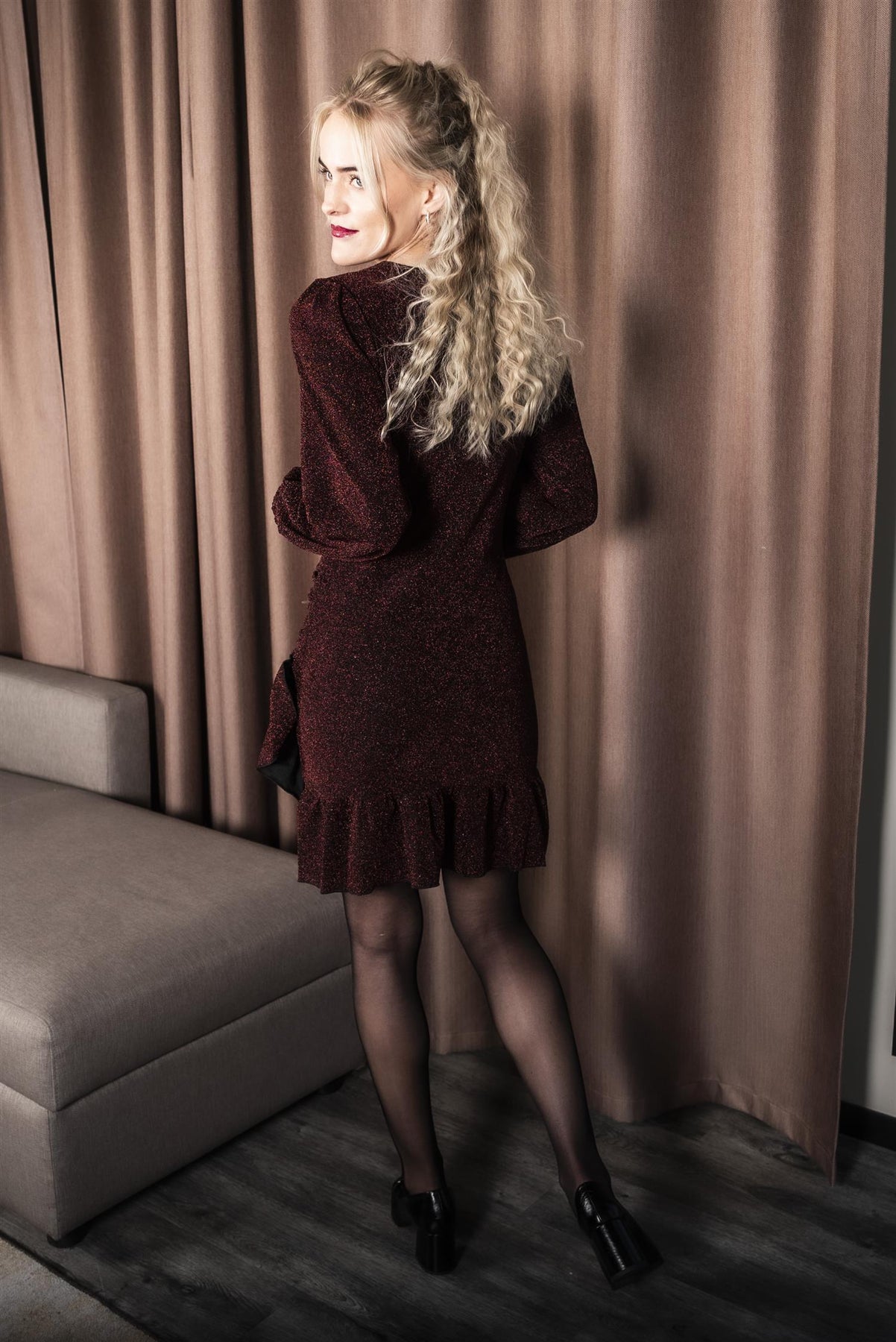 Lekker kjole med metalliske tråder som gir den et glitrende utseende. Den perfekte festkjolen til deg som ønsker en klassisk look med det lille ekstra!