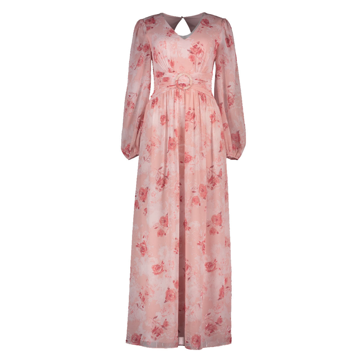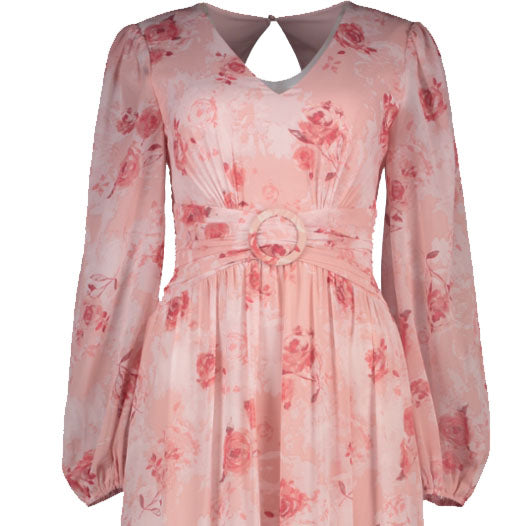 En romantisk og elegant selskapskjole med et luftig og feminint uttrykk. Kjolen har flatterende v-hals og lange, lette ermer med lett volum og elastisk mansjett. Ermene er ufôrede og lett transparente, noe som gir et delikat og svevende preg. Den markerte midjen fremheves av en dekorativ beltedetalj foran, mens smock bak gir en fleksibel og komfortabel passform. Åpen ryggdetalj med knappelukking i nakken setter prikken over i-en.