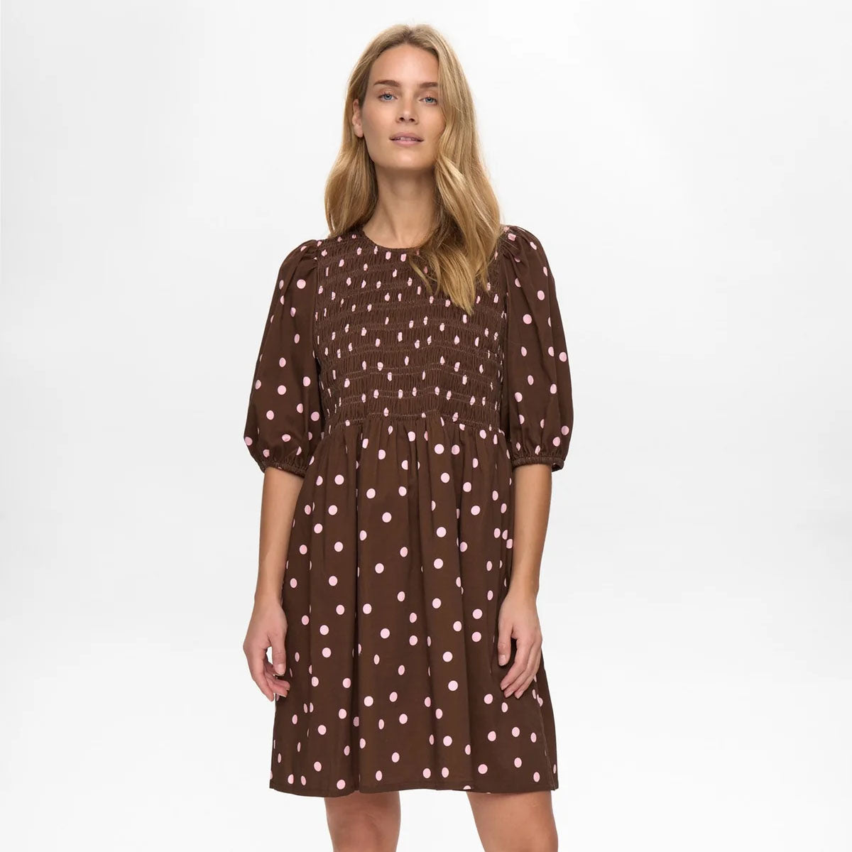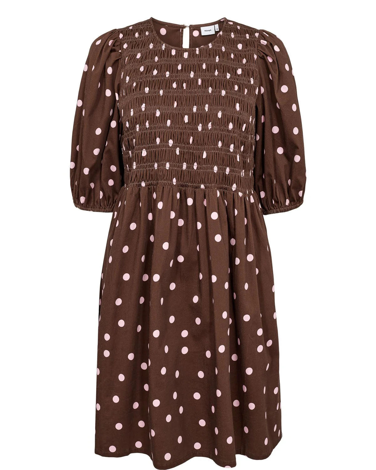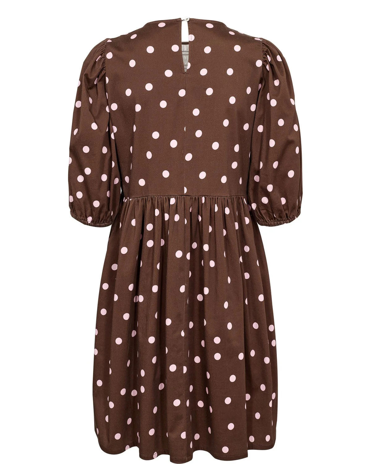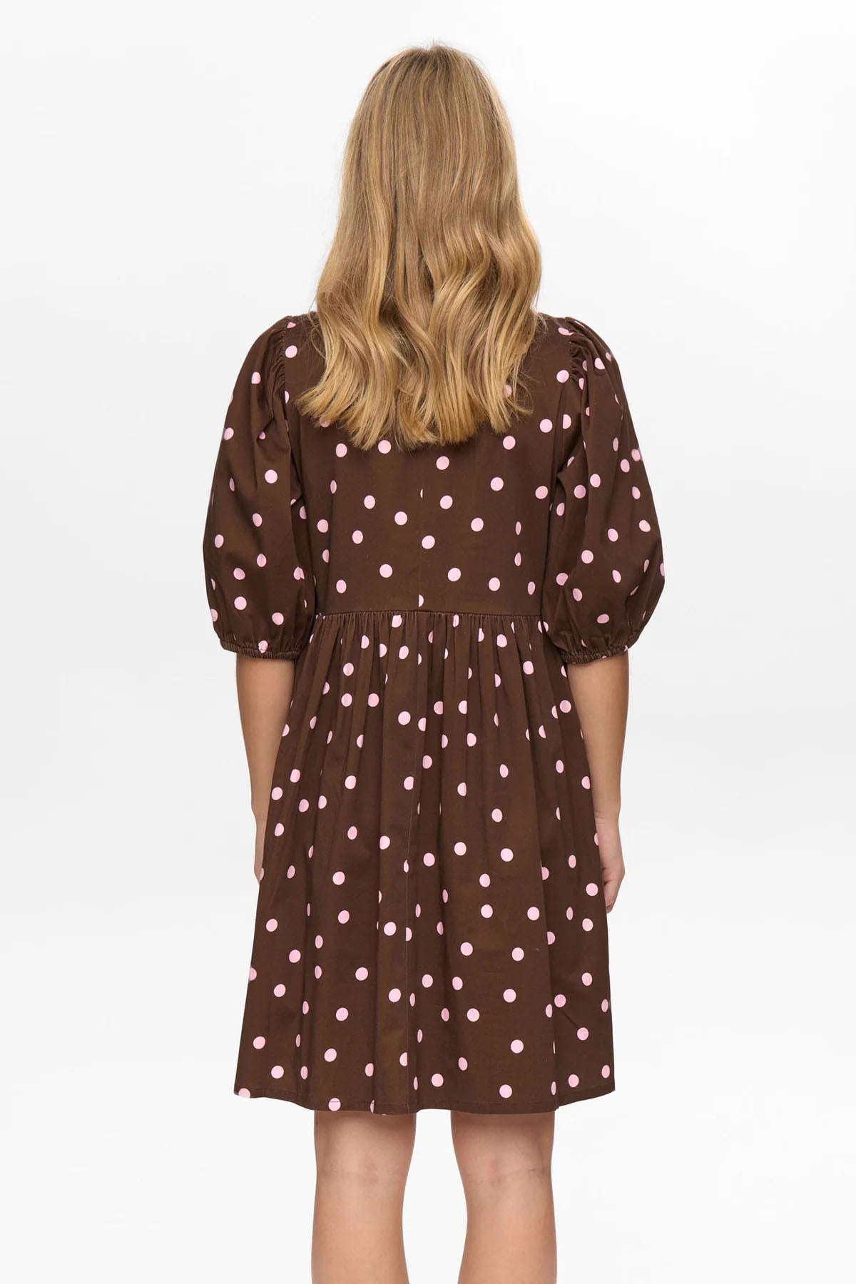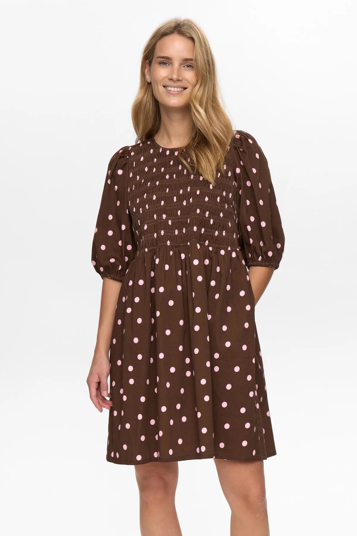 Herlig hverdagskjole i delikat brunt med rosa trendy polka-dotter.