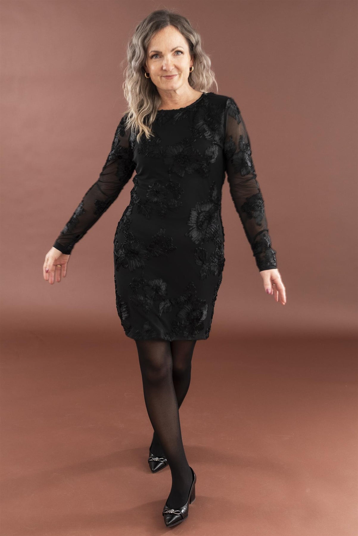 Feminin kjole i delikat mesh, med uthevet blomstermønster. Den har matchende fòr i mykt materiale.