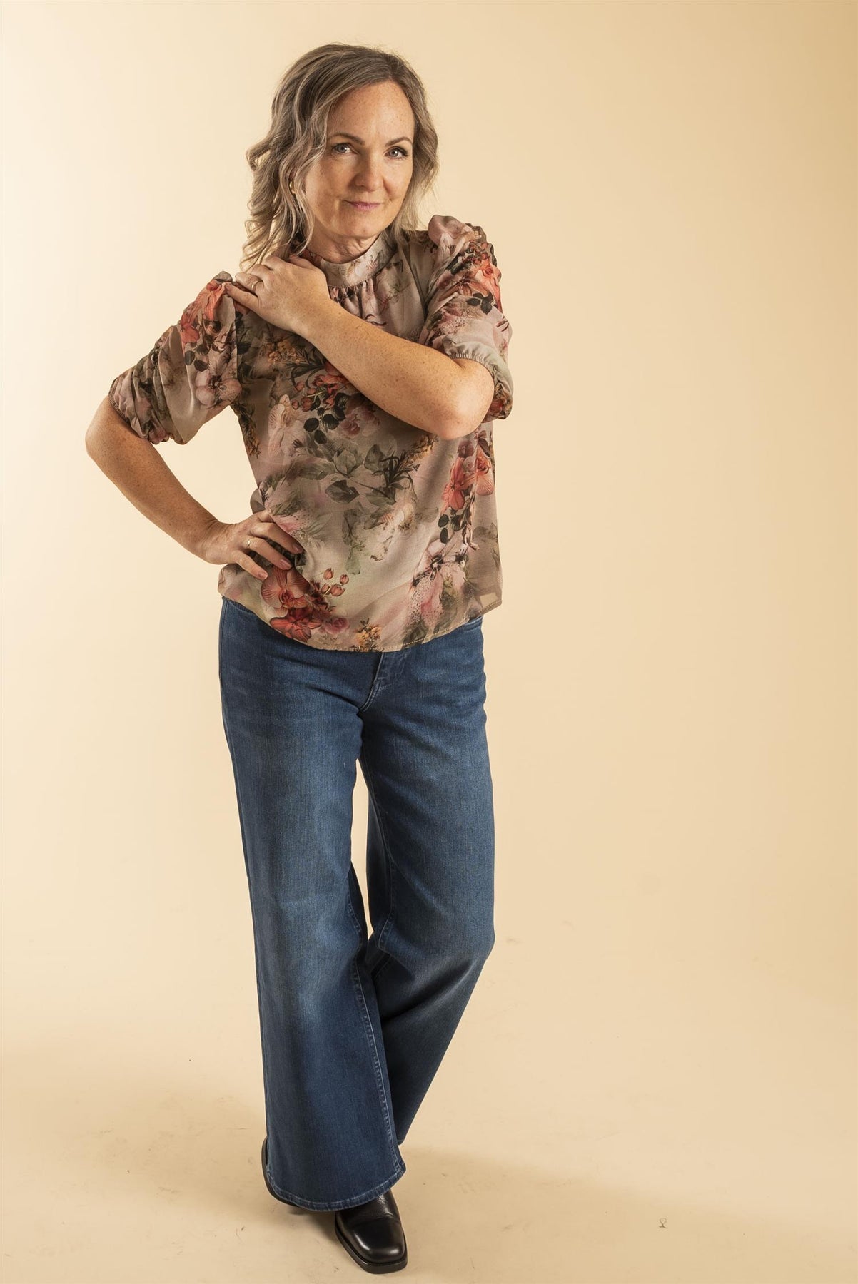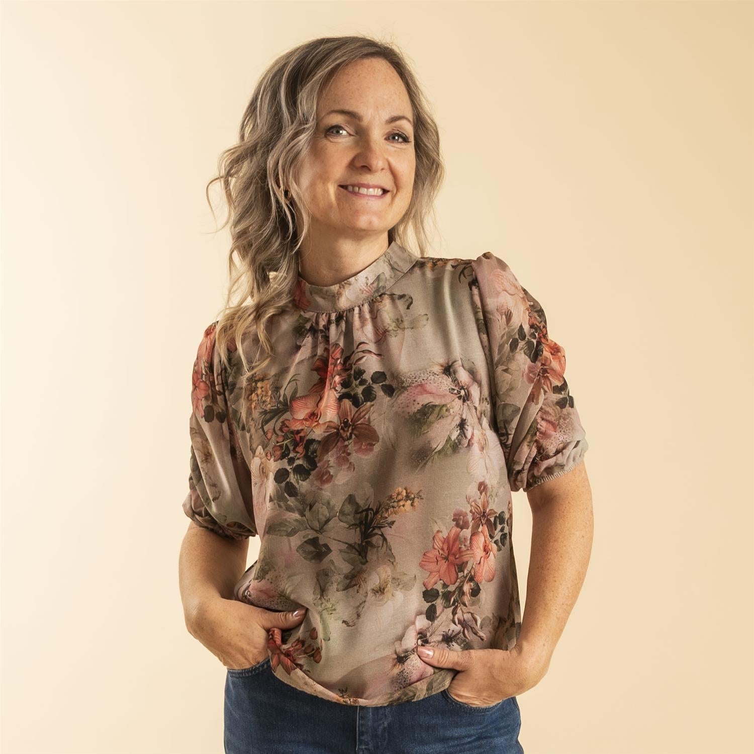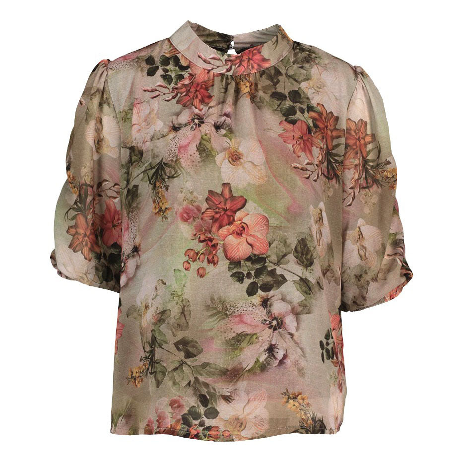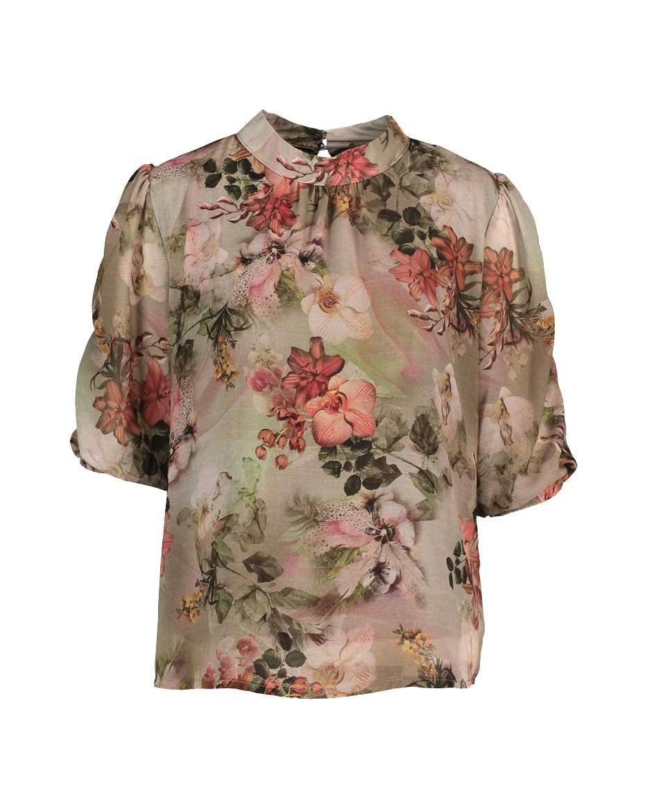Delikat bluse i lett og praktisk strykefri chiffon med blomsterprint. Den har høy hals, 2 knapper i nakken og nøkkelhullsåpning.