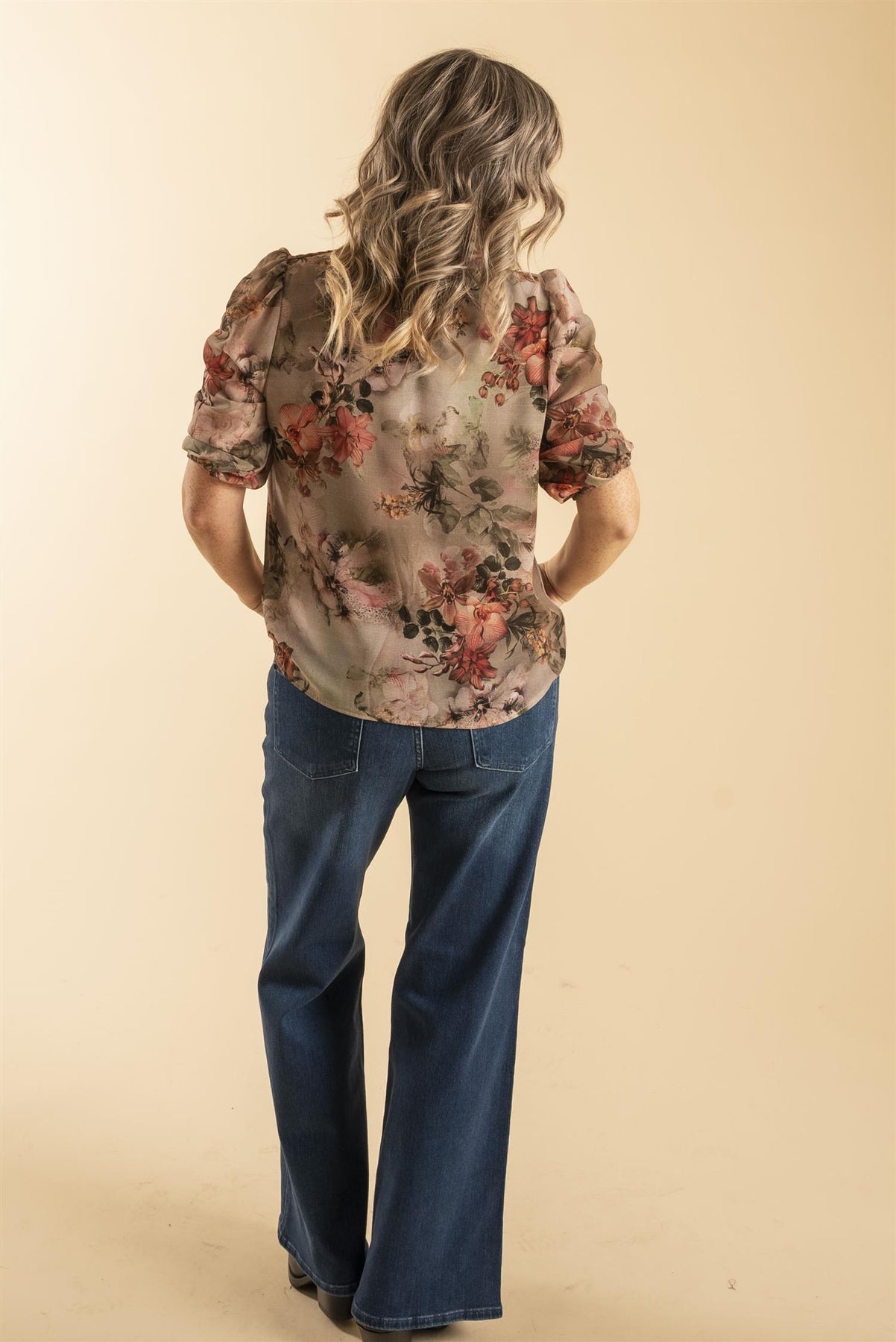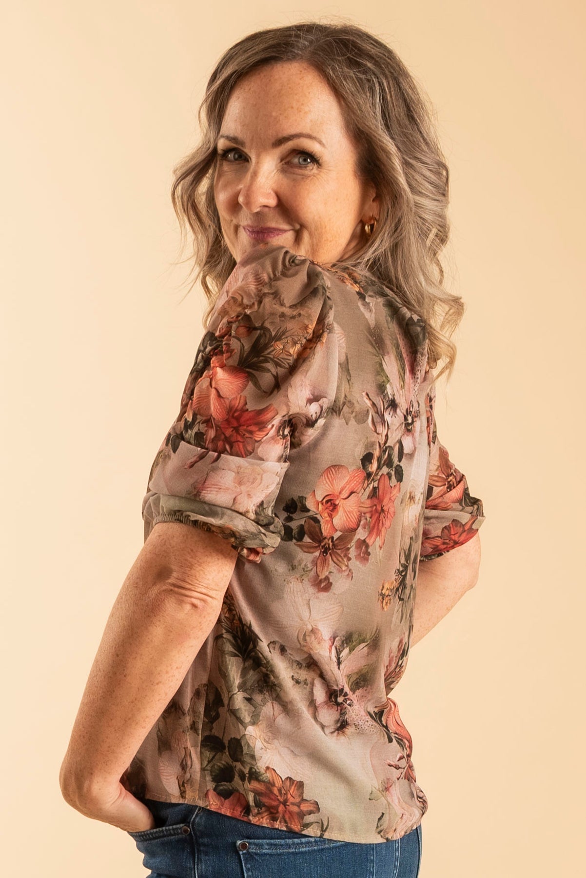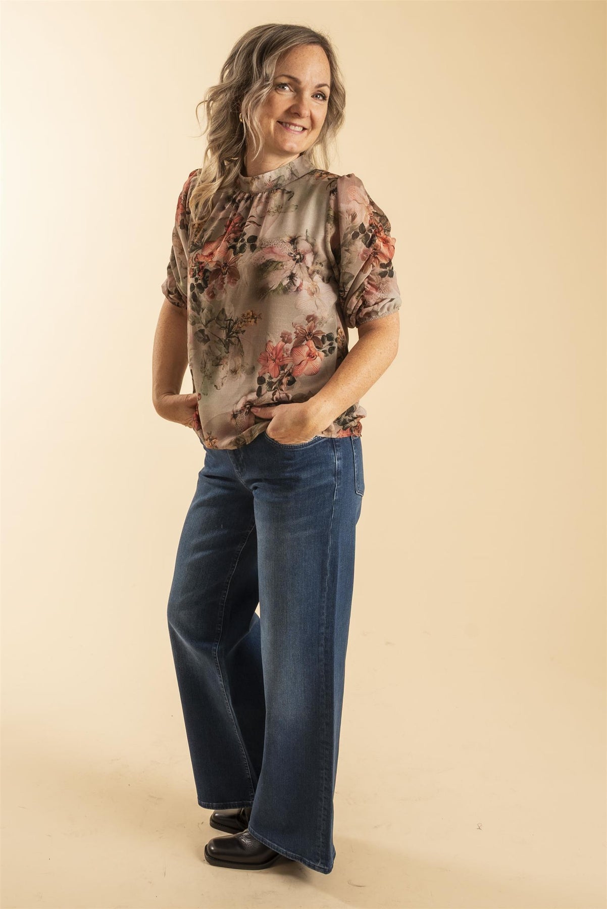 Delikat bluse i lett og praktisk strykefri chiffon med blomsterprint. Den har høy hals, 2 knapper i nakken og nøkkelhullsåpning.
