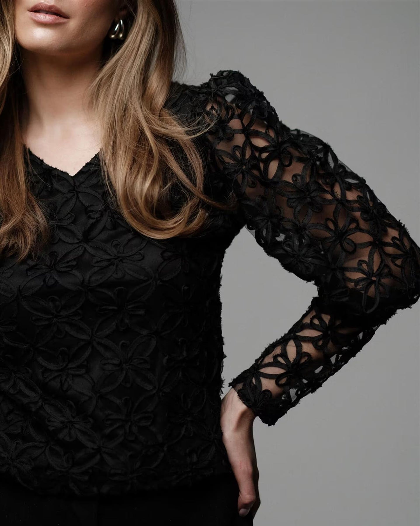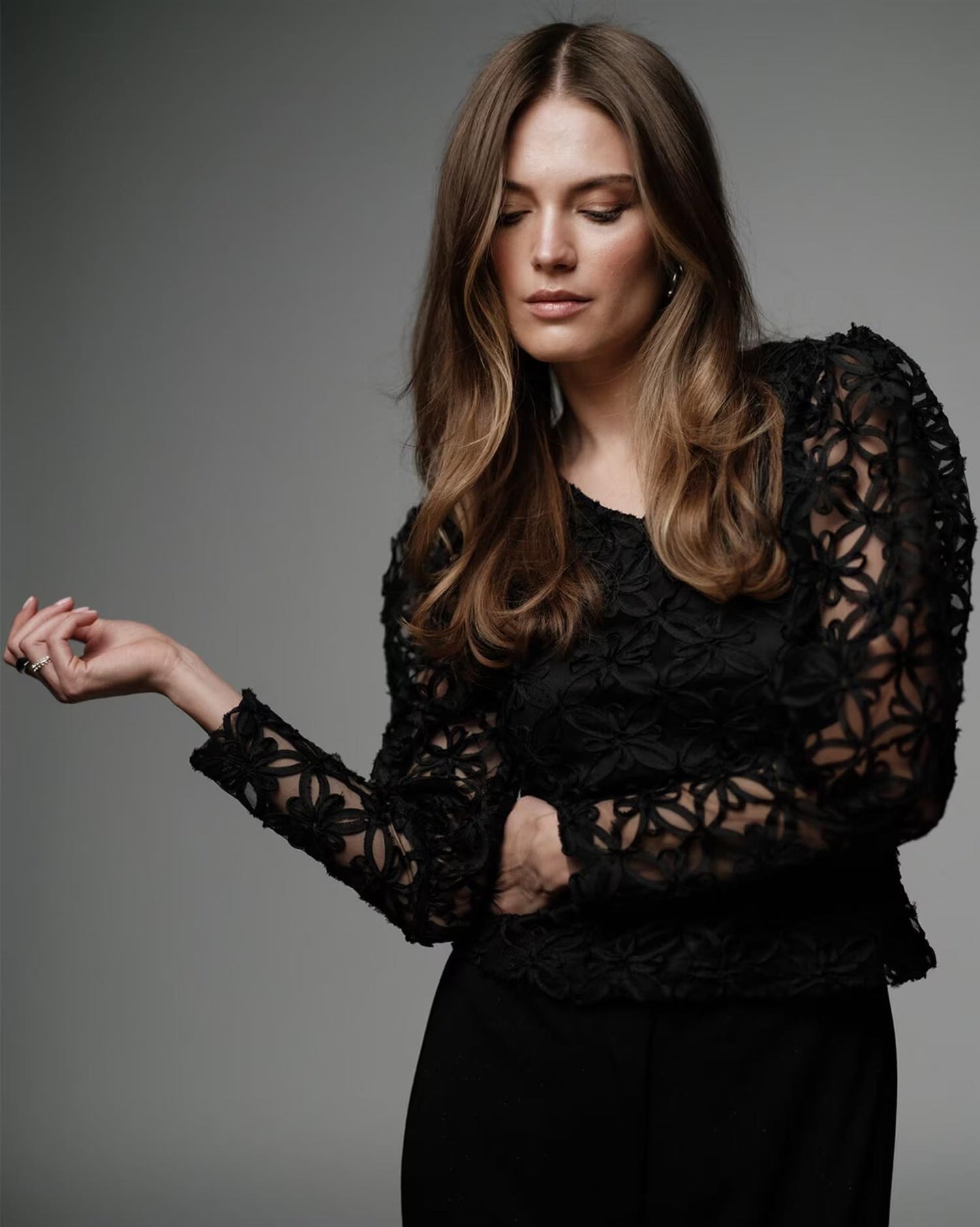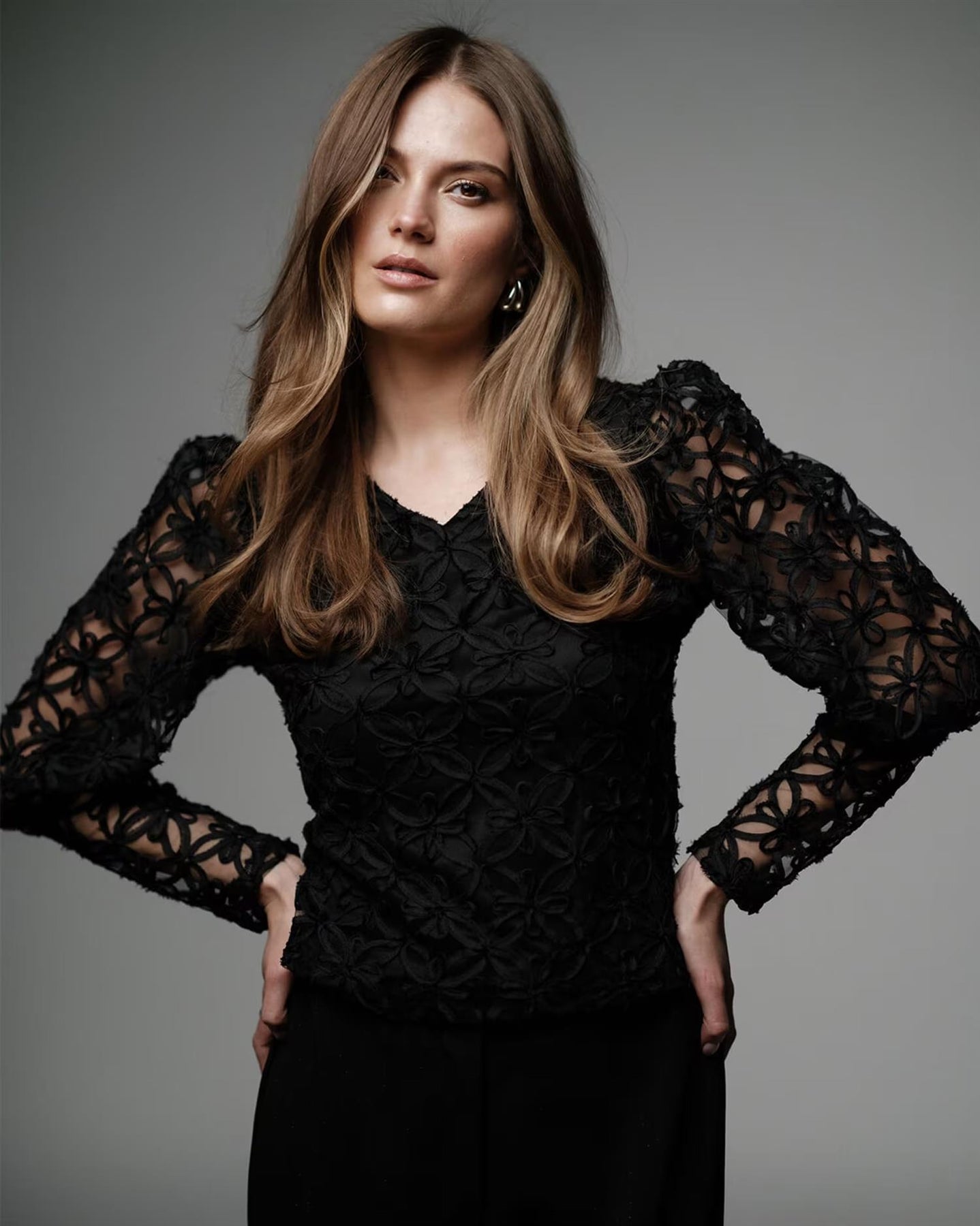 Elegant og feminin topp med nydelige detaljer. Den er laget i et lett, gjennomsiktig materiale med påsydde blomsterformede dekorasjoner som gir et sofistikert og eksklusivt uttrykk. Toppen har et mykt og stretchy fòr i kroppen som gjør den behagelig å ha på, mens ermene er uforet for å fremheve den gjennomsiktige og delikate effekten. Den har V-hals og lange ballongermer med liten puff på skuldrene.