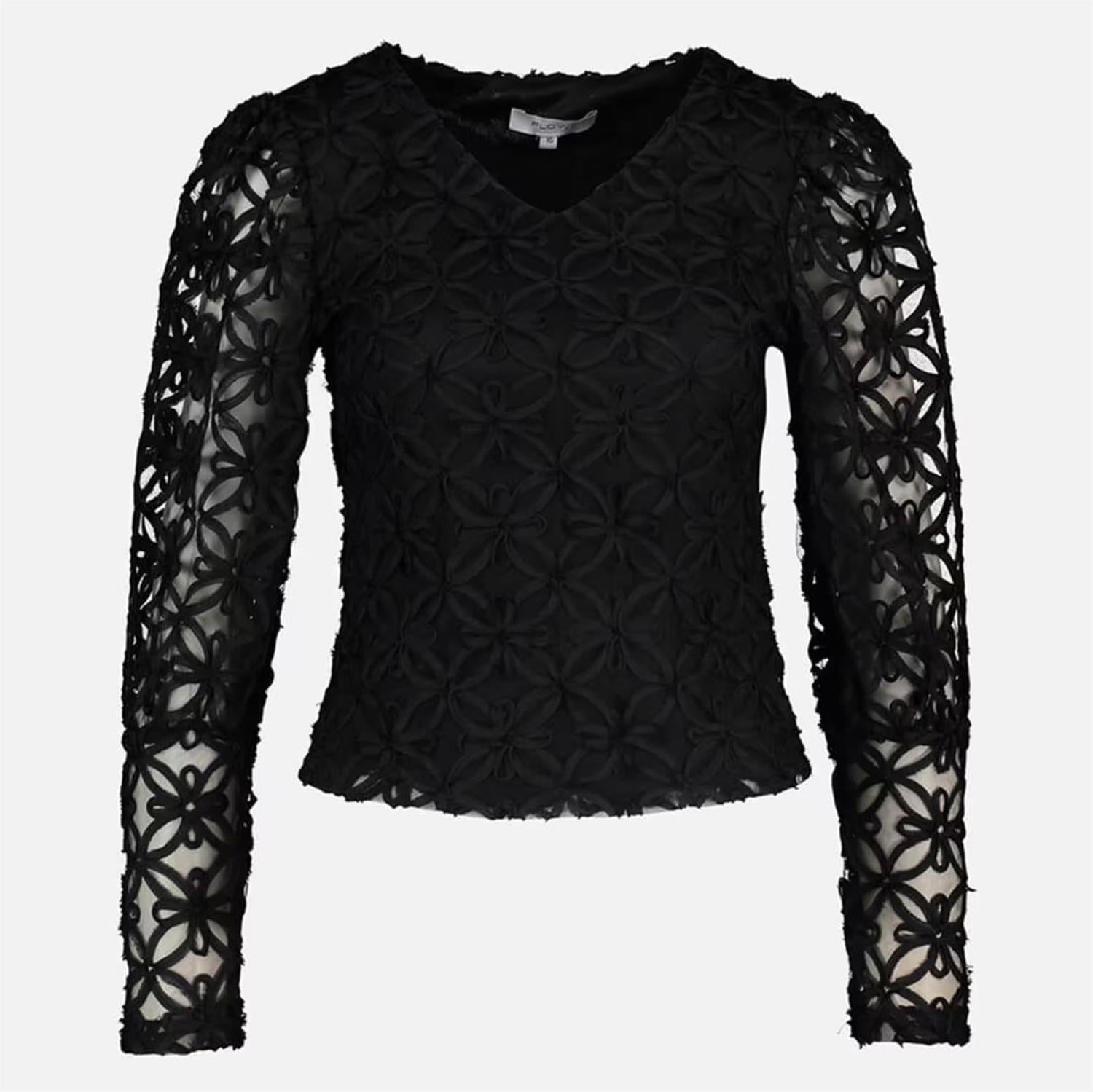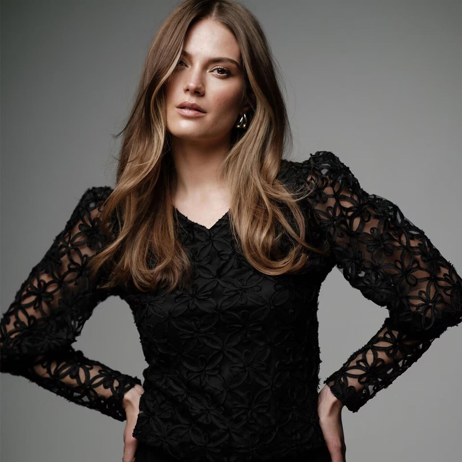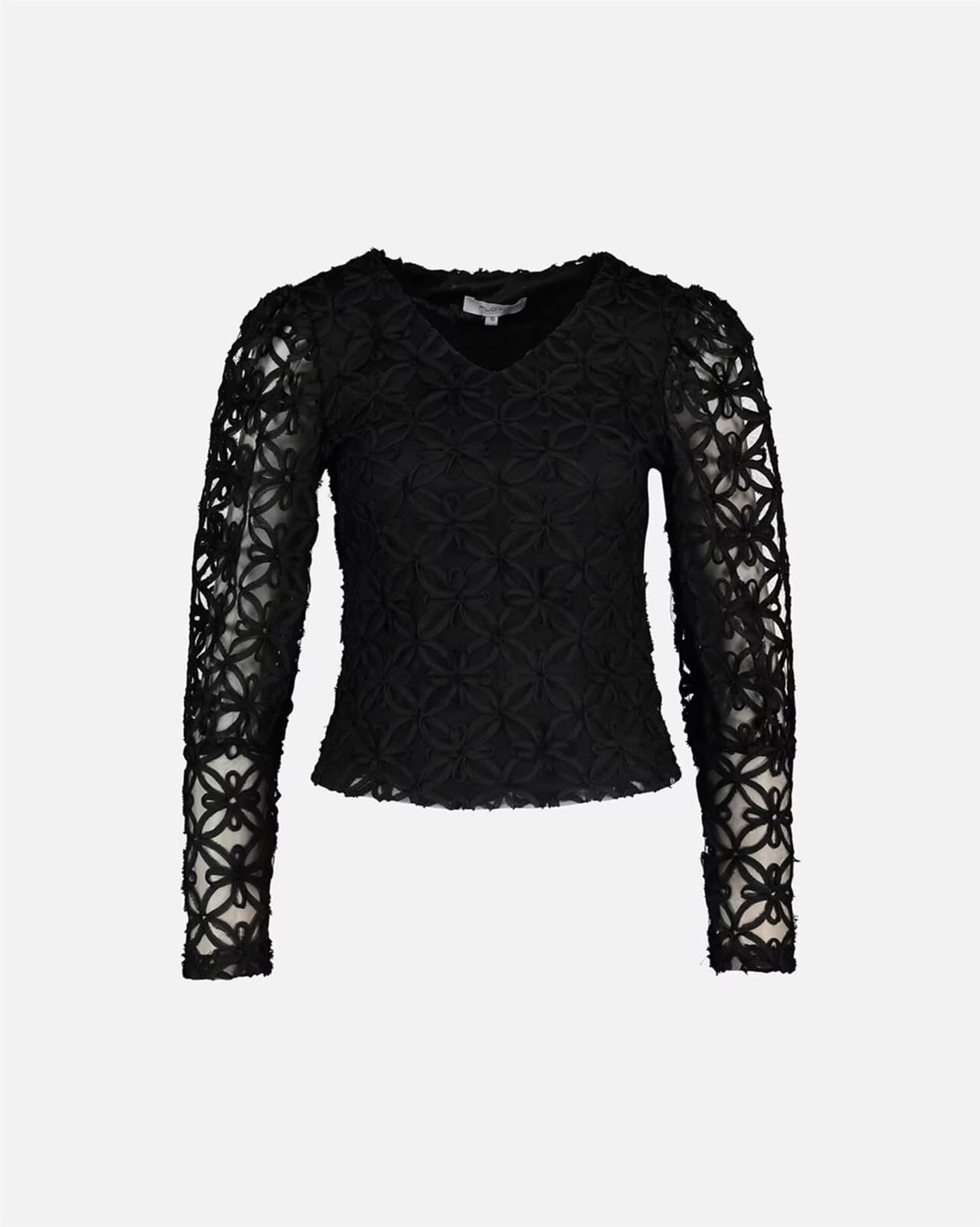 Elegant og feminin topp med nydelige detaljer. Den er laget i et lett, gjennomsiktig materiale med påsydde blomsterformede dekorasjoner som gir et sofistikert og eksklusivt uttrykk. Toppen har et mykt og stretchy fòr i kroppen som gjør den behagelig å ha på, mens ermene er uforet for å fremheve den gjennomsiktige og delikate effekten. Den har V-hals og lange ballongermer med liten puff på skuldrene.