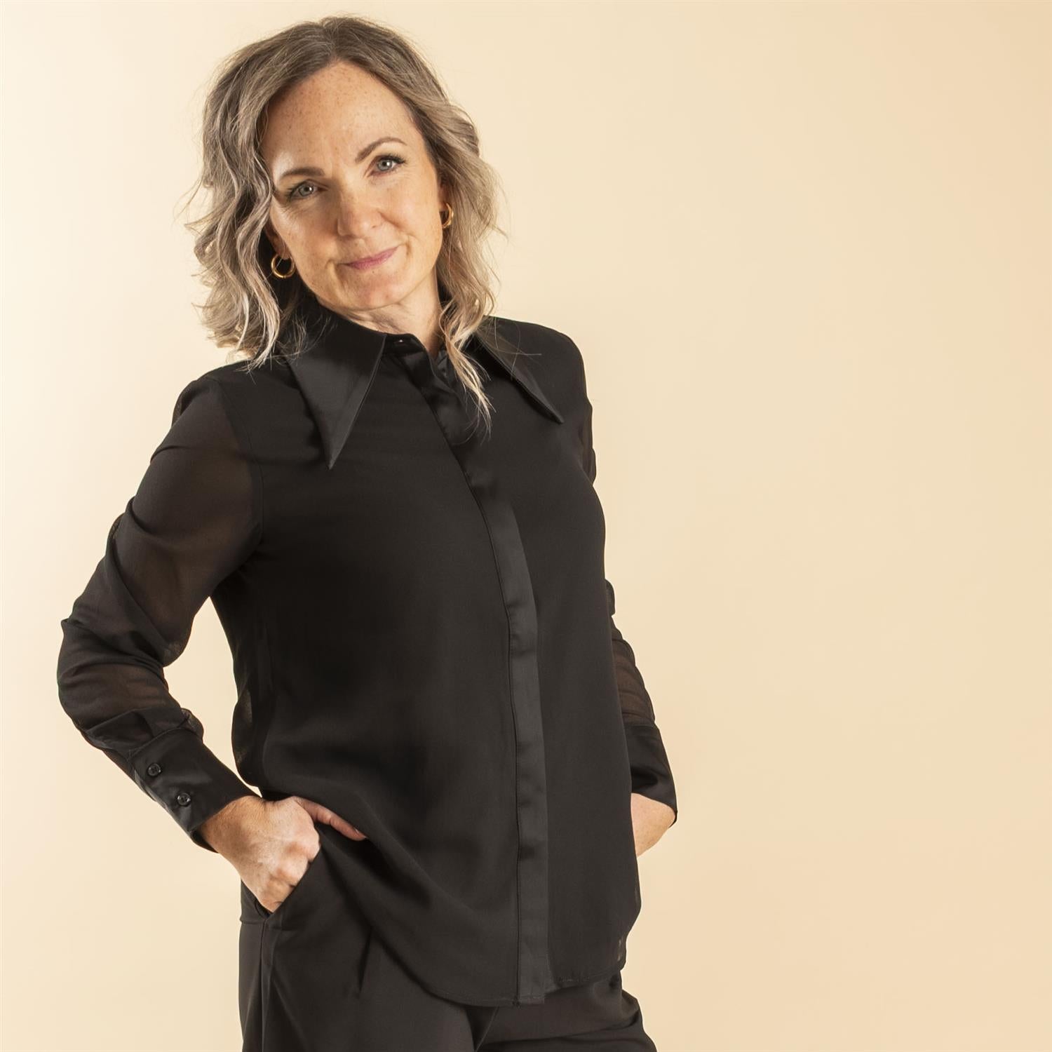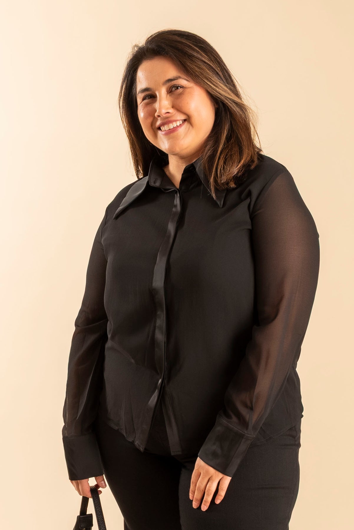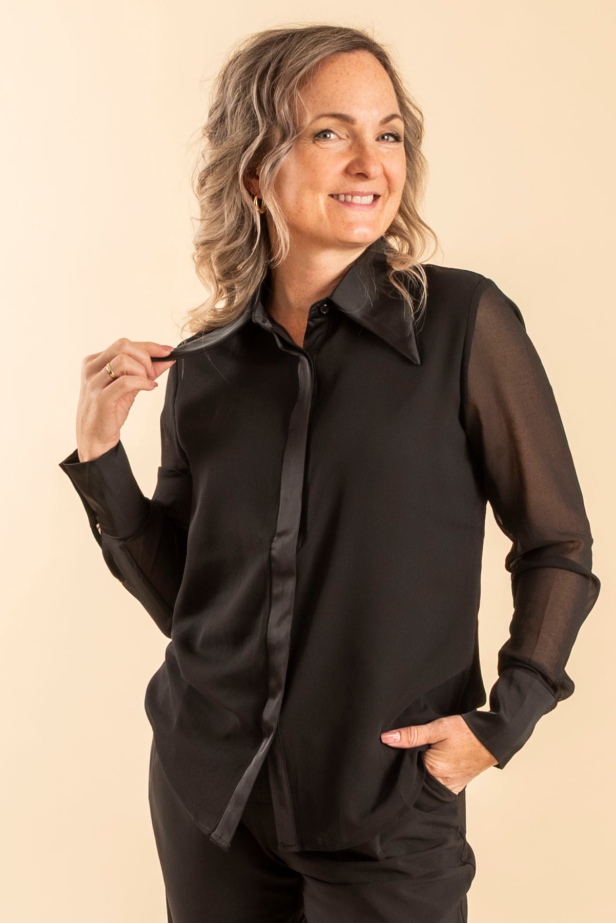 Råkul klassisk skjorte med med gjennombrutt chiffon i selve stoffet, og sateng snipper, knappestolpe og mansjetter som gir en "smoking-look".