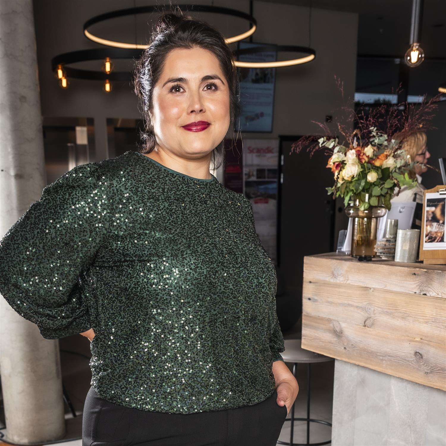 Nydelig paljettopp med rund hals og en knapp i nakken. Den har halvlange ballongermer med legg på skuldrene som skaper en flatterende passform. Tynt fór som føles behagelig mot huden.